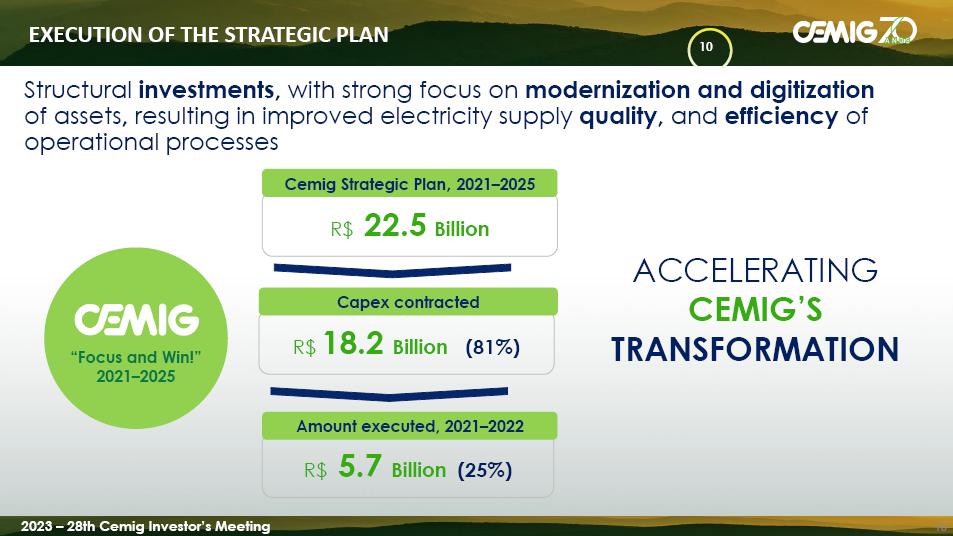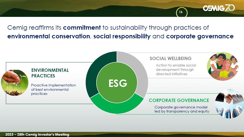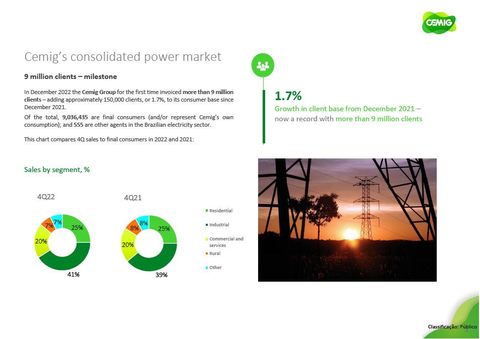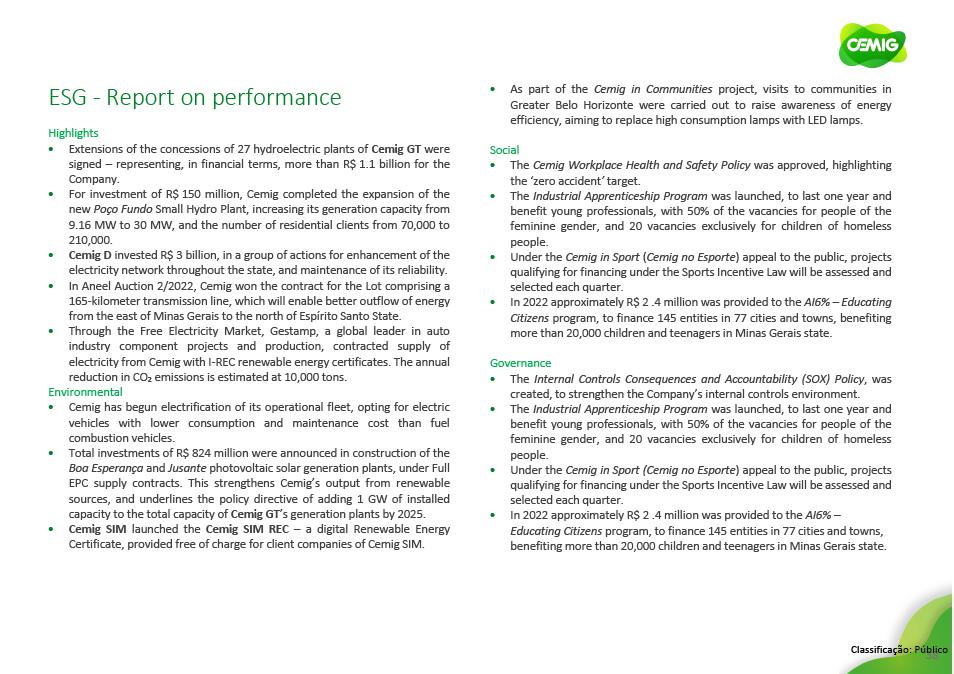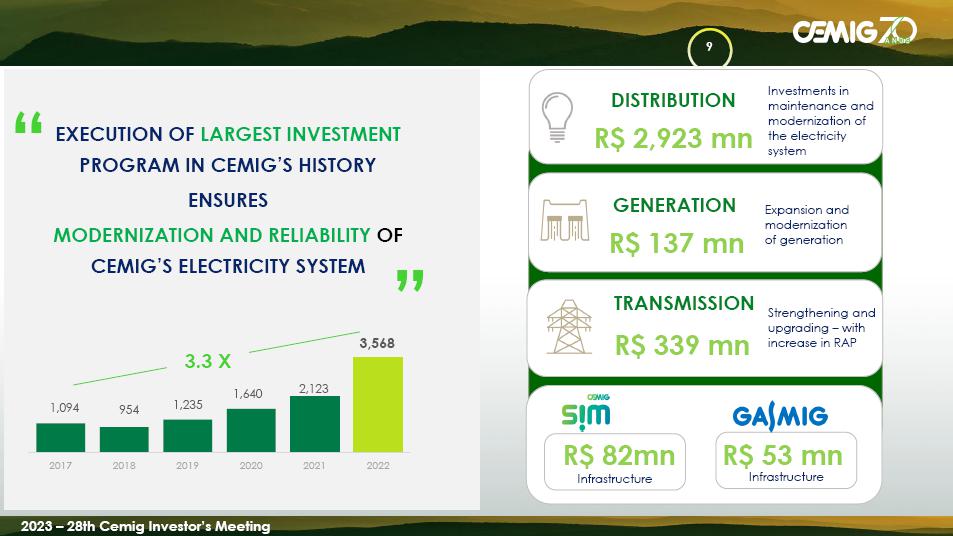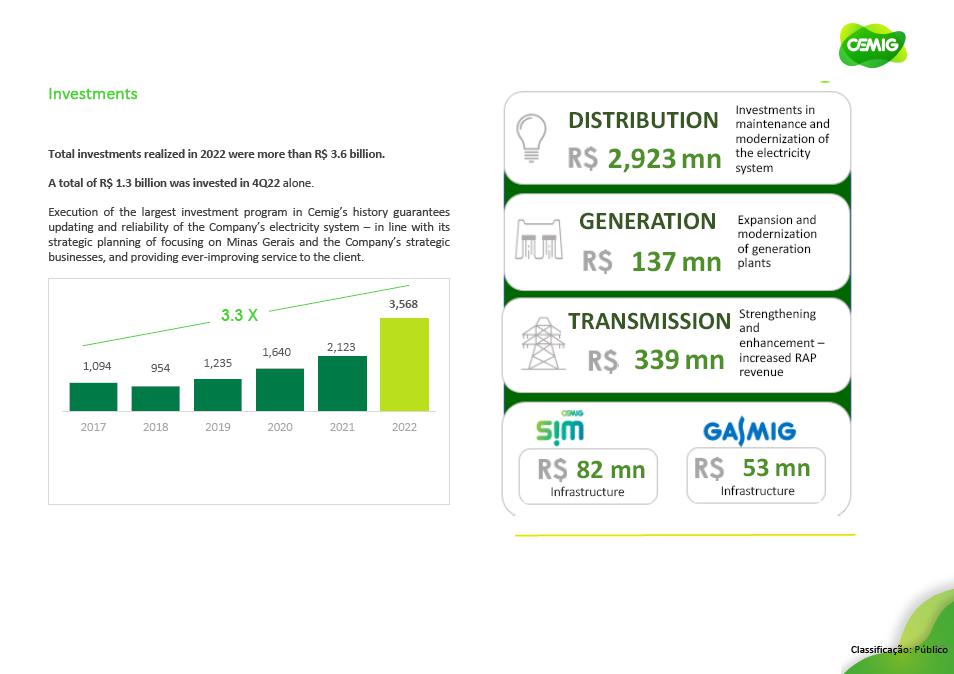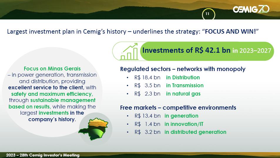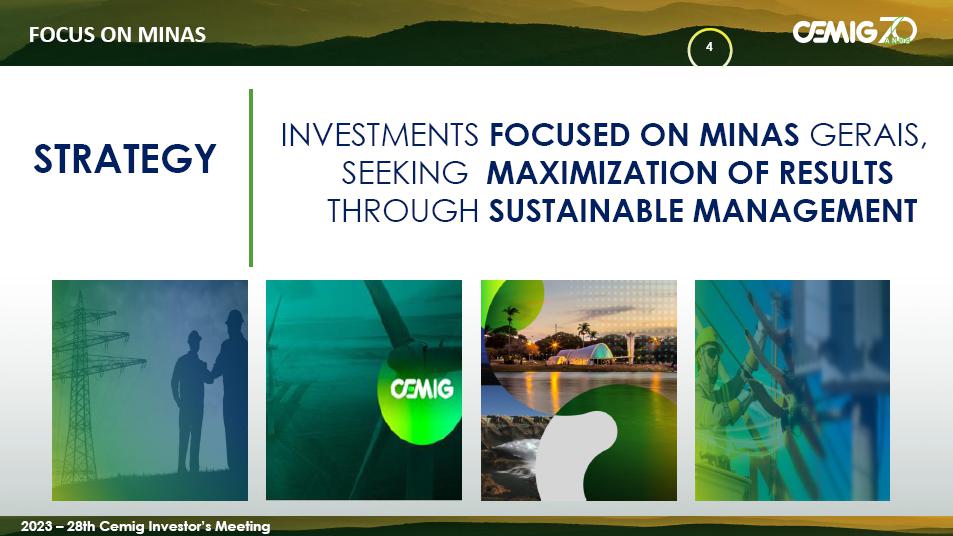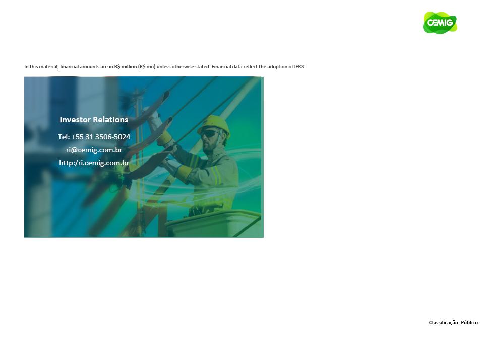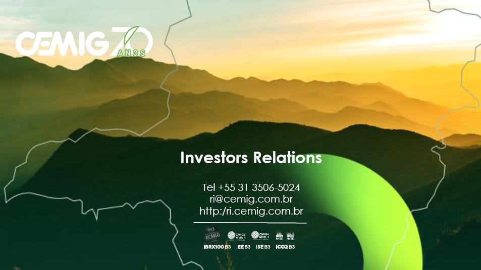 CEMIG reiterates its commitment to focusing on the state of Minas Gerais, mainly engaging in the generation, transmission and distribution of energy, providing excellent services for customers, with safety and maximum efficiency, through sustainable and results-oriented management, making the greatest investment in the Company’s history.
