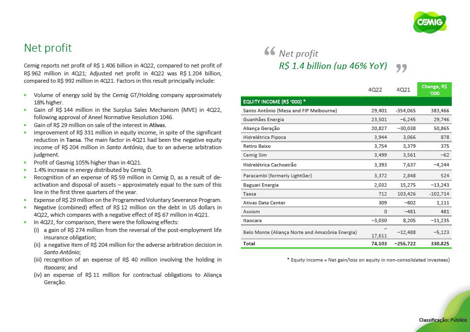 COMPANHIA ENERGÉTICA DE MINAS GERAIS – CEMIG (“CEMIG” or “Company”), a publicly held company with shares traded on the stock exchanges of São Paulo, New York, and Madrid, under CVM Resolution 44/2021, of August 23, 2021, hereby informs the Brazilian Securities and Exchange Commission (CVM), B3 S.A. – Brasil, Bolsa, Balcão (“B3”), and the market in general that CEMIG GERAÇÃO E TRANSMISSÃO S.A. (“Cemig GT”), a publicly held company and the wholly-owned subsidiary of CEMIG, to ensure its right to request a new concession award, under articles 26, 27, 28, and 30 of Federal Law 9.074/1995, and complying with the advance period regulated in article 1 of Federal Decree 9,271/2018, filed, on February 17, 2023, its “Interest” in the extension of the concession of the Sa Carvalho HPP, through the “Transfer of Shareholding Control” to its wholly-owned subsidiary Sa Carvalho S.A.