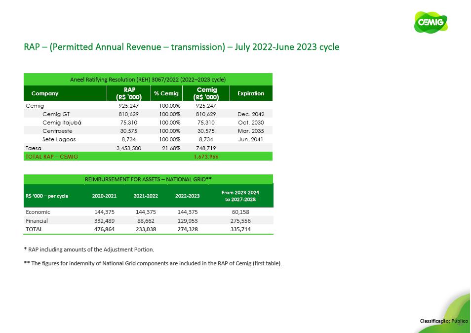 COMPANHIA ENERGÉTICA DE MINAS GERAIS – CEMIG (“CEMIG”), a publicly held company with shares traded on the stock exchanges of São Paulo, New York, and Madrid, and CEMIG GERAÇÃO E TRANSMISSÃO S.A. (“CEMIG GT”), a publicly held company and the wholly-owned subsidiary of CEMIG, hereby inform the Brazilian Securities and Exchange Commission (CVM), B3 S.A. – Brasil, Bolsa, Balcão (“B3”), and the market in general that it published today a notice for a bidding process aiming at the sale of 15 water generation SHPs/HGPs, 12 of which owned by Cemig GT and three by Horizontes Energia S.A., a wholly-owned subsidiary of Cemig GT. The minimum value for the single batch of assets is R$48.2 million, and the bidding process is expected to occur on August 10, 2023.