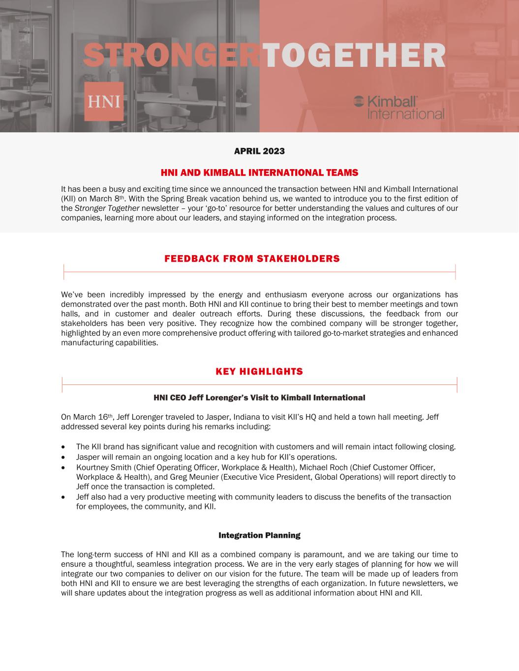 APRIL 2023 HNI AND KIMBALL INTERNATIONAL TEAMS It has been a busy and exciting time since we announced the transaction between HNI and Kimball International (KII) on March 8th. With the Spring Break vacation behind us, we wanted to introduce you to the first edition of the Stronger Together newsletter – your ‘go-to’ resource for better understanding the values and cultures of our companies, learning more about our leaders, and staying informed on the integration process. FEEDBACK FROM STAKEHOLDERSON We’ve been incredibly impressed by the energy and enthusiasm everyone across our organizations has demonstrated over the past month. Both HNI and KII continue to bring their best to member meetings and town halls, and in customer and dealer outreach efforts. During these discussions, the feedback from our stakeholders has been very positive. They recognize how the combined company will be stronger together, highlighted by an even more comprehensive product offering with tailored go-to-market strategies and enhanced manufacturing capabilities. KEY HIGHLIGHTS HNI CEO Jeff Lorenger’s Visit to Kimball International On March 16th, Jeff Lorenger traveled to Jasper, Indiana to visit KII’s HQ and held a town hall meeting. Jeff addressed several key points during his remarks including: • The KII brand has significant value and recognition with customers and will remain intact following closing. • Jasper will remain an ongoing location and a key hub for KII’s operations. • Kourtney Smith (Chief Operating Officer, Workplace & Health), Michael Roch (Chief Customer Officer, Workplace & Health), and Greg Meunier (Executive Vice President, Global Operations) will report directly to Jeff once the transaction is completed. • Jeff also had a very productive meeting with community leaders to discuss the benefits of the transaction for employees, the community, and KII. Integration Planning The long-term success of HNI and KII as a combined company is paramount, and we are taking our time to ensure a thoughtful, seamless integration process. We are in the very early stages of planning for how we will integrate our two companies to deliver on our vision for the future. The team will be made up of leaders from both HNI and KII to ensure we are best leveraging the strengths of each organization. In future newsletters, we will share updates about the integration progress as well as additional information about HNI and KII.