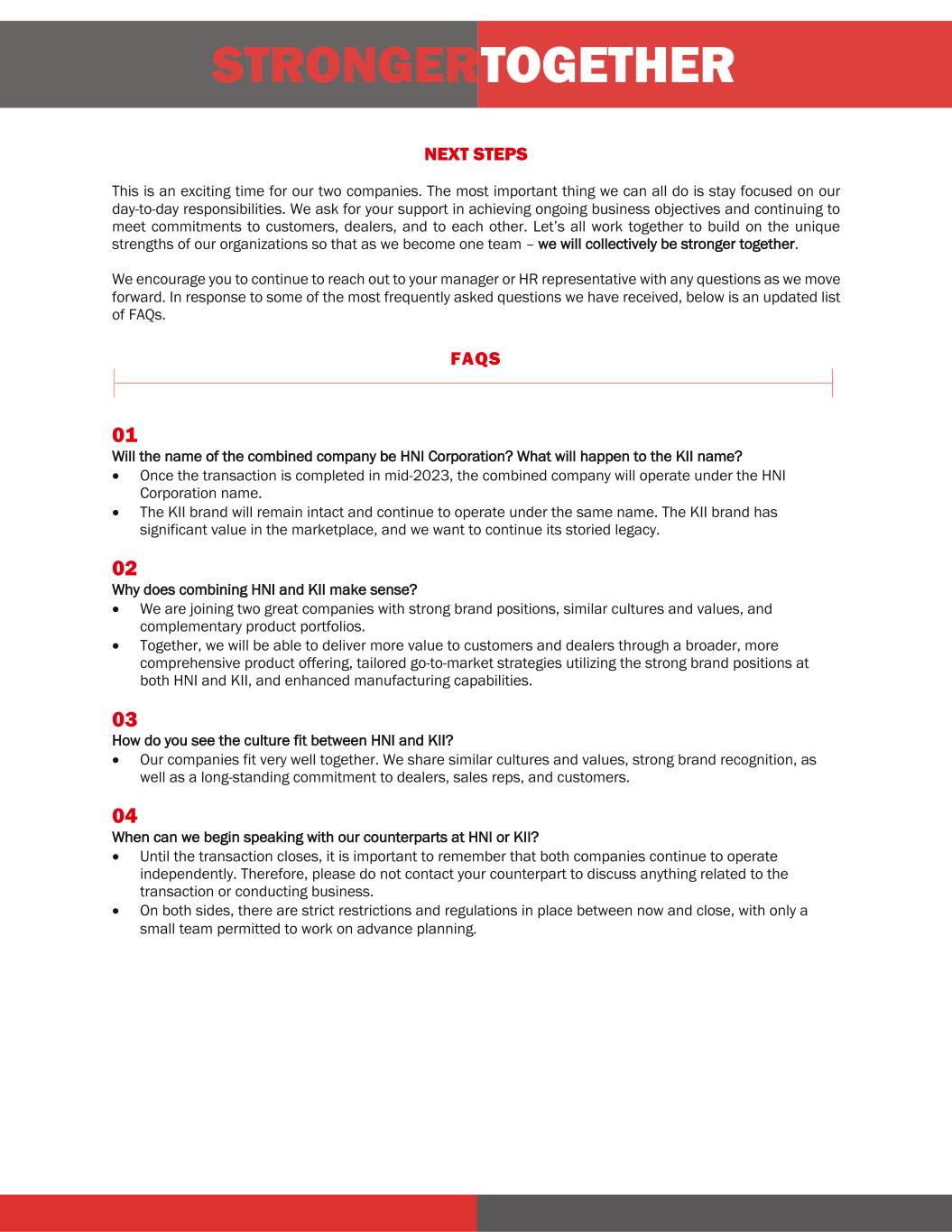 NEXT STEPS This is an exciting time for our two companies. The most important thing we can all do is stay focused on our day-to-day responsibilities. We ask for your support in achieving ongoing business objectives and continuing to meet commitments to customers, dealers, and to each other. Let’s all work together to build on the unique strengths of our organizations so that as we become one team – we will collectively be stronger together. We encourage you to continue to reach out to your manager or HR representative with any questions as we move forward. In response to some of the most frequently asked questions we have received, below is an updated list of FAQs. FAQS 01: Will the name of the combined company be HNI Corporation? What will happen to the KII name? • Once the transaction is completed in mid-2023, the combined company will operate under the HNI Corporation name. • The KII brand will remain intact and continue to operate under the same name. The KII brand has significant value in the marketplace, and we want to continue its storied legacy. 02: Why does combining HNI and KII make sense? • We are joining two great companies with strong brand positions, similar cultures and values, and complementary product portfolios. • Together, we will be able to deliver more value to customers and dealers through a broader, more comprehensive product offering, tailored go-to-market strategies utilizing the strong brand positions at both HNI and KII, and enhanced manufacturing capabilities. 03: How do you see the culture fit between HNI and KII? • Our companies fit very well together. We share similar cultures and values, strong brand recognition, as well as a long-standing commitment to dealers, sales reps, and customers. 04: When can we begin speaking with our counterparts at HNI or KII? • Until the transaction closes, it is important to remember that both companies continue to operate independently. Therefore, please do not contact your counterpart to discuss anything related to the transaction or conducting business. • On both sides, there are strict restrictions and regulations in place between now and close, with only a small team permitted to work on advance planning