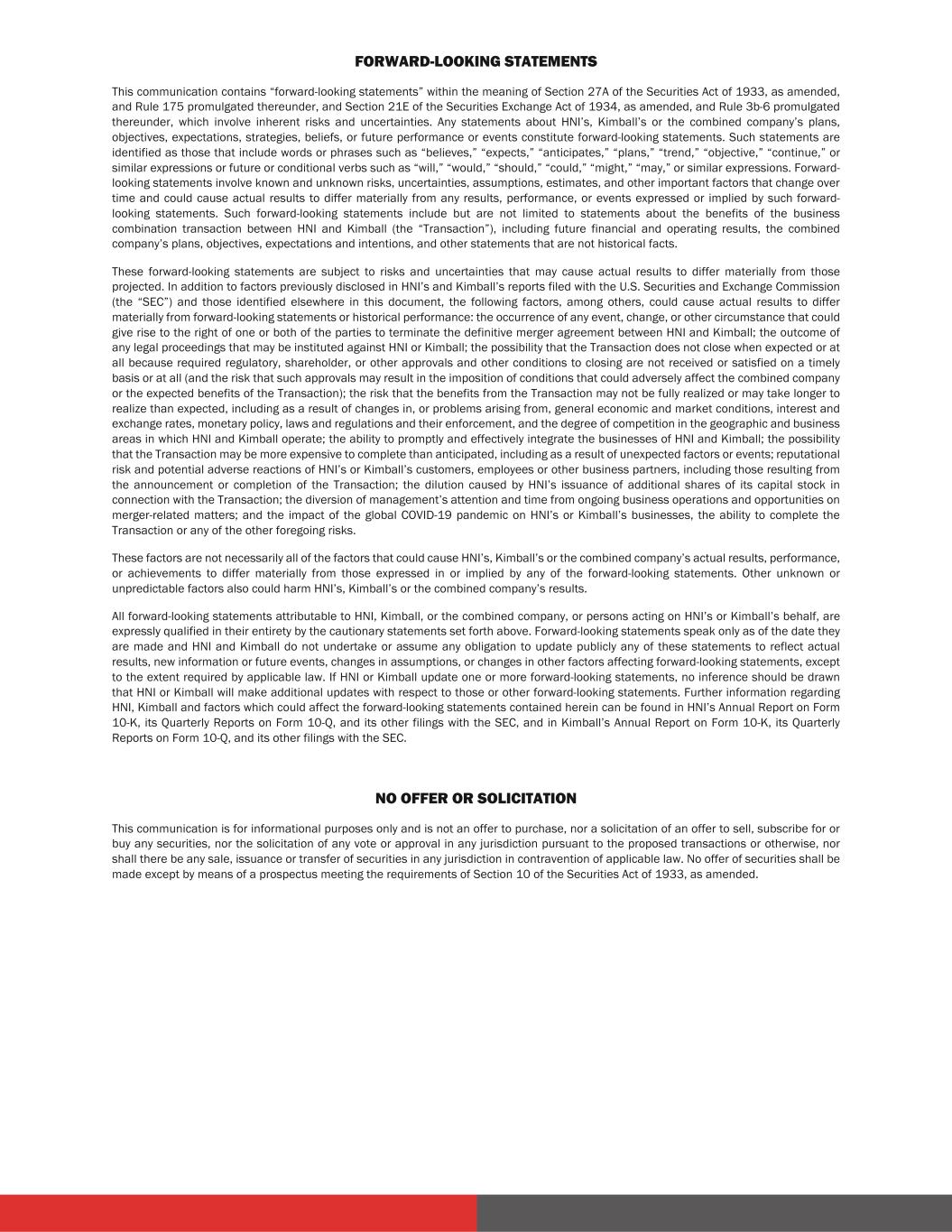 FORWARD-LOOKING STATEMENTS This communication contains “forward-looking statements” within the meaning of Section 27A of the Securities Act of 1933, as amended, and Rule 175 promulgated thereunder, and Section 21E of the Securities Exchange Act of 1934, as amended, and Rule 3b-6 promulgated thereunder, which involve inherent risks and uncertainties. Any statements about HNI’s, Kimball’s or the combined company’s plans, objectives, expectations, strategies, beliefs, or future performance or events constitute forward-looking statements. Such statements are identified as those that include words or phrases such as “believes,” “expects,” “anticipates,” “plans,” “trend,” “objective,” “continue,” or similar expressions or future or conditional verbs such as “will,” “would,” “should,” “could,” “might,” “may,” or similar expressions. Forward- looking statements involve known and unknown risks, uncertainties, assumptions, estimates, and other important factors that change over time and could cause actual results to differ materially from any results, performance, or events expressed or implied by such forward- looking statements. Such forward-looking statements include but are not limited to statements about the benefits of the business combination transaction between HNI and Kimball (the “Transaction”), including future financial and operating results, the combined company’s plans, objectives, expectations and intentions, and other statements that are not historical facts. These forward-looking statements are subject to risks and uncertainties that may cause actual results to differ materially from those projected. In addition to factors previously disclosed in HNI’s and Kimball’s reports filed with the U.S. Securities and Exchange Commission (the “SEC”) and those identified elsewhere in this document, the following factors, among others, could cause actual results to differ materially from forward-looking statements or historical performance: the occurrence of any event, change, or other circumstance that could give rise to the right of one or both of the parties to terminate the definitive merger agreement between HNI and Kimball; the outcome of any legal proceedings that may be instituted against HNI or Kimball; the possibility that the Transaction does not close when expected or at all because required regulatory, shareholder, or other approvals and other conditions to closing are not received or satisfied on a timely basis or at all (and the risk that such approvals may result in the imposition of conditions that could adversely affect the combined company or the expected benefits of the Transaction); the risk that the benefits from the Transaction may not be fully realized or may take longer to realize than expected, including as a result of changes in, or problems arising from, general economic and market conditions, interest and exchange rates, monetary policy, laws and regulations and their enforcement, and the degree of competition in the geographic and business areas in which HNI and Kimball operate; the ability to promptly and effectively integrate the businesses of HNI and Kimball; the possibility that the Transaction may be more expensive to complete than anticipated, including as a result of unexpected factors or events; reputational risk and potential adverse reactions of HNI’s or Kimball’s customers, employees or other business partners, including those resulting from the announcement or completion of the Transaction; the dilution caused by HNI’s issuance of additional shares of its capital stock in connection with the Transaction; the diversion of management’s attention and time from ongoing business operations and opportunities on merger-related matters; and the impact of the global COVID-19 pandemic on HNI’s or Kimball’s businesses, the ability to complete the Transaction or any of the other foregoing risks. These factors are not necessarily all of the factors that could cause HNI’s, Kimball’s or the combined company’s actual results, performance, or achievements to differ materially from those expressed in or implied by any of the forward-looking statements. Other unknown or unpredictable factors also could harm HNI’s, Kimball’s or the combined company’s results. All forward-looking statements attributable to HNI, Kimball, or the combined company, or persons acting on HNI’s or Kimball’s behalf, are expressly qualified in their entirety by the cautionary statements set forth above. Forward-looking statements speak only as of the date they are made and HNI and Kimball do not undertake or assume any obligation to update publicly any of these statements to reflect actual results, new information or future events, changes in assumptions, or changes in other factors affecting forward-looking statements, except to the extent required by applicable law. If HNI or Kimball update one or more forward-looking statements, no inference should be drawn that HNI or Kimball will make additional updates with respect to those or other forward-looking statements. Further information regarding HNI, Kimball and factors which could affect the forward-looking statements contained herein can be found in HNI’s Annual Report on Form 10-K, its Quarterly Reports on Form 10-Q, and its other filings with the SEC, and in Kimball’s Annual Report on Form 10-K, its Quarterly Reports on Form 10-Q, and its other filings with the SEC. NO OFFER OR SOLICITATION This communication is for informational purposes only and is not an offer to purchase, nor a solicitation of an offer to sell, subscribe for or buy any securities, nor the solicitation of any vote or approval in any jurisdiction pursuant to the proposed transactions or otherwise, nor shall there be any sale, issuance or transfer of securities in any jurisdiction in contravention of applicable law. No offer of securities shall be made except by means o