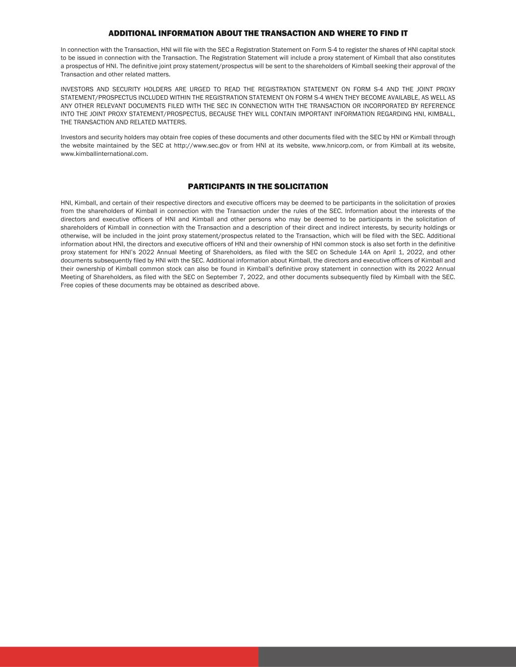ADDITIONAL INFORMATION ABOUT THE TRANSACTION AND WHERE TO FIND IT In connection with the Transaction, HNI will file with the SEC a Registration Statement on Form S-4 to register the shares of HNI capital stock to be issued in connection with the Transaction. The Registration Statement will include a proxy statement of Kimball that also constitutes a prospectus of HNI. The definitive joint proxy statement/prospectus will be sent to the shareholders of Kimball seeking their approval of the Transaction and other related matters. INVESTORS AND SECURITY HOLDERS ARE URGED TO READ THE REGISTRATION STATEMENT ON FORM S-4 AND THE JOINT PROXY STATEMENT/PROSPECTUS INCLUDED WITHIN THE REGISTRATION STATEMENT ON FORM S-4 WHEN THEY BECOME AVAILABLE, AS WELL AS ANY OTHER RELEVANT DOCUMENTS FILED WITH THE SEC IN CONNECTION WITH THE TRANSACTION OR INCORPORATED BY REFERENCE INTO THE JOINT PROXY STATEMENT/PROSPECTUS, BECAUSE THEY WILL CONTAIN IMPORTANT INFORMATION REGARDING HNI, KIMBALL, THE TRANSACTION AND RELATED MATTERS. Investors and security holders may obtain free copies of these documents and other documents filed with the SEC by HNI or Kimball through the website maintained by the SEC at http://www.sec.gov or from HNI at its website, www.hnicorp.com, or from Kimball at its website, www.kimballinternational.com. PARTICIPANTS IN THE SOLICITATION HNI, Kimball, and certain of their respective directors and executive officers may be deemed to be participants in the solicitation of proxies from the shareholders of Kimball in connection with the Transaction under the rules of the SEC. Information about the interests of the directors and executive officers of HNI and Kimball and other persons who may be deemed to be participants in the solicitation of shareholders of Kimball in connection with the Transaction and a description of their direct and indirect interests, by security holdings or otherwise, will be included in the joint proxy statement/prospectus related to the Transaction, which will be filed with the SEC. Additional information about HNI, the directors and executive officers of HNI and their ownership of HNI common stock is also set forth in the definitive proxy statement for HNI’s 2022 Annual Meeting of Shareholders, as filed with the SEC on Schedule 14A on April 1, 2022, and other documents subsequently filed by HNI with the SEC. Additional information about Kimball, the directors and executive officers of Kimball and their ownership of Kimball common stock can also be found in Kimball’s definitive proxy statement in connection with its 2022 Annual Meeting of Shareholders, as filed with the SEC on September 7, 2022, and other documents subsequently filed by Kimball with the SEC. Free copies of these documents may be obtained as described above.