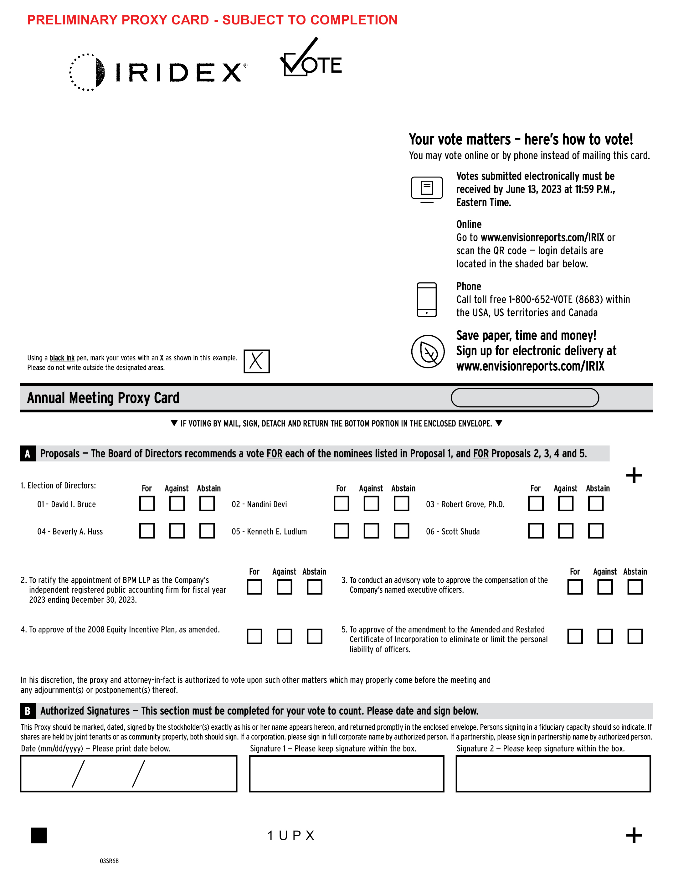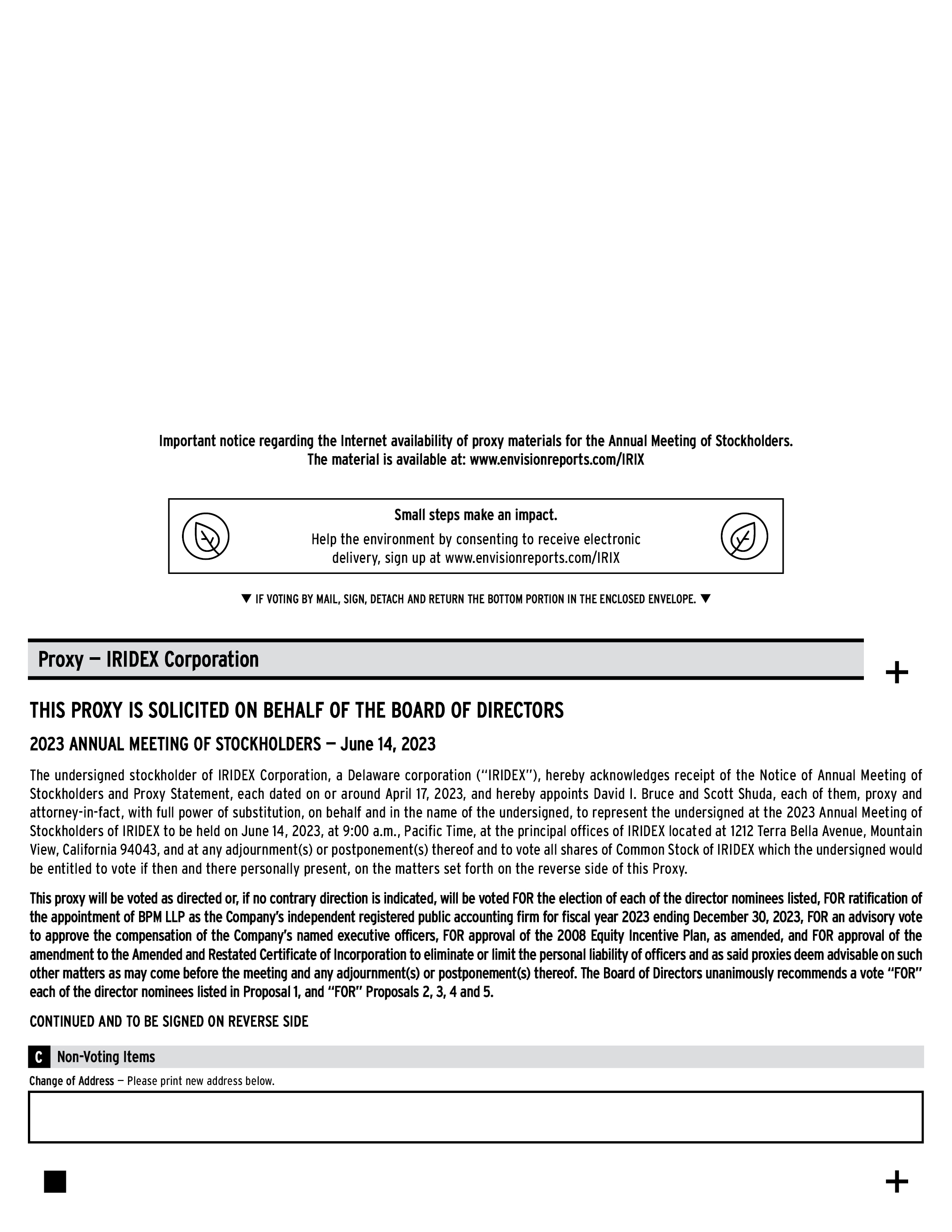 Small steps make an impact. Help the environment by consenting to receive electronic delivery, sign up at www.envisionreports.com/IRIX THIS PROXY IS SOLICITED ON BEHALF OF THE BOARD OF DIRECTORS 2023 ANNUAL MEETING OF STOCKHOLDERS June 14, 2023 The undersigned stockholder of IRIDEX Corporation, a Delaware corporation (“IRIDEX”), hereby acknowledges receipt of the Notice of Annual Meeting of Stockholders and Proxy Statement, each dated on or around April 17, 2023, and hereby appoints David I. Bruce and Scott Shuda, each of them, proxy and attorney-in-fact, with full power of substitution, on behalf and in the name of the undersigned, to represent the undersigned at the 2023 Annual Meeting of Stockholders of IRIDEX to be held on June 14, 2023, at 9:00 a.m., Pacific Time, at the principal offices of IRIDEX located at 1212 Terra Bella Avenue, Mountain View, California 94043, and at any adjournment(s) or postponement(s) thereof and to vote all shares of Common Stock of IRIDEX which the undersigned would be entitled to vote if then and there personally present, on the matters set forth on the reverse side of this Proxy. This proxy will be voted as directed or, if no contrary direction is indicated, will be voted FOR the election of each of the director nominees listed, FOR ratification of the appointment of BPM LLP as the Company’s independent registered public accounting firm for fiscal year 2023 ending December 30, 2023, FOR an advisory vote to approve the compensation of the Company’s named executive officers, FOR approval of the 2008 Equity Incentive Plan, as amended, and FOR approval of the amendment to the Amended and Restated Certificate of Incorporation to eliminate or limit the personal liability of officers and as said proxies deem advisable on such other matters as may come before the meeting and any adjournment(s) or postponement(s) thereof. The Board of Directors unanimously recommends a vote “FOR” each of the director nominees listed in Proposal 1, and “FOR” Proposals 2, 3, 4 and 5. CONTINUED AND TO BE SIGNED ON REVERSE SIDE Proxy IRIDEX Corporation qIF VOTING BY MAIL, SIGN, DETACH AND RETURN THE BOTTOM PORTION IN THE ENCLOSED ENVELOPE.q C Non-Voting Items + + Change of Address Please print new address below. Important notice regarding the Internet availability of proxy materials for the Annual Meeting of Stockholders. The material is available at: www.envisionreports.com/IRIX