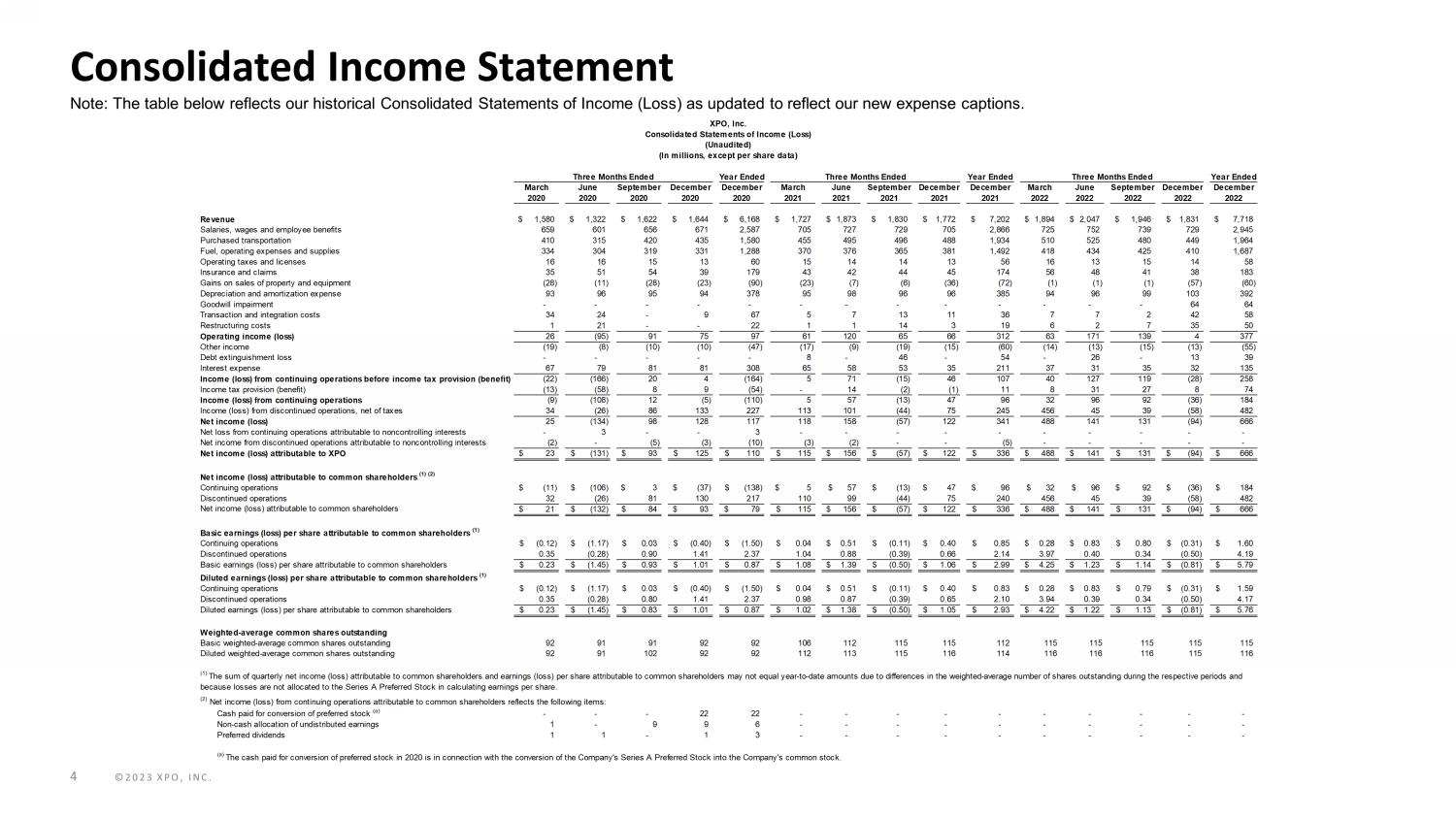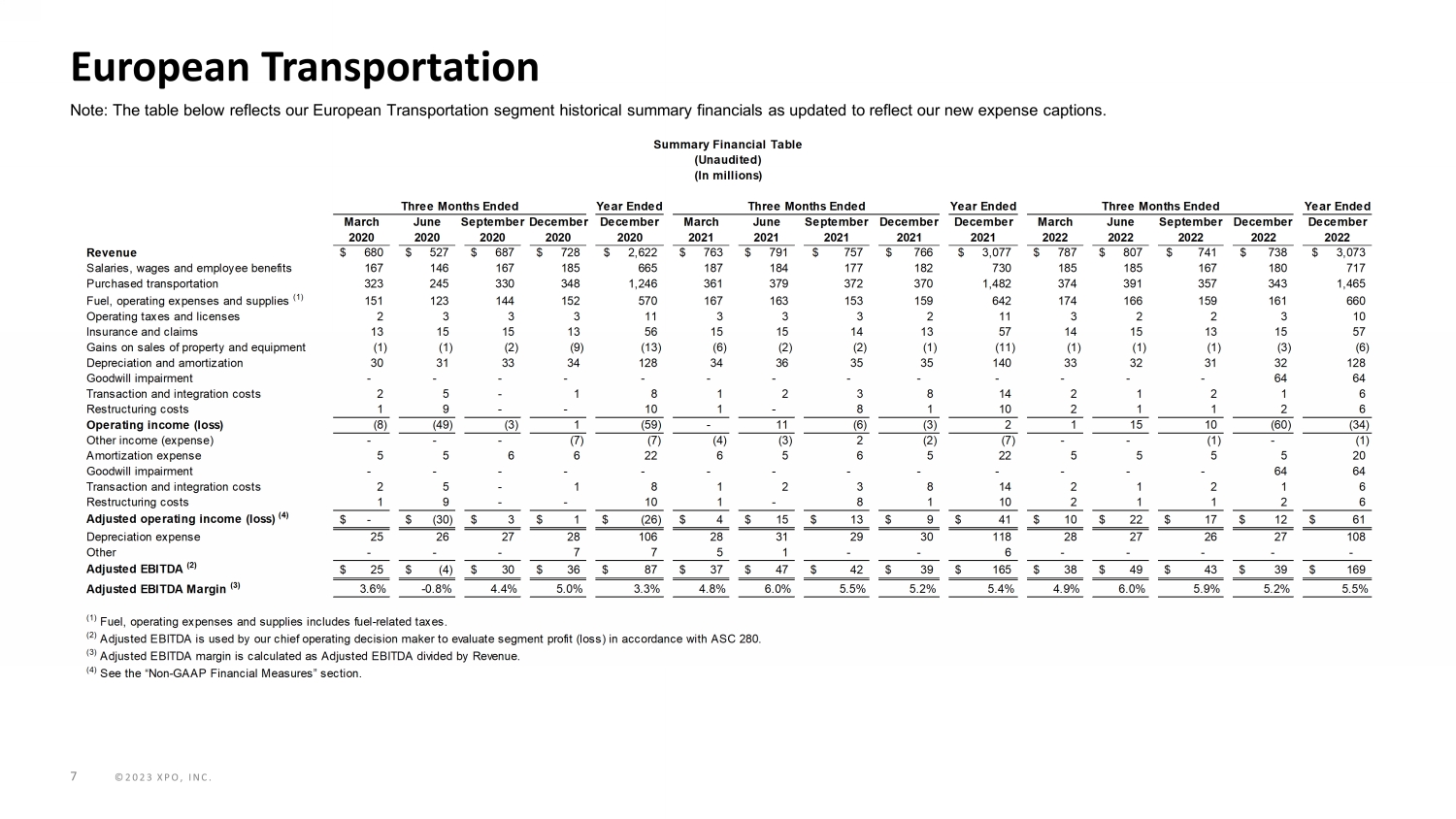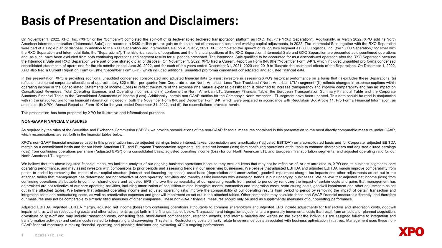©2023 XPO, INC. On November 1 , 2022 , XPO, Inc . (“XPO” or the “Company”) completed the spin - off of its tech - enabled brokered transportation platform as RXO, Inc . (the "RXO Separation") . Additionally, in March 2022 , XPO sold its North American intermodal operation (“Intermodal Sale”) and recorded a $ 430 million pre - tax gain on the sale, net of transaction costs and working capital adjustments, in 2022 . The Intermodal Sale together with the RXO Separation were part of a single plan of disposal . In addition to the RXO Separation and Intermodal Sale, on August 2 , 2021 , XPO completed the spin - off of its logistics segment as GXO Logistics, Inc . (the "GXO Separation," together with the RXO Separation and Intermodal Sale, the "Separations") . The historical results of operations and the financial positions of the RXO Separation, Intermodal Sale and GXO Separation are presented as discontinued operations and, as such, have been excluded from both continuing operations and segment results for all periods presented . The Intermodal Sale qualified to be accounted for as a discontinued operation after the RXO Separation because the Intermodal Sale and RXO Separation were part of one strategic plan of disposal . On November 1 , 2022 , XPO filed a Current Report on Form 8 - K (the “November Form 8 - K”), which included unaudited pro forma condensed consolidated statements of operations for the six months ended June 30 , 2022 , and for each of the years ended December 31 , 2021 , 2020 and 2019 to illustrate the estimated effects of the Separations . On December 1 , 2022 , XPO also filed a Current Report on Form 8 - K (the “December Form 8 - K”), which included additional unaudited pro forma condensed consolidated and adjusted financial data . In this presentation, XPO is providing additional unaudited condensed consolidated and adjusted financial data to assist investors in assessing XPO's historical performance on a basis that (i) excludes these Separations, (ii) reflects incremental corporate allocations of approximately $ 20 million per quarter from Corporate to our North American Less - Than - Truckload (“North American LTL”) segment, (iii) reflects changes in expense captions within operating income in the Consolidated Statements of Income (Loss) to reflect the nature of the expense (the natural expense classification is designed to increase transparency and improve comparability and has no impact on Revenues, Total Operating Expense, and Operating Income), and (iv) conforms the North American LTL Summary Financial Table, the European Transportation Summary Financial Table and the Corporate Summary Financial Table to the Consolidated Statements of Income (Loss) . Additionally, certain non - GAAP metrics for the Company’s North American LTL segment have been updated . This data should be read in conjunction with (i) the unaudited pro forma financial information included in both the November Form 8 - K and December Form 8 - K, which were prepared in accordance with Regulation S - X Article 11 , Pro Forma Financial Information, as amended, (ii) XPO’s Annual Report on Form 10 - K for the year ended December 31 , 2022 , and (iii) the reconciliations provided herein . This presentation has been prepared by XPO for illustrative and informational purposes . NON - GAAP FINANCIAL MEASURES As required by the rules of the Securities and Exchange Commission (“SEC”), we provide reconciliations of the non - GAAP financial measures contained in this presentation to the most directly comparable measure under GAAP, which reconciliations are set forth in the financial tables below . XPO’s non - GAAP financial measures used in this presentation include adjusted earnings before interest, taxes, depreciation and amortization (“adjusted EBITDA”) on a consolidated basis and for Corporate ; adjusted EBITDA margin on a consolidated basis and for our North American LTL and European Transportation segments ; adjusted net income (loss) from continuing operations attributable to common shareholders and adjusted diluted earnings (loss) from continuing operations per share ("adjusted EPS") on a consolidated basis ; adjusted operating income (loss) for our North American LTL and European Transportation segments ; and adjusted operating ratio for our North American LTL segment . We believe that the above adjusted financial measures facilitate analysis of our ongoing business operations because they exclude items that may not be reflective of, or are unrelated to, XPO and its business segments’ core operating performance, and may assist investors with comparisons to prior periods and assessing trends in our underlying businesses . We believe that adjusted EBITDA and adjusted EBITDA margin improve comparability from period to period by removing the impact of our capital structure (interest and financing expenses), asset base (depreciation and amortization), goodwill impairment charge, tax impacts and other adjustments as set out in the attached tables that management has determined are not reflective of core operating activities and thereby assist investors with assessing trends in our underlying businesses . We believe that adjusted net income (loss) from continuing operations attributable to common shareholders and adjusted EPS improve the comparability of our operating results from period to period by removing the impact of certain costs and gains that management has determined are not reflective of our core operating activities, including amortization of acquisition - related intangible assets, transaction and integration costs, restructuring costs, goodwill impairment and other adjustments as set out in the attached tables . We believe that adjusted operating income and adjusted operating ratio improve the comparability of our operating results from period to period by removing the impact of certain transaction and integration costs and restructuring costs, as well as a