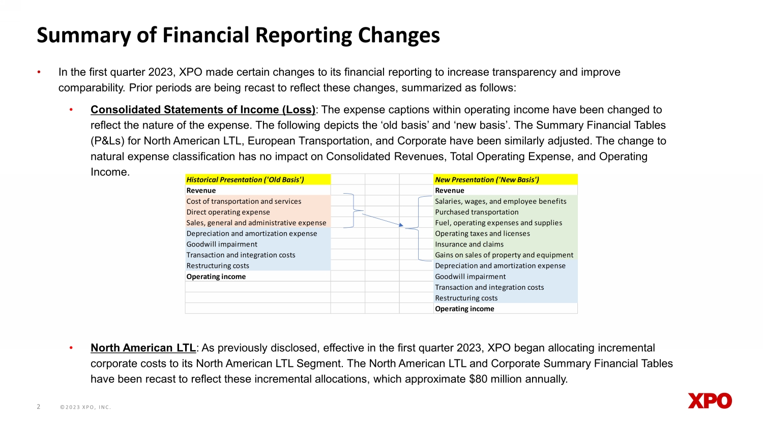 ©2023 XPO, INC. • In the first quarter 2023, XPO made certain changes to its financial reporting to increase transparency and improve comparability. Prior periods are being recast to reflect these changes, summarized as follows: • Consolidated Statements of Income (Loss) : The expense captions within operating income have been changed to reflect the nature of the expense. The following depicts the ‘old basis’ and ‘new basis’. The Summary Financial Tables (P&Ls) for North American LTL, European Transportation, and Corporate have been similarly adjusted. The change to natural expense classification has no impact on Consolidated Revenues, Total Operating Expense, and Operating Income. • North American LTL : As previously disclosed, effective in the first quarter 2023, XPO began allocating incremental corporate costs to its North American LTL Segment. The North American LTL and Corporate Summary Financial Tables have been recast to reflect these incremental allocations, which approximate $80 million annually. 2 Summary of Financial Reporting Changes Historical Presentation ('Old Basis') New Presentation ('New Basis') Revenue Revenue Cost of transportation and services Salaries, wages, and employee benefits Direct operating expense Purchased transportation Sales, general and administrative expense Fuel, operating expenses and supplies Depreciation and amortization expense Operating taxes and licenses Goodwill impairment Insurance and claims Transaction and integration costs Gains on sales of property and equipment Restructuring costs Depreciation and amortization expense Operating income Goodwill impairment Transaction and integration costs Restructuring costs Operating income