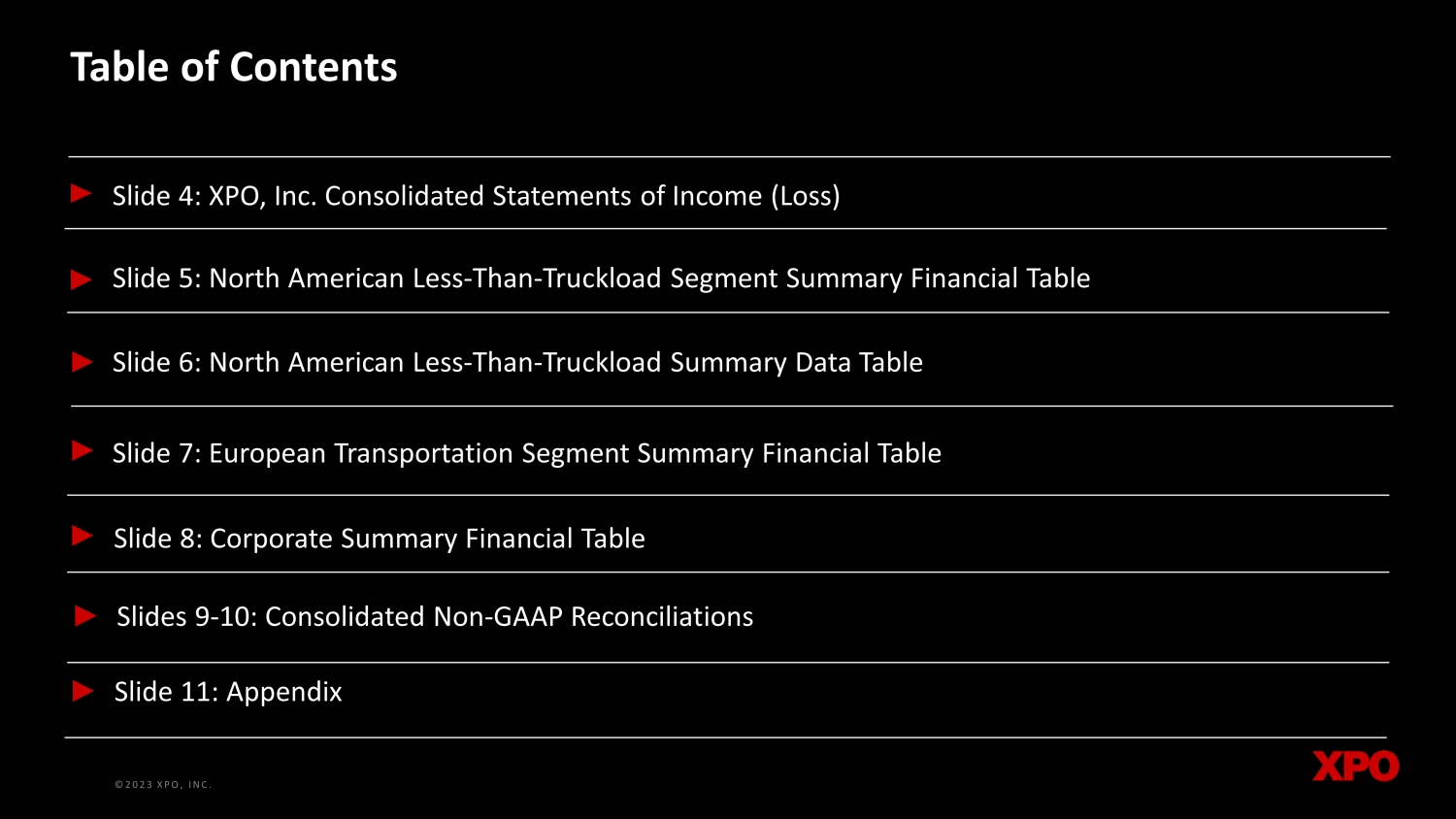 ©2023 XPO, INC. ©2023 XPO, INC. Table of Contents Slide 4: XPO, Inc. Consolidated Statements of Income (Loss) Slide 5: North American Less - Than - Truckload Segment Summary Financial Table Slide 6: North American Less - Than - Truckload Summary Data Table Slide 7: European Transportation Segment Summary Financial Table Slide 8: Corporate Summary Financial Table Slides 9 - 10: Consolidated Non - GAAP Reconciliations Slide 11: Appendix