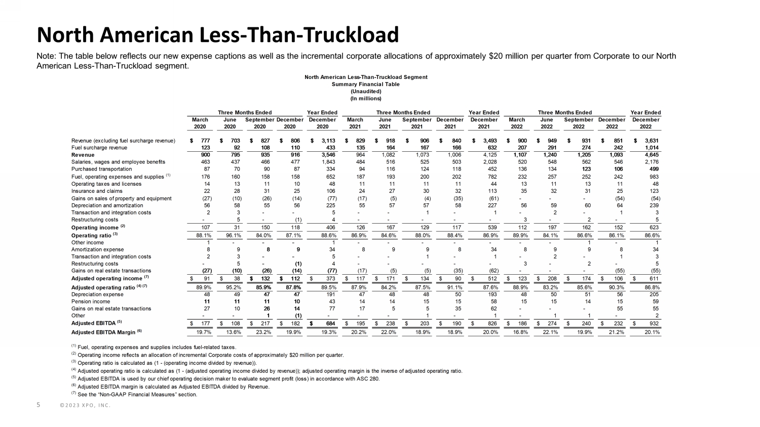 ©2023 XPO, INC. 4 Consolidated Income Statement Note: The table below reflects our historical Consolidated Statements of Income (Loss) as updated to reflect our new expense cap tions. Year Ended Year Ended Year Ended March June September December December March June September December December March June September December December 2020 2020 2020 2020 2020 2021 2021 2021 2021 2021 2022 2022 2022 2022 2022 Revenue 1,580$ 1,322$ 1,622$ 1,644$ 6,168$ 1,727$ 1,873$ 1,830$ 1,772$ 7,202$ 1,894$ 2,047$ 1,946$ 1,831$ 7,718$ Salaries, wages and employee benefits 659 601 656 671 2,587 705 727 729 705 2,866 725 752 739 729 2,945 Purchased transportation 410 315 420 435 1,580 455 495 496 488 1,934 510 525 480 449 1,964 Fuel, operating expenses and supplies 334 304 319 331 1,288 370 376 365 381 1,492 418 434 425 410 1,687 Operating taxes and licenses 16 16 15 13 60 15 14 14 13 56 16 13 15 14 58 Insurance and claims 35 51 54 39 179 43 42 44 45 174 56 48 41 38 183 Gains on sales of property and equipment (28) (11) (28) (23) (90) (23) (7) (6) (36) (72) (1) (1) (1) (57) (60) Depreciation and amortization expense 93 96 95 94 378 95 98 96 96 385 94 96 99 103 392 Goodwill impairment - - - - - - - - - - - - - 64 64 Transaction and integration costs 34 24 - 9 67 5 7 13 11 36 7 7 2 42 58 Restructuring costs 1 21 - - 22 1 1 14 3 19 6 2 7 35 50 Operating income (loss) 26 (95) 91 75 97 61 120 65 66 312 63 171 139 4 377 Other income (19) (8) (10) (10) (47) (17) (9) (19) (15) (60) (14) (13) (15) (13) (55) Debt extinguishment loss - - - - - 8 - 46 - 54 - 26 - 13 39 Interest expense 67 79 81 81 308 65 58 53 35 211 37 31 35 32 135 Income (loss) from continuing operations before income tax provision (benefit) (22) (166) 20 4 (164) 5 71 (15) 46 107 40 127 119 (28) 258 Income tax provision (benefit) (13) (58) 8 9 (54) - 14 (2) (1) 11 8 31 27 8 74 Income (loss) from continuing operations (9) (108) 12 (5) (110) 5 57 (13) 47 96 32 96 92 (36) 184 Income (loss) from discontinued operations, net of taxes 34 (26) 86 133 227 113 101 (44) 75 245 456 45 39 (58) 482 Net income (loss) 25 (134) 98 128 117 118 158 (57) 122 341 488 141 131 (94) 666 Net loss from continuing operations attributable to noncontrolling interests - 3 - - 3 - - - - - - - - - - Net income from discontinued operations attributable to noncontrolling interests (2) - (5) (3) (10) (3) (2) - - (5) - - - - - Net income (loss) attributable to XPO 23$ (131)$ 93$ 125$ 110$ 115$ 156$ (57)$ 122$ 336$ 488$ 141$ 131$ (94)$ 666$ Net income (loss) attributable to common shareholders (1) (2) Continuing operations (11)$ (106)$ 3$ (37)$ (138)$ 5$ 57$ (13)$ 47$ 96$ 32$ 96$ 92$ (36)$ 184$ Discontinued operations 32 (26) 81 130 217 110 99 (44) 75 240 456 45 39 (58) 482 Net income (loss) attributable to common shareholders 21$ (132)$ 84$ 93$ 79$ 115$ 156$ (57)$ 122$ 336$ 488$ 141$ 131$ (94)$ 666$ Basic earnings (loss) per share attributable to common shareholders (1) Continuing operations (0.12)$ (1.17)$ 0.03$ (0.40)$ (1.50)$ 0.04$ 0.51$ (0.11)$ 0.40$ 0.85$ 0.28$ 0.83$ 0.80$ (0.31)$ 1.60$ Discontinued operations 0.35 (0.28) 0.90 1.41 2.37 1.04 0.88 (0.39) 0.66 2.14 3.97 0.40 0.34 (0.50) 4.19 Basic earnings (loss) per share attributable to common shareholders 0.23$ (1.45)$ 0.93$ 1.01$ 0.87$ 1.08$ 1.39$ (0.50)$ 1.06$ 2.99$ 4.25$ 1.23$ 1.14$ (0.81)$ 5.79$ Diluted earnings (loss) per share attributable to common shareholders (1) Continuing operations (0.12)$ (1.17)$ 0.03$ (0.40)$ (1.50)$ 0.04$ 0.51$ (0.11)$ 0.40$ 0.83$ 0.28$ 0.83$ 0.79$ (0.31)$ 1.59$ Discontinued operations 0.35 (0.28) 0.80 1.41 2.37 0.98 0.87 (0.39) 0.65 2.10 3.94 0.39 0.34 (0.50) 4.17 Diluted earnings (loss) per share attributable to common shareholders 0.23$ (1.45)$ 0.83$ 1.01$ 0.87$ 1.02$ 1.38$ (0.50)$ 1.05$ 2.93$ 4.22$ 1.22$ 1.13$ (0.81)$ 5.76$ Weighted-average common shares outstanding Basic weighted-average common shares outstanding 92 91 91 92 92 106 112 115 115 112 115 115 115 115 115 Diluted weighted-average common shares outstanding 92 91 102 92 92 112 113 115 116 114 116 116 116 115 116 Cash paid for conversion of preferred stock (a) - - - 22 22 - - - - - - - - - - Non-cash allocation of undistributed earnings 1 - 9 9 6 - - - - - - - - - - Preferred dividends 1 1 - 1 3 - - - - - - - - - - (2) Net income (loss) from continuing operations attributable to common shareholders reflects the following items: (a) The cash paid for conversion of preferred stock in 2020 is in connection with the conversion of the Company's Series A Preferred Stock into the Company's common stock. XPO, Inc. Consolidated Statements of Income (Loss) (Unaudited) (In millions, except per share data) Three Months Ended Three Months EndedThree Months Ended (1) The sum of quarterly net income (loss) attributable to common shareholders and earnings (loss) per share attributable to common shareholders may not equal year-to-date amounts due to differences in the weighted-average number of shares outstanding during the respective periods and because losses are not allocated to the Series A Preferred Stock in calculating earnings per share.