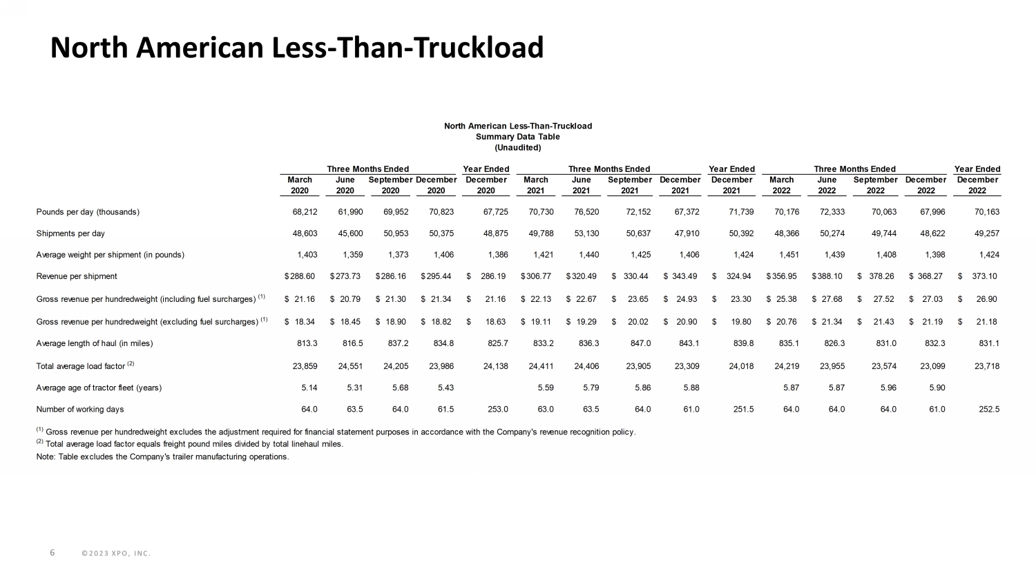 ©2023 XPO, INC. 5 North American Less - Than - Truckload Note: The table below reflects our new expense captions as well as the incremental corporate allocations of approximately $20 mi llion per quarter from Corporate to our North American Less - Than - Truckload segment. Year Ended Year Ended Year Ended March June SeptemberDecember December March June September December December March June September December December 2020 2020 2020 2020 2020 2021 2021 2021 2021 2021 2022 2022 2022 2022 2022 Revenue (excluding fuel surcharge revenue) 777$ 703$ 827$ 806$ 3,113$ 829$ 918$ 906$ 840$ 3,493$ 900$ 949$ 931$ 851$ 3,631$ Fuel surcharge revenue 123 92 108 110 433 135 164 167 166 632 207 291 274 242 1,014 Revenue 900 795 935 916 3,546 964 1,082 1,073 1,006 4,125 1,107 1,240 1,205 1,093 4,645 Salaries, wages and employee benefits 463 437 466 477 1,843 484 516 525 503 2,028 520 548 562 546 2,176 Purchased transportation 87 70 90 87 334 94 116 124 118 452 136 134 123 106 499 Fuel, operating expenses and supplies (1) 176 160 158 158 652 187 193 200 202 782 232 257 252 242 983 Operating taxes and licenses 14 13 11 10 48 11 11 11 11 44 13 11 13 11 48 Insurance and claims 22 28 31 25 106 24 27 30 32 113 35 32 31 25 123 Gains on sales of property and equipment (27) (10) (26) (14) (77) (17) (5) (4) (35) (61) - - - (54) (54) Depreciation and amortization 56 58 55 56 225 55 57 57 58 227 56 59 60 64 239 Transaction and integration costs 2 3 - - 5 - - 1 - 1 - 2 - 1 3 Restructuring costs - 5 - (1) 4 - - - - - 3 - 2 - 5 Operating income (2) 107 31 150 118 406 126 167 129 117 539 112 197 162 152 623 Operating ratio (3) 88.1% 96.1% 84.0% 87.1% 88.6% 86.9% 84.6% 88.0% 88.4% 86.9% 89.9% 84.1% 86.6% 86.1% 86.6% Other income 1 - - - 1 - - - - - - - 1 - 1 Amortization expense 8 9 8 9 34 8 9 9 8 34 8 9 9 8 34 Transaction and integration costs 2 3 - - 5 - - 1 - 1 - 2 - 1 3 Restructuring costs - 5 - (1) 4 - - - - - 3 - 2 - 5 Gains on real estate transactions (27) (10) (26) (14) (77) (17) (5) (5) (35) (62) - - - (55) (55) Adjusted operating income (7) 91$ 38$ 132$ 112$ 373$ 117$ 171$ 134$ 90$ 512$ 123$ 208$ 174$ 106$ 611$ Adjusted operating ratio (4) (7) 89.9% 95.2% 85.9% 87.8% 89.5% 87.9% 84.2% 87.5% 91.1% 87.6% 88.9% 83.2% 85.6% 90.3% 86.8% Depreciation expense 48 49 47 47 191 47 48 48 50 193 48 50 51 56 205 Pension income 11 11 11 10 43 14 14 15 15 58 15 15 14 15 59 Gains on real estate transactions 27 10 26 14 77 17 5 5 35 62 - - - 55 55 Other - - 1 (1) - - - 1 - 1 - 1 1 - 2 Adjusted EBITDA (5) 177$ 108$ 217$ 182$ 684$ 195$ 238$ 203$ 190$ 826$ 186$ 274$ 240$ 232$ 932$ Adjusted EBITDA Margin (6) 19.7% 13.6% 23.2% 19.9% 19.3% 20.2% 22.0% 18.9% 18.9% 20.0% 16.8% 22.1% 19.9% 21.2% 20.1% (1) Fuel, operating expenses and supplies includes fuel-related taxes. North American Less-Than-Truckload Segment Summary Financial Table (Unaudited) (In millions) Three Months Ended Three Months EndedThree Months Ended (5) Adjusted EBITDA is used by our chief operating decision maker to evaluate segment profit (loss) in accordance with ASC 280. (2) Operating income reflects an allocation of incremental Corporate costs of approximately $20 million per quarter. (3) Operating ratio is calculated as (1 - (operating income divided by revenue)). (4) Adjusted operating ratio is calculated as (1 - (adjusted operating income divided by revenue)); adjusted operating margin is the inverse of adjusted operating ratio. (7) See the “Non-GAAP Financial Measures” section. (6) Adjusted EBITDA margin is calculated as Adjusted EBITDA divided by Revenue.