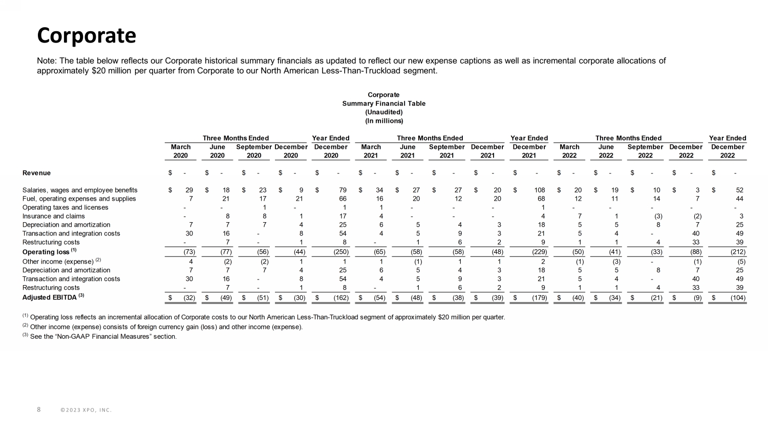 ©2023 XPO, INC. 7 European Transportation Note: The table below reflects our European Transportation segment historical summary financials as updated to reflect our ne w e xpense captions. Year Ended Year Ended Year Ended March June SeptemberDecember December March June September December December March June September December December 2020 2020 2020 2020 2020 2021 2021 2021 2021 2021 2022 2022 2022 2022 2022 Revenue 680$ 527$ 687$ 728$ 2,622$ 763$ 791$ 757$ 766$ 3,077$ 787$ 807$ 741$ 738$ 3,073$ Salaries, wages and employee benefits 167 146 167 185 665 187 184 177 182 730 185 185 167 180 717 Purchased transportation 323 245 330 348 1,246 361 379 372 370 1,482 374 391 357 343 1,465 Fuel, operating expenses and supplies (1) 151 123 144 152 570 167 163 153 159 642 174 166 159 161 660 Operating taxes and licenses 2 3 3 3 11 3 3 3 2 11 3 2 2 3 10 Insurance and claims 13 15 15 13 56 15 15 14 13 57 14 15 13 15 57 Gains on sales of property and equipment (1) (1) (2) (9) (13) (6) (2) (2) (1) (11) (1) (1) (1) (3) (6) Depreciation and amortization 30 31 33 34 128 34 36 35 35 140 33 32 31 32 128 Goodwill impairment - - - - - - - - - - - - - 64 64 Transaction and integration costs 2 5 - 1 8 1 2 3 8 14 2 1 2 1 6 Restructuring costs 1 9 - - 10 1 - 8 1 10 2 1 1 2 6 Operating income (loss) (8) (49) (3) 1 (59) - 11 (6) (3) 2 1 15 10 (60) (34) Other income (expense) - - - (7) (7) (4) (3) 2 (2) (7) - - (1) - (1) Amortization expense 5 5 6 6 22 6 5 6 5 22 5 5 5 5 20 Goodwill impairment - - - - - - - - - - - - - 64 64 Transaction and integration costs 2 5 - 1 8 1 2 3 8 14 2 1 2 1 6 Restructuring costs 1 9 - - 10 1 - 8 1 10 2 1 1 2 6 Adjusted operating income (loss) (4) -$ (30)$ 3$ 1$ (26)$ 4$ 15$ 13$ 9$ 41$ 10$ 22$ 17$ 12$ 61$ Depreciation expense 25 26 27 28 106 28 31 29 30 118 28 27 26 27 108 Other - - - 7 7 5 1 - - 6 - - - - - Adjusted EBITDA (2) 25$ (4)$ 30$ 36$ 87$ 37$ 47$ 42$ 39$ 165$ 38$ 49$ 43$ 39$ 169$ Adjusted EBITDA Margin (3) 3.6% -0.8% 4.4% 5.0% 3.3% 4.8% 6.0% 5.5% 5.2% 5.4% 4.9% 6.0% 5.9% 5.2% 5.5% (1) Fuel, operating expenses and supplies includes fuel-related taxes. (2) Adjusted EBITDA is used by our chief operating decision maker to evaluate segment profit (loss) in accordance with ASC 280. (3) Adjusted EBITDA margin is calculated as Adjusted EBITDA divided by Revenue. (4) See the “Non-GAAP Financial Measures” section. Summary Financial Table (Unaudited) (In millions) Three Months Ended Three Months Ended Three Months Ended
