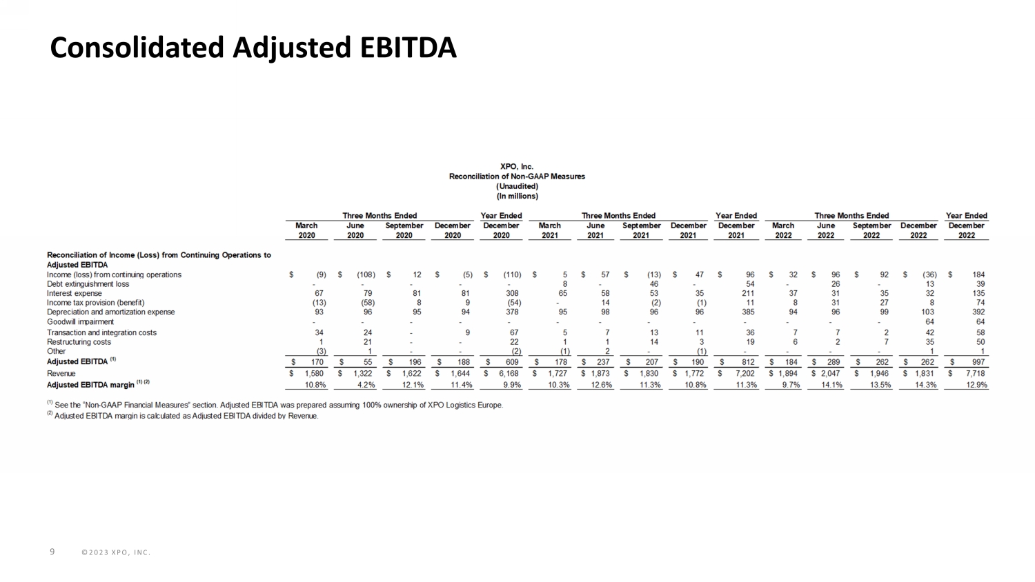 ©2023 XPO, INC. 8 Corporate Note: The table below reflects our Corporate historical summary financials as updated to reflect our new expense captions as well a s incremental corporate allocations of approximately $20 million per quarter from Corporate to our North American Less - Than - Truckload segment . Year Ended Year Ended Year Ended March June SeptemberDecember December March June September December December March June September December December 2020 2020 2020 2020 2020 2021 2021 2021 2021 2021 2022 2022 2022 2022 2022 Revenue -$ -$ -$ -$ -$ -$ -$ -$ -$ -$ -$ -$ -$ -$ -$ Salaries, wages and employee benefits 29$ 18$ 23$ 9$ 79$ 34$ 27$ 27$ 20$ 108$ 20$ 19$ 10$ 3$ 52$ Fuel, operating expenses and supplies 7 21 17 21 66 16 20 12 20 68 12 11 14 7 44 Operating taxes and licenses - - 1 - 1 1 - - - 1 - - - - - Insurance and claims - 8 8 1 17 4 - - - 4 7 1 (3) (2) 3 Depreciation and amortization 7 7 7 4 25 6 5 4 3 18 5 5 8 7 25 Transaction and integration costs 30 16 - 8 54 4 5 9 3 21 5 4 - 40 49 Restructuring costs - 7 - 1 8 - 1 6 2 9 1 1 4 33 39 Operating loss (1) (73) (77) (56) (44) (250) (65) (58) (58) (48) (229) (50) (41) (33) (88) (212) Other income (expense) (2) 4 (2) (2) 1 1 1 (1) 1 1 2 (1) (3) - (1) (5) Depreciation and amortization 7 7 7 4 25 6 5 4 3 18 5 5 8 7 25 Transaction and integration costs 30 16 - 8 54 4 5 9 3 21 5 4 - 40 49 Restructuring costs - 7 - 1 8 - 1 6 2 9 1 1 4 33 39 Adjusted EBITDA (3) (32)$ (49)$ (51)$ (30)$ (162)$ (54)$ (48)$ (38)$ (39)$ (179)$ (40)$ (34)$ (21)$ (9)$ (104)$ (2) Other income (expense) consists of foreign currency gain (loss) and other income (expense). (3) See the “Non-GAAP Financial Measures” section. Corporate Summary Financial Table (Unaudited) (In millions) Three Months Ended Three Months Ended (1) Operating loss reflects an incremental allocation of Corporate costs to our North American Less-Than-Truckload segment of approximately $20 million per quarter. Three Months Ended