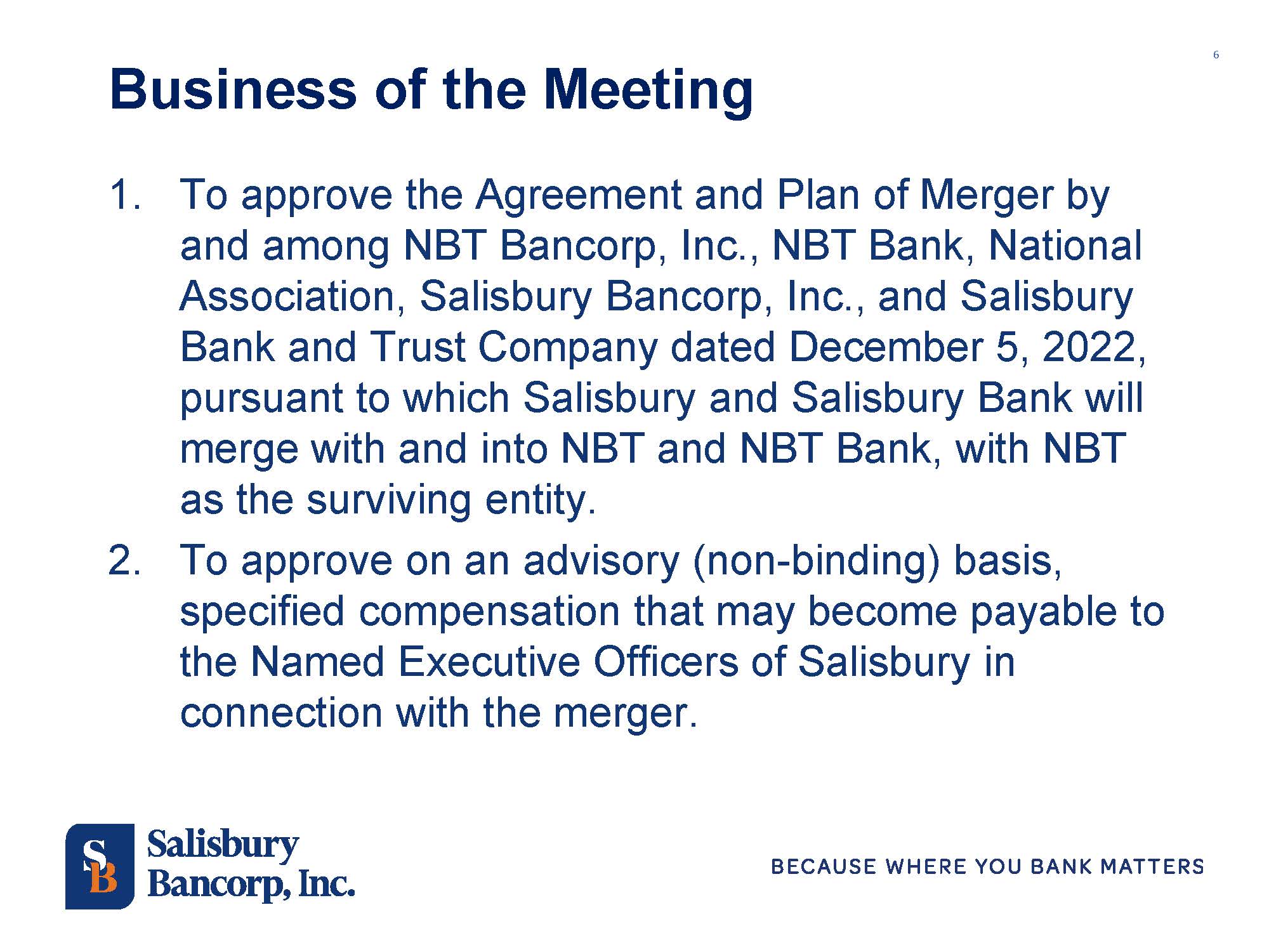 Forward-looking statements speak only as of the date they are made. NBT and Salisbury do not undertake, and specifically disclaim any obligation, to publicly release the result of any revisions which may be made to any forward-looking statements to reflect the occurrence of anticipated or unanticipated events or circumstances after the date of such statements. You are cautioned not to place undue reliance on these forward-looking statements.