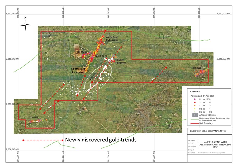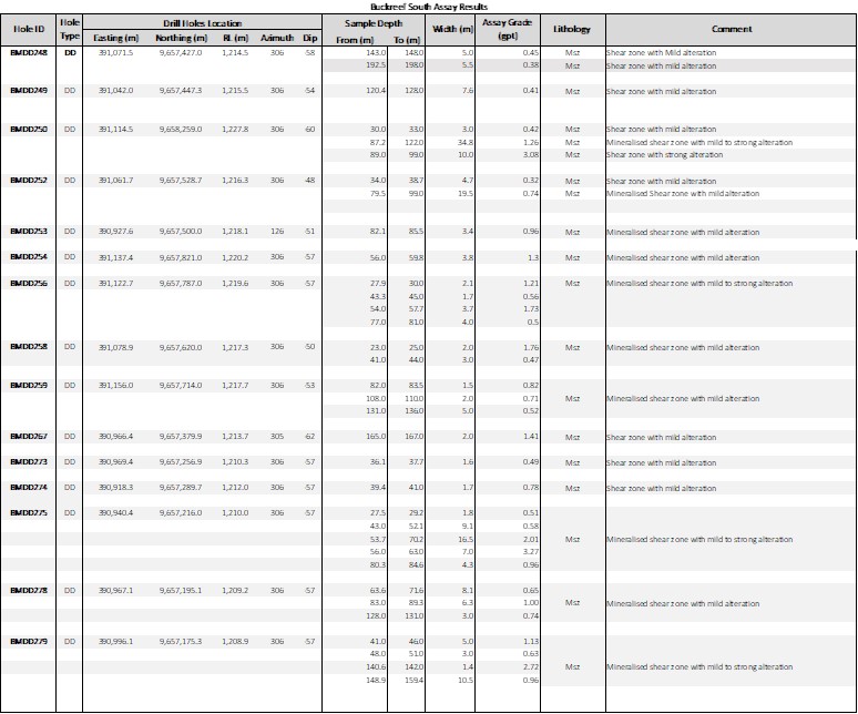 The results summarized in this MD&A are from Buckreef Main Zone NEE prospect. The prospect is an extension of the known Buckreef Main Zone. The intercepts confirm a continuity of over 200 m of known Buckreef main deposit to the North east. The intersections reported here are a down-hole length and may not represent true width, however the true width is estimated to be between 50% - 60% of the length.