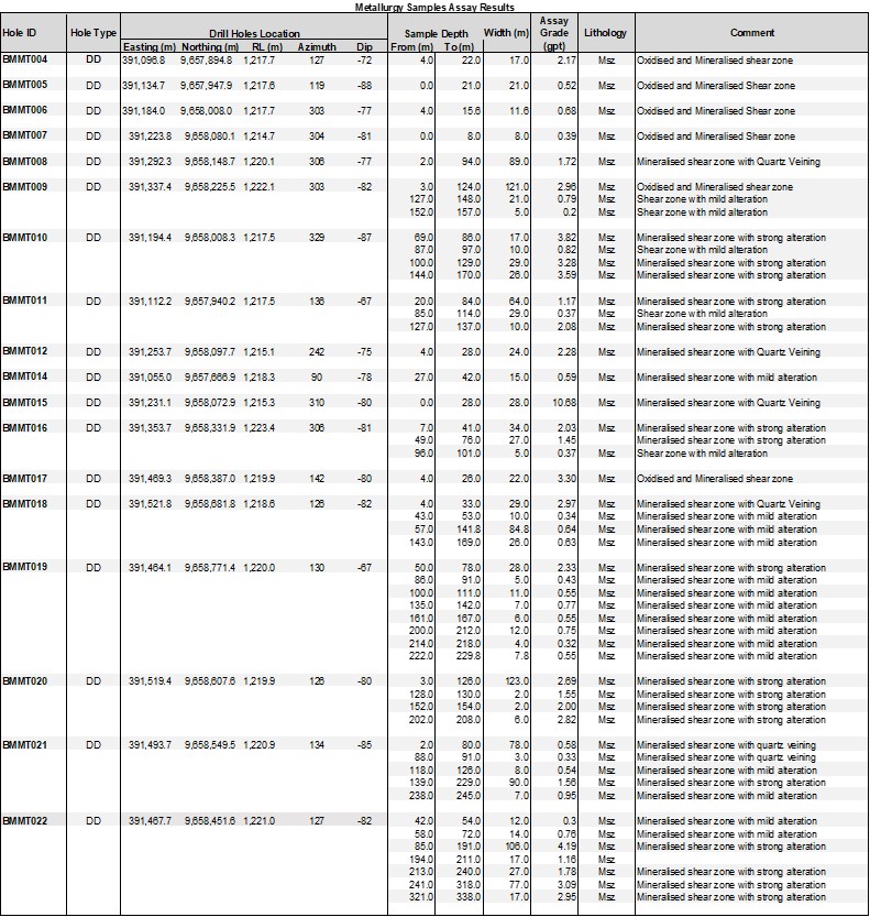 2 Notes Regarding Sample Protocol QA/QC: The sample chain of custody is managed by the Buckreef Gold geology team on site. Reported results are from diamond drilled core samples. Intervals of core to be analyzed are split into half using a mechanized core cutter, with one half sent to the Laboratory for geochemical analysis and the remaining half kept in storage for future reference and uses. Diamond drilled core has been a HQ size and recoveries are consistently 100% across all drill holes intercept reported.