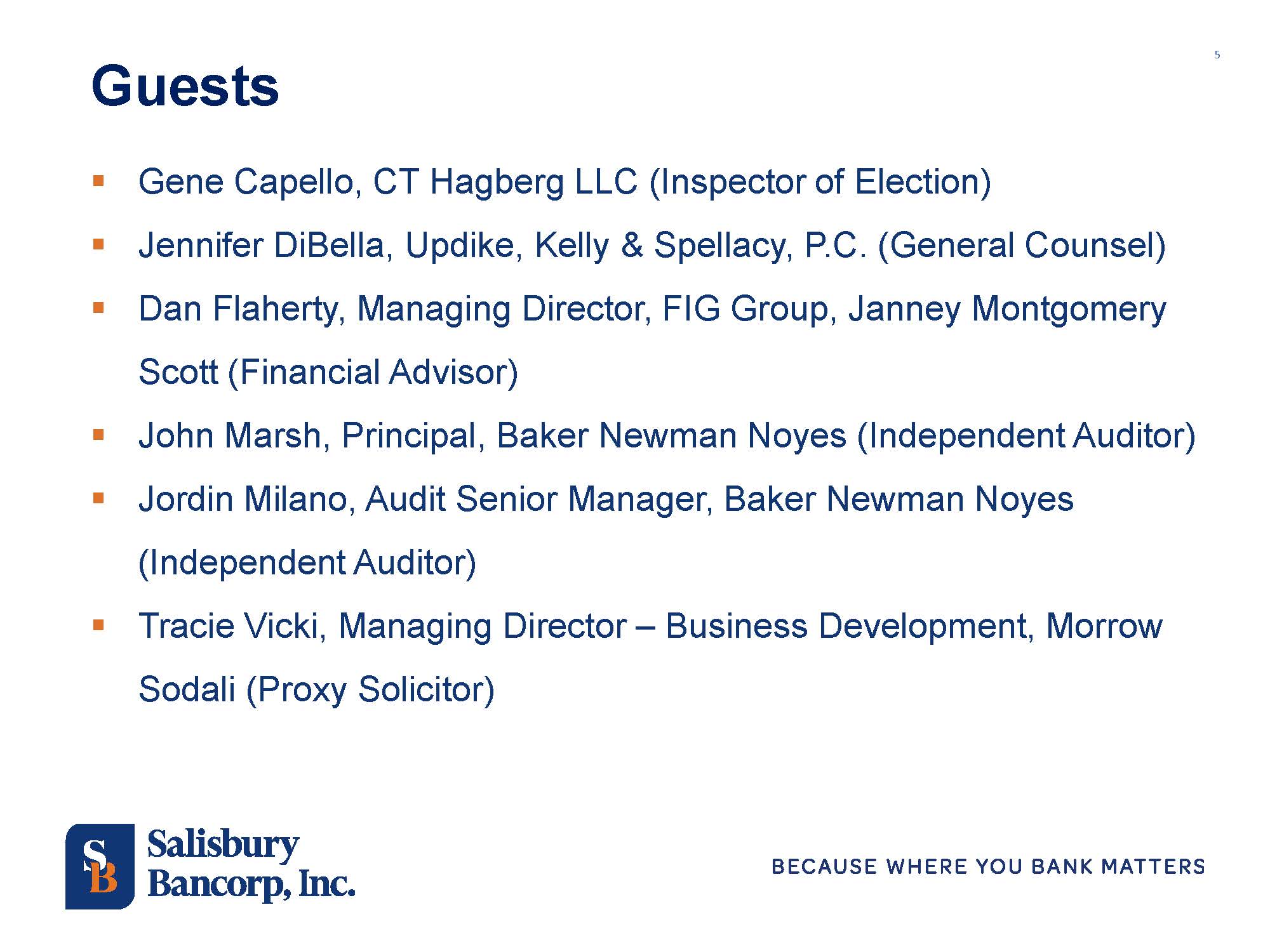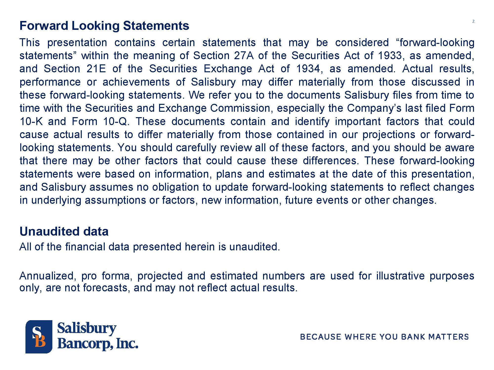 Forward-looking statements speak only as of the date they are made. NBT and Salisbury do not undertake, and specifically disclaim any obligation, to publicly release the result of any revisions which may be made to any forward-looking statements to reflect the occurrence of anticipated or unanticipated events or circumstances after the date of such statements. You are cautioned not to place undue reliance on these forward-looking statements.