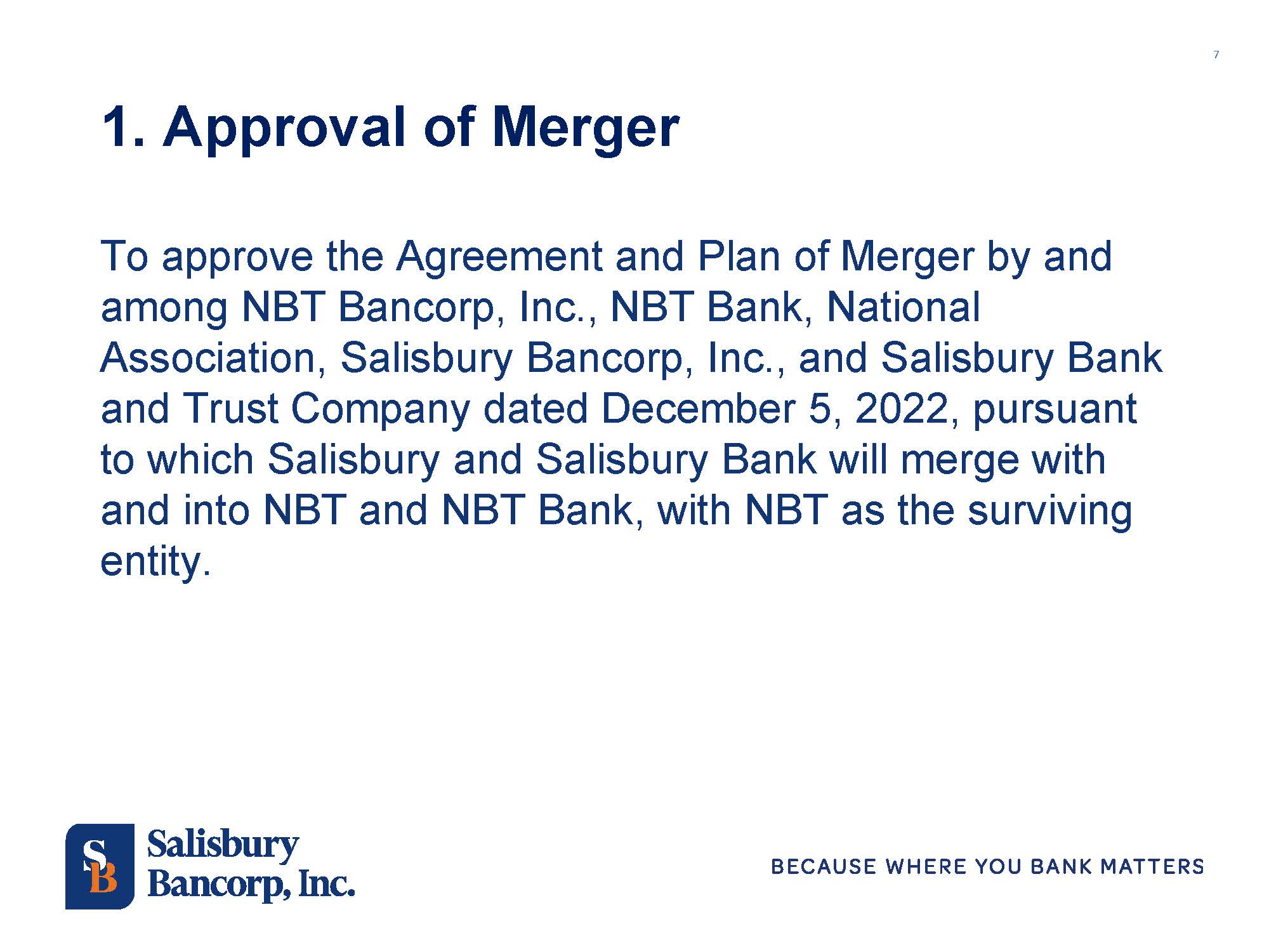 NBT and Salisbury and their respective directors and executive officers and other members of management and employees may be deemed to be participants in the solicitation of proxies in respect of the proposed transaction. You can find information about NBT’s executive officers and directors in NBT’s definitive proxy statement filed with the SEC on April 6, 2023. You can find information about Salisbury’s executive officers and directors in Salisbury’s definitive proxy statement filed with the SEC on April 8, 2022. Additional information regarding the interests of such potential participants is included in the proxy statement/prospectus and other relevant documents filed with the SEC when they become available. You may obtain free copies of these documents from NBT or Salisbury using the sources indicated above.