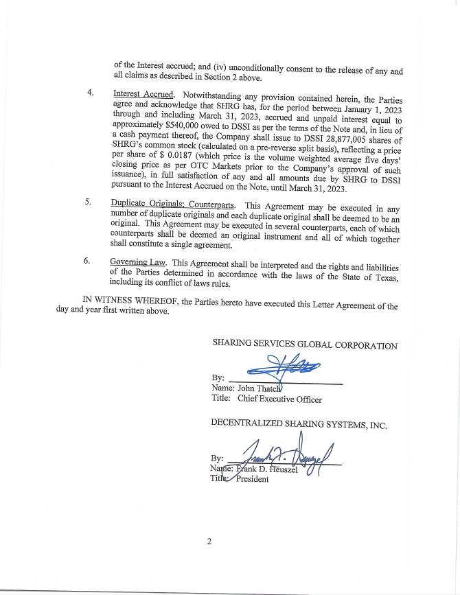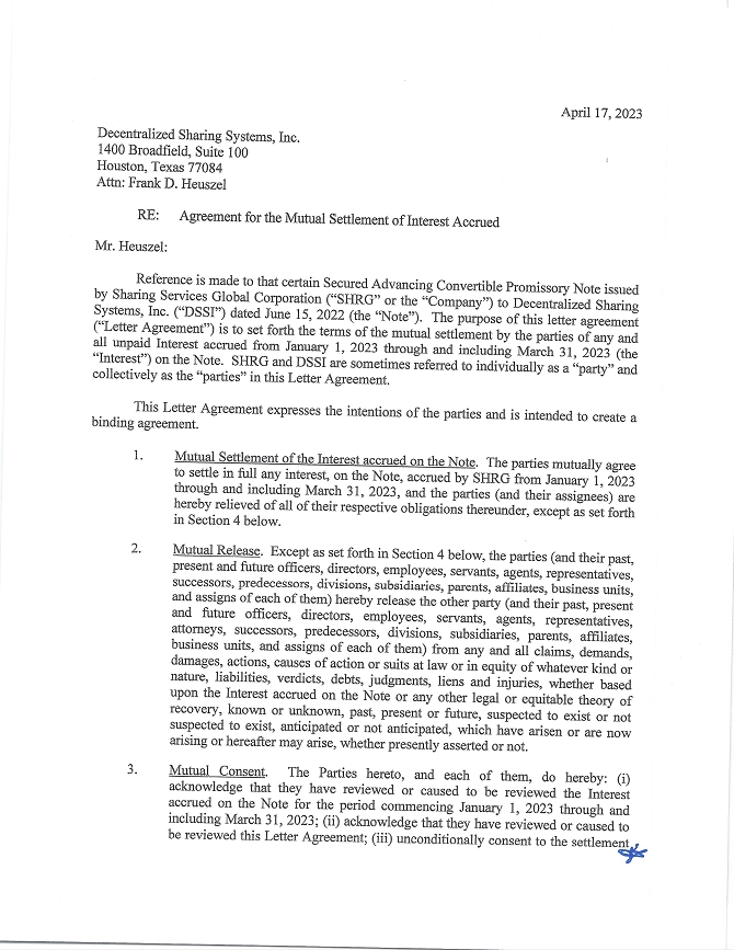 | 10.1 | Letter Agreement dated April 17, 2023, by and between Sharing Services Global Corporation and Decentralized Sharing Systems, Inc. | |