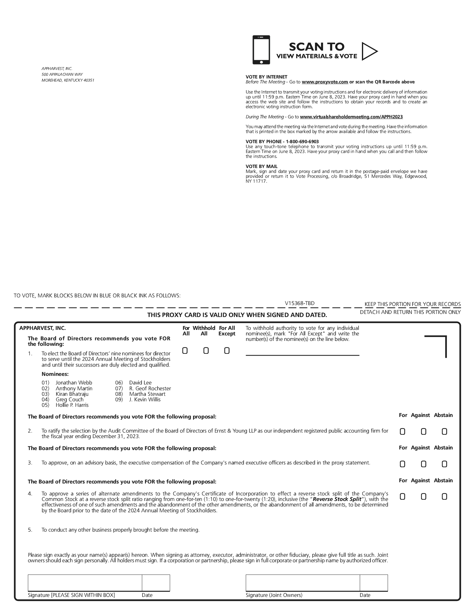 In September 2020, Novus, Legacy AppHarvest’s and certain Legacy AppHarvest’s stockholders, including holders affiliated with members of our Board and beneficial owners of greater than 5% of our capital stock, entered into the Stockholder Support Agreement, whereby such stockholders agreed to vote all of their shares of our capital stock in favor of the approval and adoption of the Business Combination. Additionally, such stockholders agreed, among other things, not to transfer any of their shares of common stock and our preferred stock (or enter into any arrangement with respect thereto), subject to certain customary exceptions, or enter into any voting arrangement that is inconsistent with the Stockholder Support Agreement.