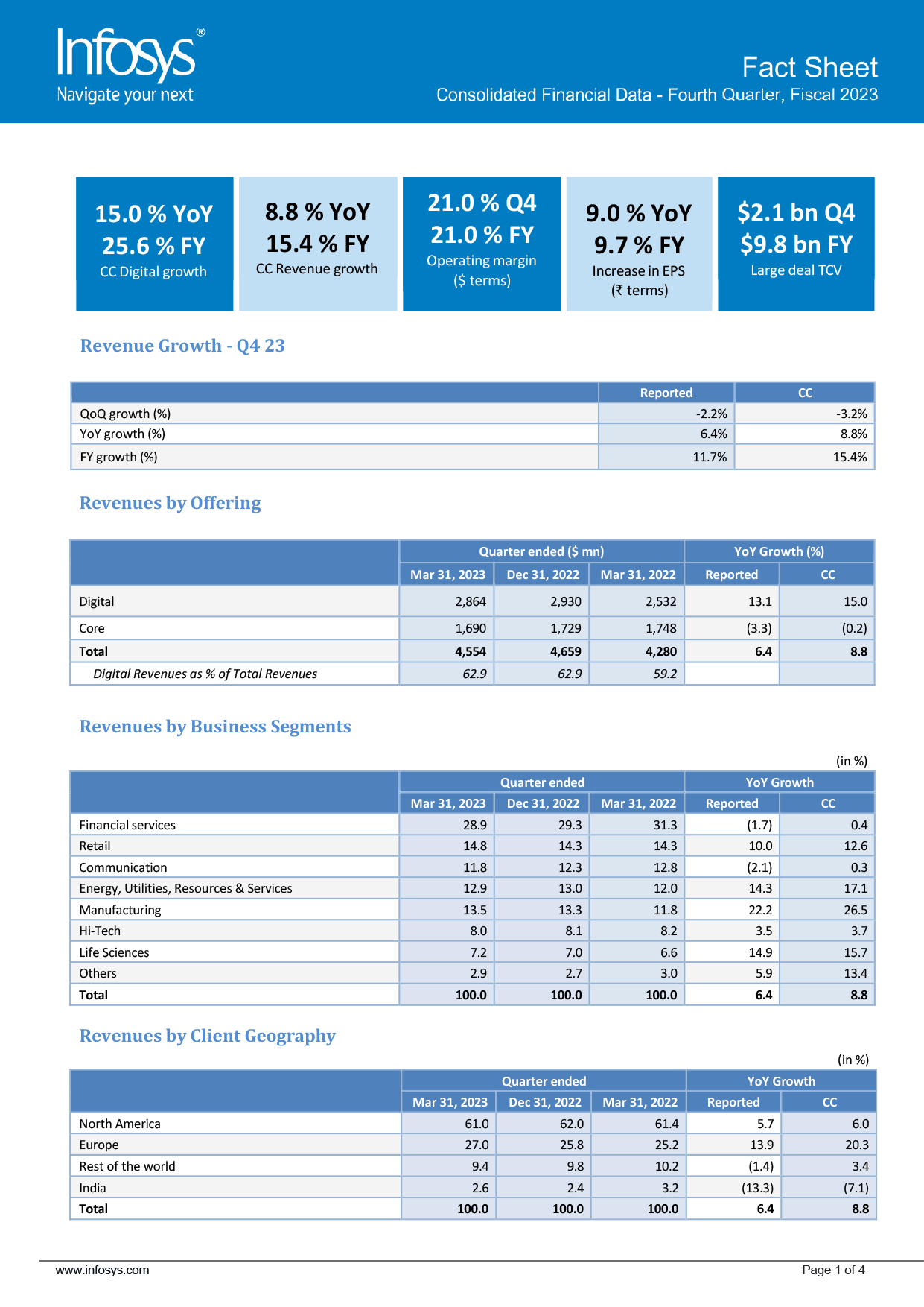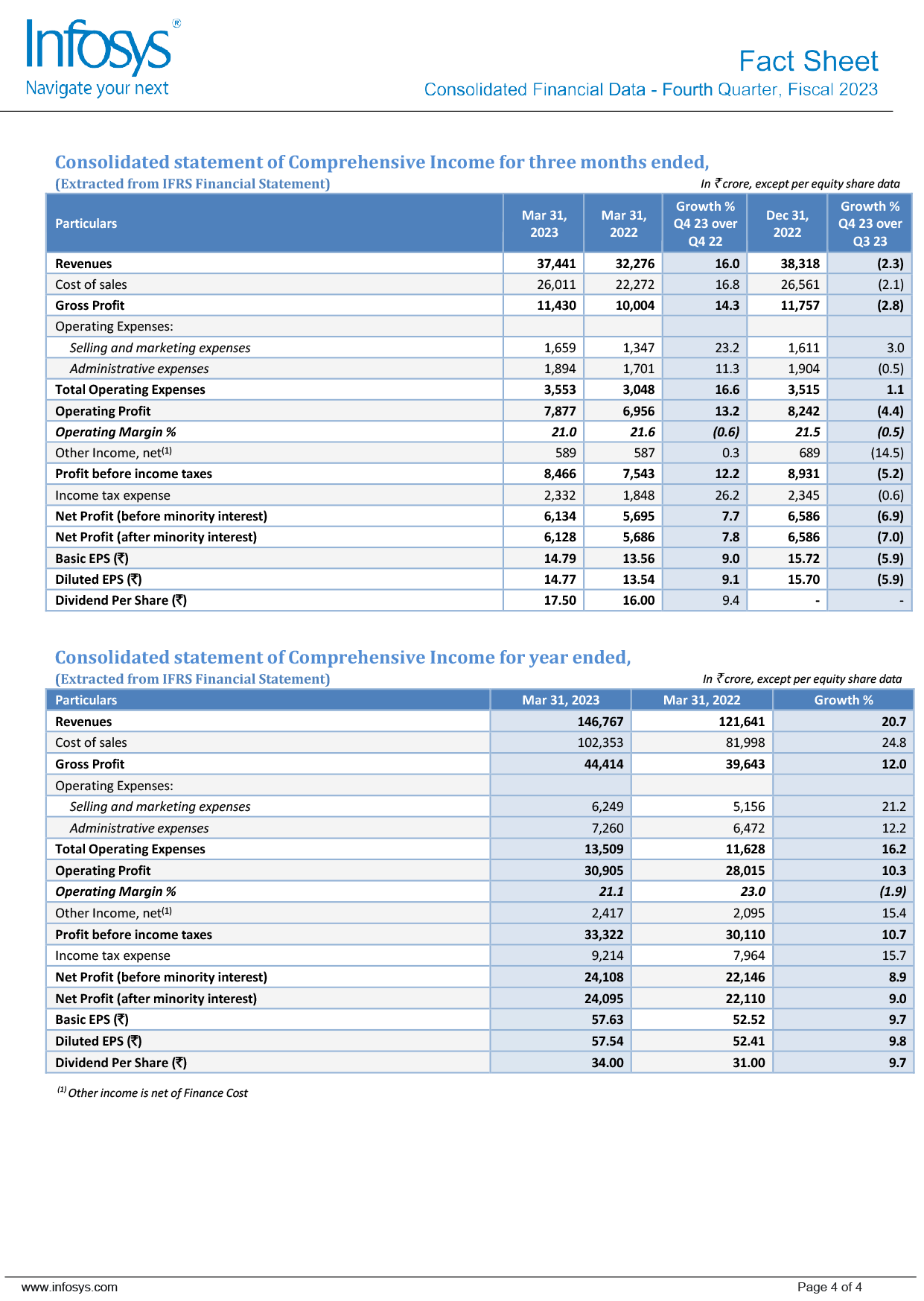 We have also made available to the public on our website, www.infosys.com , a fact sheet that provides details on our profit and loss account summary for the quarter and year ended March 31, 2023 and 2022 (as per IFRS); revenue by client geography offering, business segment, revenue by offering; information regarding our client concentration; employee information and metrics; and consolidated IT services information. We have attached this fact sheet to this Form 6-K as Exhibit 99.4.