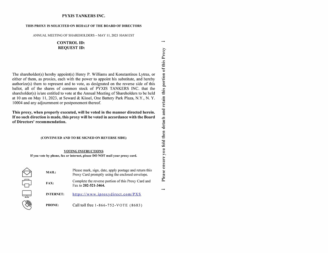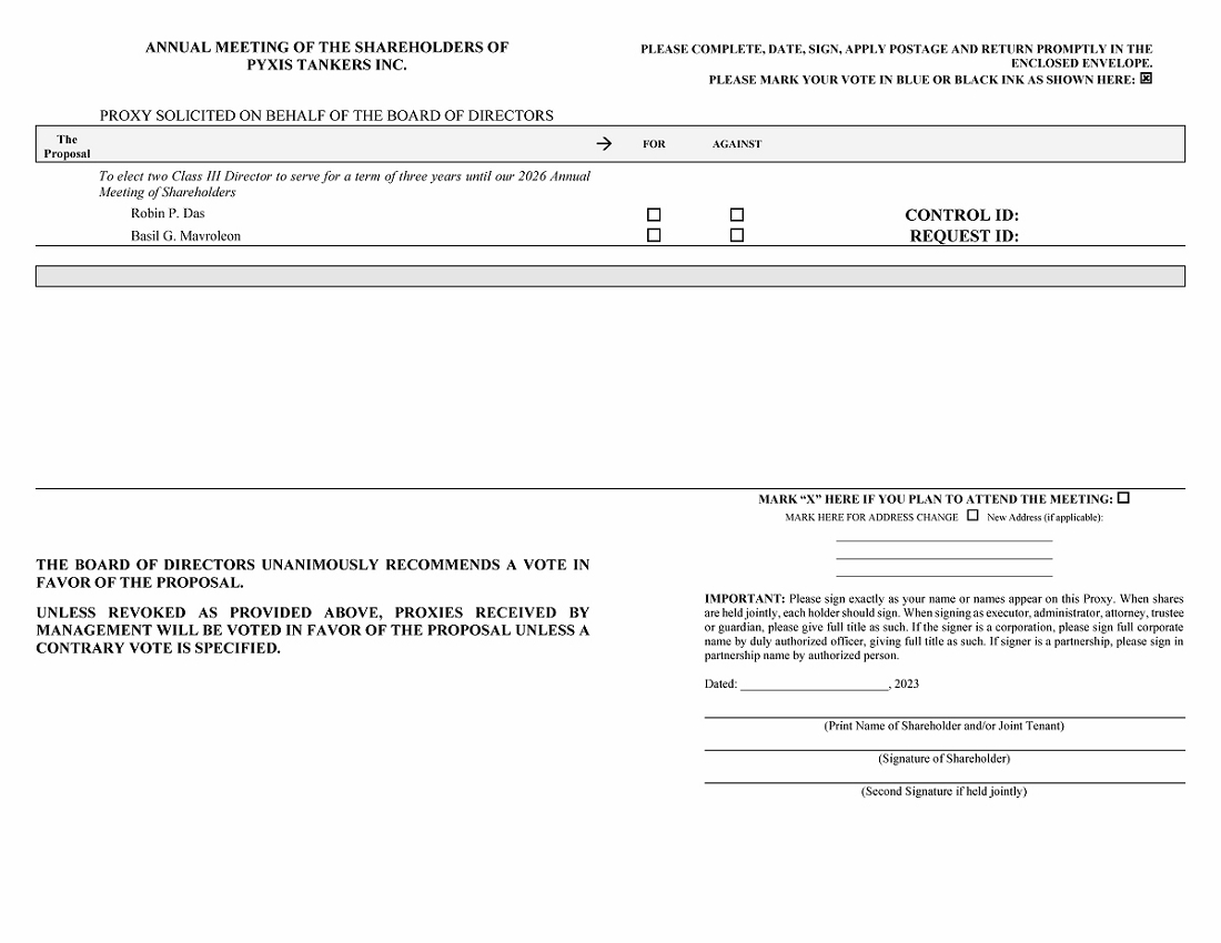 Pyxis Tankers Inc. (the “Company”) is furnishing this Report of Foreign Private Issuer on Form 6-K to the Securities and Exchange Commission for the purpose of providing the Notice and Proxy Statement for the Annual Meeting of Shareholders, which will be held on May 11, 2023, the Proxy Card for the Annual Meeting of Shareholders and the Notice and Access Card for the Annual Meeting of Shareholders, copies of which are filed hereto as Exhibits 99.1, 99.2 and 99.3, respectively.
