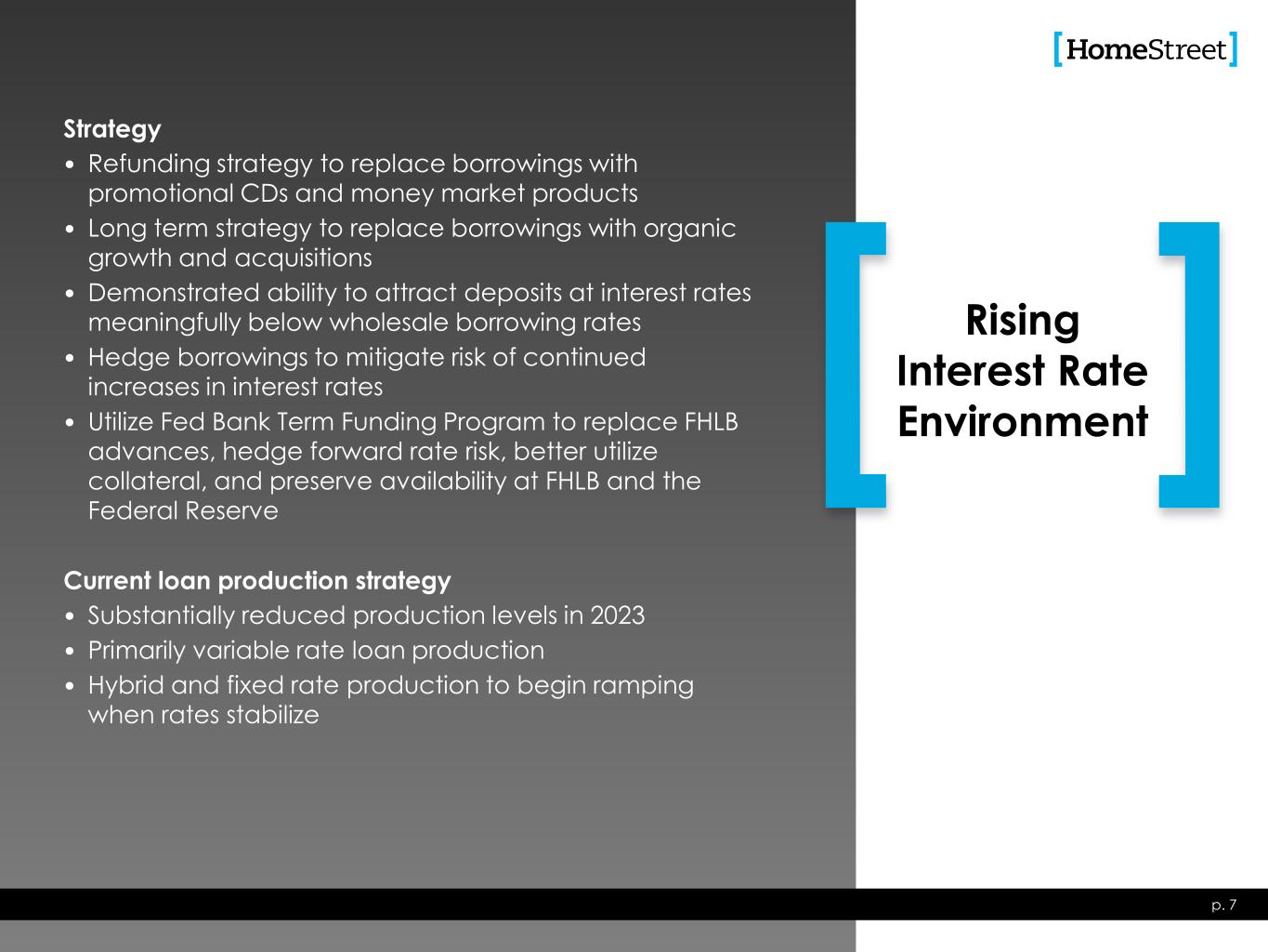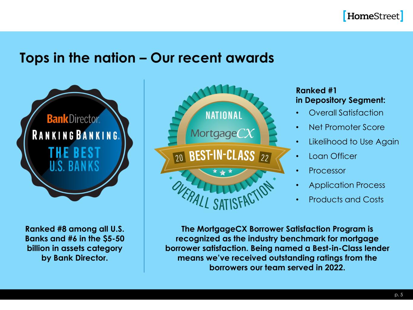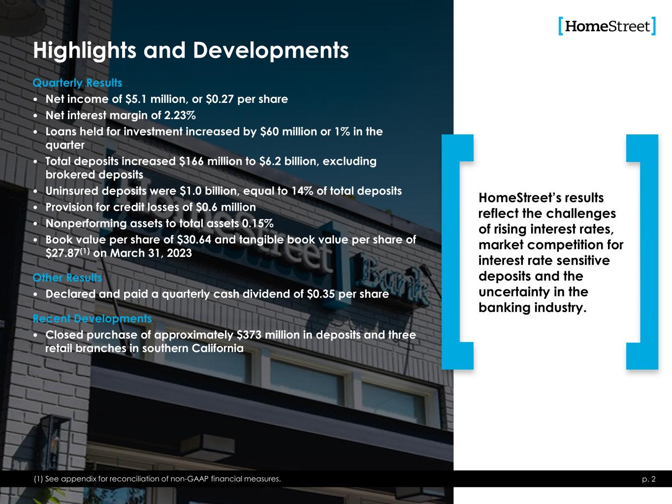 Important Disclosures Forward-Looking Statements This presentation includes forward-looking statements, as that term is defined for purposes of applicable securities laws, about our industry, our future financial performance, business plans and expectations. These statements are, in essence, attempts to anticipate or forecast future events, and thus subject to many risks and uncertainties. These forward-looking statements are based on our management's current expectations, beliefs, projections, and related to future plans and strategies, anticipated events, outcomes, or trends, as well as a number of assumptions concerning future events, are not historical facts and are identified by words such as “anticipate,” “believe,” “could,” “estimate,” “expect,” “intend,” “may,” “plan,” “potential,” “should,” “will,” “would” and similar expressions. Forward-looking statements in this presentation include, among other matters, statements regarding our business plans and strategies, general economic trends, strategic initiatives we have announced, growth scenarios and performance targets and key drivers guidance with respect to loans held for investment, average deposits, net interest margin, noninterest income and noninterest expense. Readers should note, however, that all statements in this presentation other than assertions of historical fact are forward-looking in nature. These statements are subject to risks, uncertainties, assumptions and other important factors set forth in our SEC filings, including but not limited to our Annual Report on Form 10-K for the year ended December 31, 2022, and in our subsequent quarterly reports on Forms 10-Q and Forms 8-K. Many of these factors and events that affect the volatility in our stock price and shareholders’ response to those events and factors are beyond our control. Such factors could cause actual results to differ materially from the results discussed or implied in the forward-looking statements. These risks include, without limitation, changes in the U.S. and global economies, including business disruptions, reductions in employment, inflationary pressures and an increase in business failures, specifically among our customers; changes in the interest rate environment may reduce interest margins; changes in deposit flows, loan demand or real estate values may adversely affect the business of the Bank, through which substantially all of our operations are carried out; there may be increases in competitive pressure among financial institutions or from non-financial institutions; our ability to attract and retain key members of our senior management team; the timing and occurrence or non-occurrence of events may be subject to circumstances beyond our control; our ability to control operating costs and expenses; our credit quality and the effect of credit quality on our credit losses expense and allowance for credit losses; the adequacy of our allowance for credit losses; changes in accounting principles, policies or guidelines may cause our financial condition to be perceived or interpreted differently; legislative or regulatory changes that may adversely affect our business or financial condition, including, without limitation, changes in corporate and/or individual income tax laws and policies, changes in privacy laws, and changes in regulatory capital or other rules, and the availability of resources to address or respond to such changes; general economic conditions, either nationally or locally in some or all areas in which we conduct business, or conditions in the securities markets or banking industry, may be less favorable than what we currently anticipate; challenges our customers may face in meeting current underwriting standards may adversely impact all or a substantial portion of the value of our rate-lock loan activity we recognize; technological changes may be more difficult or expensive than what we anticipate; a failure in or breach of our operational or security systems or information technology infrastructure, or those of our third-party providers and vendors, including due to cyber-attacks; success or consummation of new business initiatives may be more difficult or expensive than what we anticipate; our ability to grow efficiently both organically and through acquisitions and to manage our growth and integration costs; the continued impact of COVID-19 on our business, employees and our ability to provide services to our customers and respond to their needs as more cases of COVID-19 may arise in our primary markets; staffing fluctuations in response to product demand or the implementation of corporate strategies that affect our work force and potential associated charges; litigation, investigations or other matters before regulatory agencies, whether currently existing or commencing in the future, may delay the occurrence or non-occurrence of events longer than what we anticipate; our ability to obtain regulatory approvals or non-objection to take various capital actions, including the payment of dividends by us or the Bank, or repurchases of our common stock; and the consummation of our transaction to purchase three branches in southern California. Actual results may fall materially short of our expectations and projections, and we may be unable to execute on our strategic initiatives, or we may change our plans or take additional actions that differ in material ways from our current intentions. Accordingly, we can give no assurance of future performance, and you should not rely unduly on forward-looking statements. All forward-looking statements are based on information available to us as of the date hereof, and we do not undertake to update or revise any forward-looking statements for any reason. As used in this presentation, "HMST," "HomeStreet," the "Company," "we," "us," "our," or similar references refer to HomeStreet, Inc., a Washington corporation, and its consolidated subsid