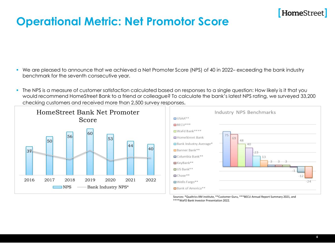 The content Operational Metric: Net Promotor Score We are pleased to announce that we achieved a Net Promoter Score (NPS) of 40 in 2022– exceeding the bank industry benchmark for the seventh consecutive year. The NPS is a measure of customer satisfaction calculated based on responses to a single question: How likely is it that you would recommend HomeStreet Bank to a friend or colleague? To calculate the bank’s latest NPS rating, we surveyed 33,200 checking customers and received more than 2,500 survey responses. 6 37 50 56 60 53 44 40 2016 2017 2018 2019 2020 2021 2022 HomeStreet Bank Net Promoter Score NPS Bank Industry NPS* Sources: *Qualtrics XM institute, **Customer Guru, ***BECU Annual Report Summary 2021, and ****WaFD Bank Investor Presentation 2022.