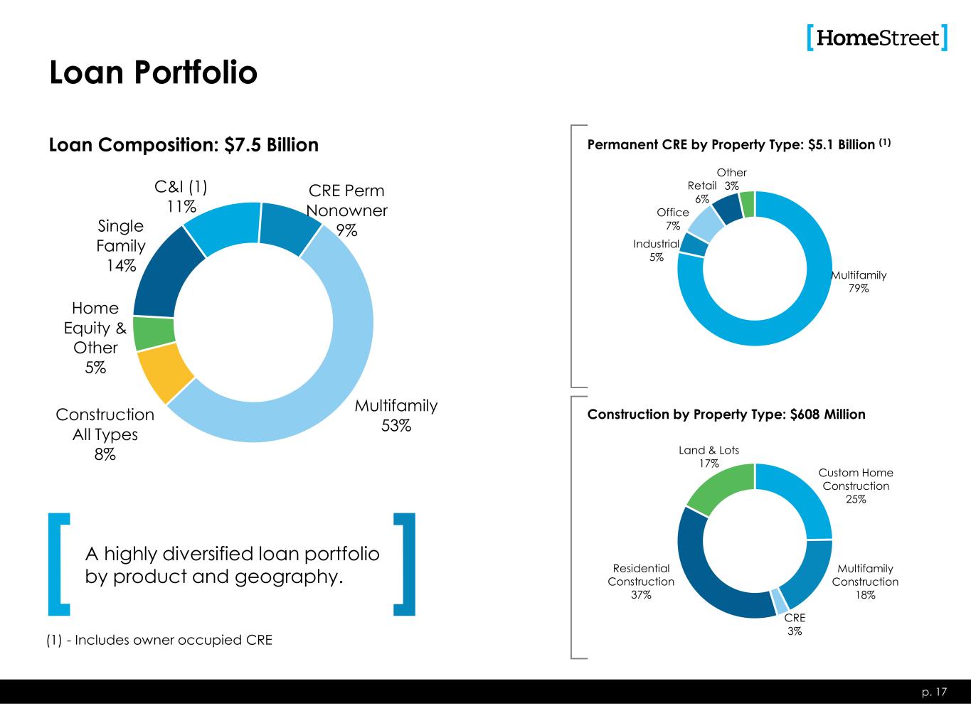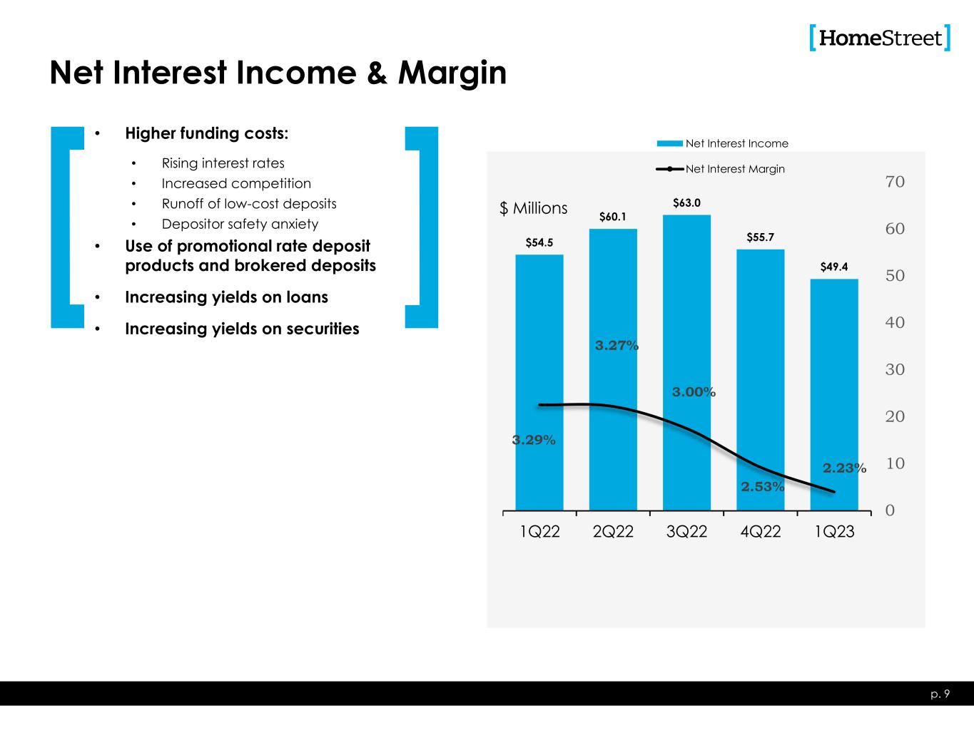 Highlights and Developments p. 2 Quarterly Results • Net income of $5.1 million, or $0.27 per share • Net interest margin of 2.23% • Loans held for investment increased by $60 million or 1% in the quarter • Total deposits increased $166 million to $6.2 billion, excluding brokered deposits • Uninsured deposits were $1.0 billion, equal to 14% of total deposits • Provision for credit losses of $0.6 million • Nonperforming assets to total assets 0.15% • Book value per share of $30.64 and tangible book value per share of $27.87(1) on March 31, 2023 Other Results • Declared and paid a quarterly cash dividend of $0.35 per share Recent Developments • Closed purchase of approximately $373 million in deposits and three retail branches in southern California HomeStreet’s results reflect the challenges of rising interest rates, market competition for interest rate sensitive deposits and the uncertainty in the banking industry. (1) See appendix for reconciliation of non-GAAP financial measures.