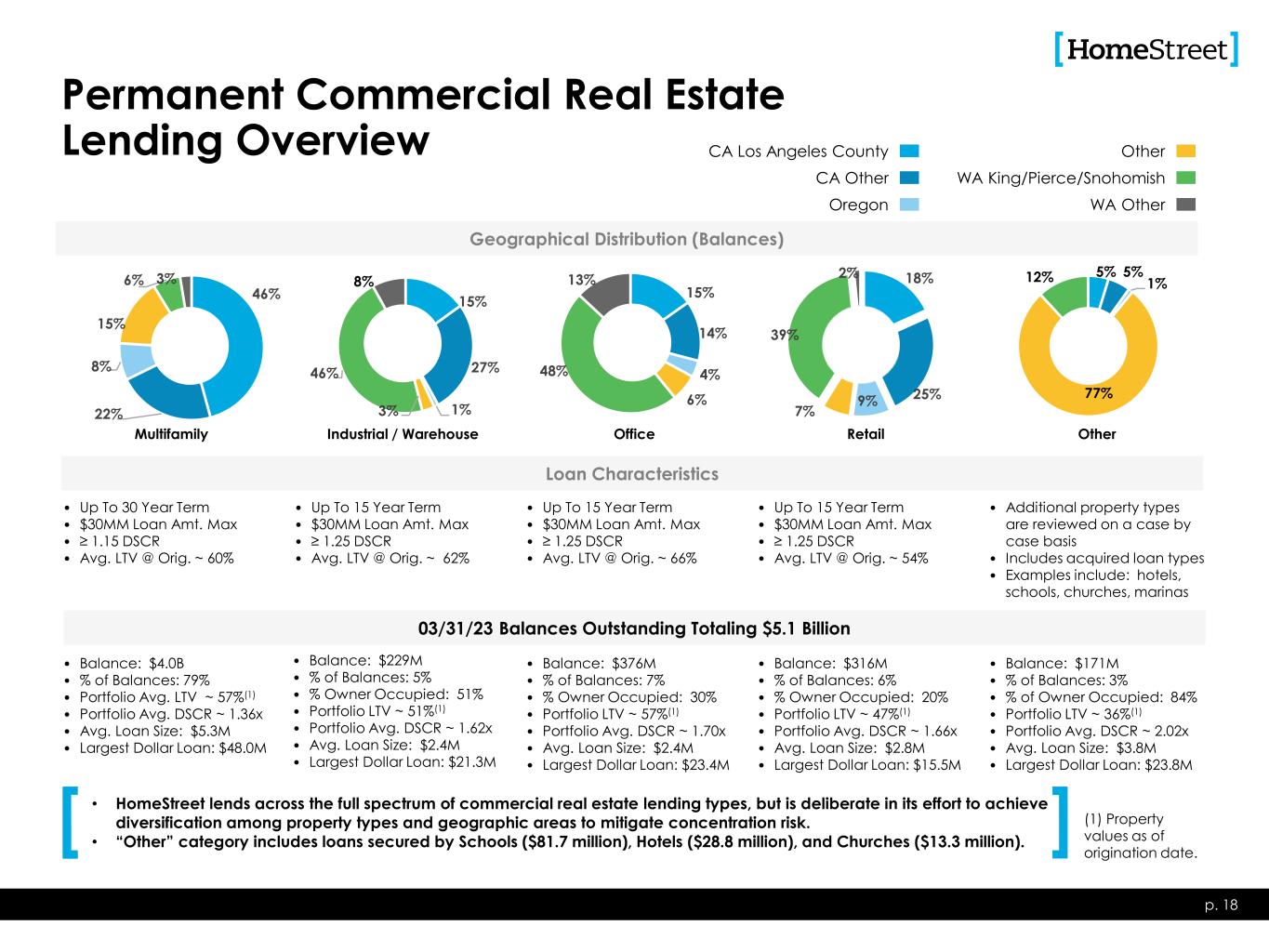 Permanent Commercial Real Estate Lending Overview • Up To 30 Year Term • $30MM Loan Amt. Max • ≥ 1.15 DSCR • Avg. LTV @ Orig. ~ 60% p. 18 Loan Characteristics • Up To 15 Year Term • $30MM Loan Amt. Max • ≥ 1.25 DSCR • Avg. LTV @ Orig. ~ 62% • Up To 15 Year Term • $30MM Loan Amt. Max • ≥ 1.25 DSCR • Avg. LTV @ Orig. ~ 66% • Up To 15 Year Term • $30MM Loan Amt. Max • ≥ 1.25 DSCR • Avg. LTV @ Orig. ~ 54% • Additional property types are reviewed on a case by case basis • Includes acquired loan types • Examples include: hotels, schools, churches, marinas • Balance: $4.0B • % of Balances: 79% • Portfolio Avg. LTV ~ 57%(1) • Portfolio Avg. DSCR ~ 1.36x • Avg. Loan Size: $5.3M • Largest Dollar Loan: $48.0M 03/31/23 Balances Outstanding Totaling $5.1 Billion • Balance: $229M • % of Balances: 5% • % Owner Occupied: 51% • Portfolio LTV ~ 51%(1) • Portfolio Avg. DSCR ~ 1.62x • Avg. Loan Size: $2.4M • Largest Dollar Loan: $21.3M • Balance: $376M • % of Balances: 7% • % Owner Occupied: 30% • Portfolio LTV ~ 57%(1) • Portfolio Avg. DSCR ~ 1.70x • Avg. Loan Size: $2.4M • Largest Dollar Loan: $23.4M • Balance: $316M • % of Balances: 6% • % Owner Occupied: 20% • Portfolio LTV ~ 47%(1) • Portfolio Avg. DSCR ~ 1.66x • Avg. Loan Size: $2.8M • Largest Dollar Loan: $15.5M • Balance: $171M • % of Balances: 3% • % of Owner Occupied: 84% • Portfolio LTV ~ 36%(1) • Portfolio Avg. DSCR ~ 2.02x • Avg. Loan Size: $3.8M • Largest Dollar Loan: $23.8M 46% 22% 8% 15% 6% 3% Geographical Distribution (Balances) Multifamily 15% 27% 1%3% 46% 8% Industrial / Warehouse 15% 14% 4% 6% 48% 13% Office 18% 25%9% 7% 39% 2% Retail 5% 5% 1% 77% 12% Other CA Los Angeles County CA Other Oregon Other WA King/Pierce/Snohomish WA Other (1) Property values as of origination date. • HomeStreet lends across the full spectrum of commercial real estate lending types, but is deliberate in its effort to achieve diversification among property types and geographic areas to mitigate concentration risk. • “Other” category includes loans secured by Schools ($81.7 million), Hotels ($28.8 million), and Churches ($13.3 million).