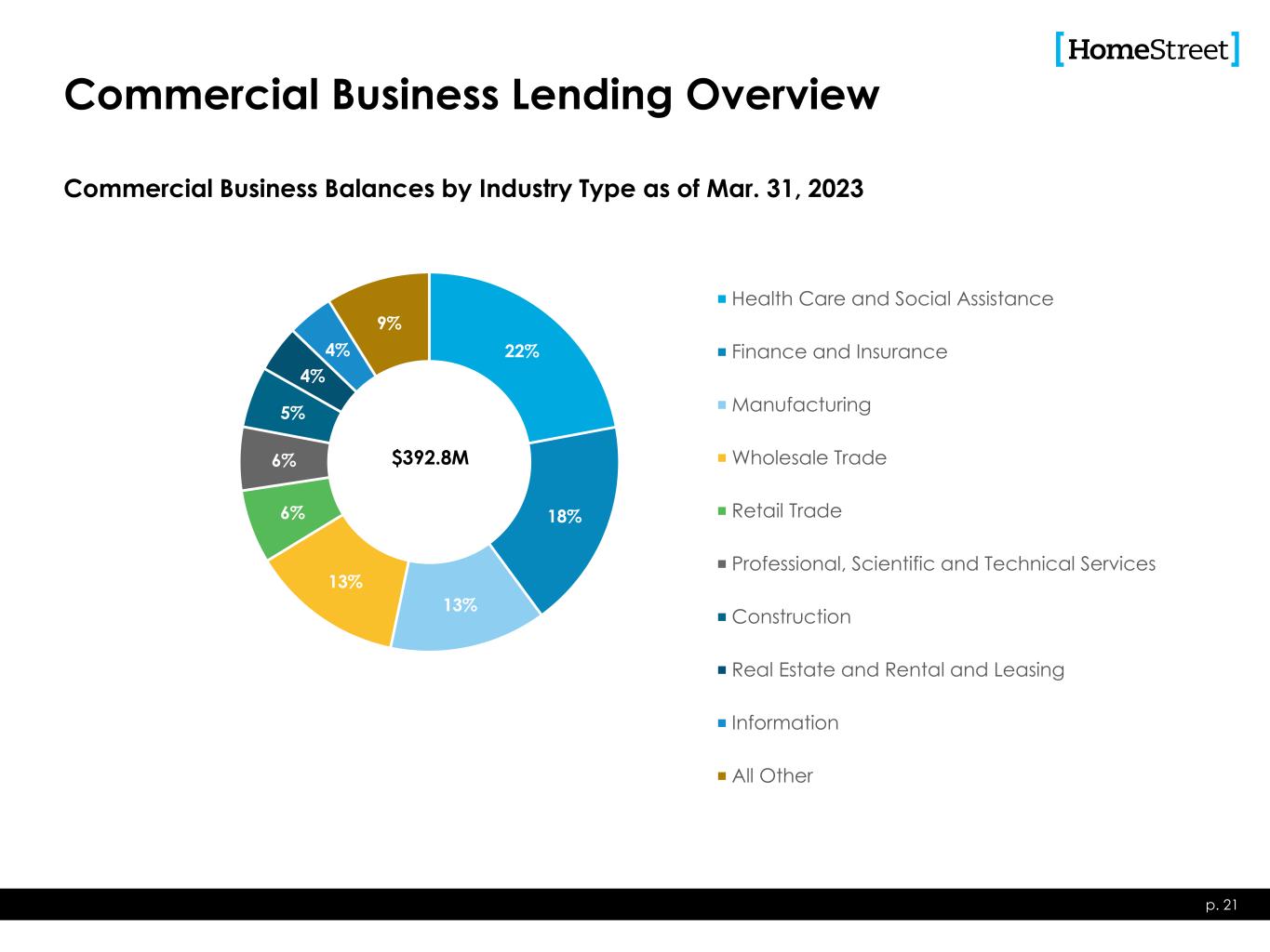 Commercial Business Lending Overview Commercial Business Balances by Industry Type as of Mar. 31, 2023 p. 21 22% 18% 13% 13% 6% 6% 5% 4% 4% 9% Health Care and Social Assistance Finance and Insurance Manufacturing Wholesale Trade Retail Trade Professional, Scientific and Technical Services Construction Real Estate and Rental and Leasing Information All Other $392.8M