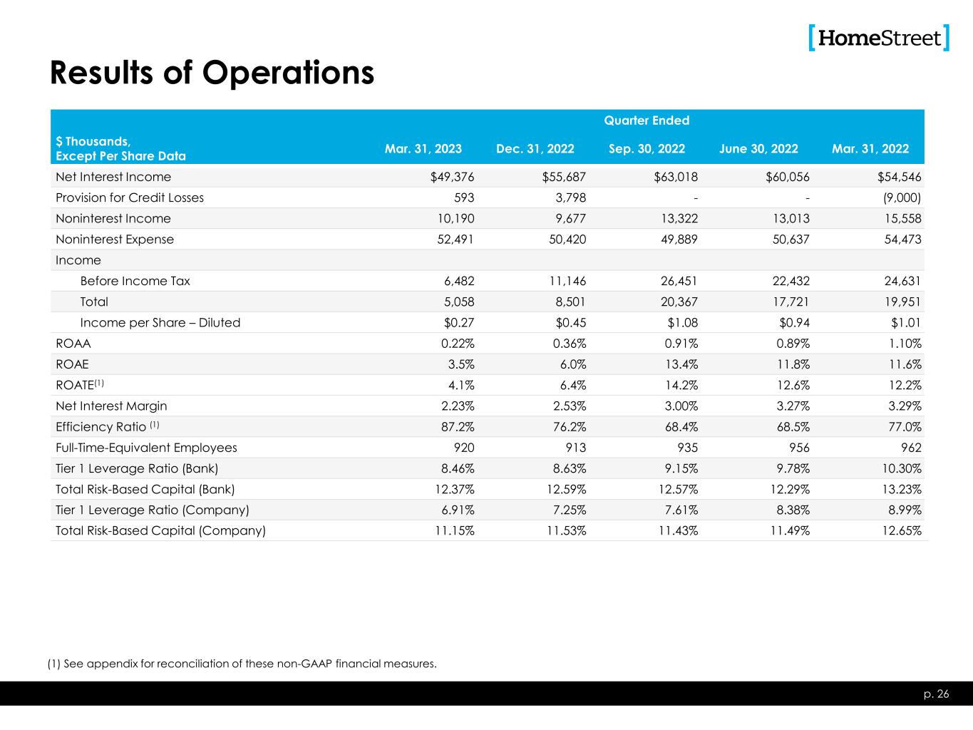 Results of Operations Quarter Ended $ Thousands, Except Per Share Data Mar. 31, 2023 Dec. 31, 2022 Sep. 30, 2022 June 30, 2022 Mar. 31, 2022 Net Interest Income $49,376 $55,687 $63,018 $60,056 $54,546 Provision for Credit Losses 593 3,798 - - (9,000) Noninterest Income 10,190 9,677 13,322 13,013 15,558 Noninterest Expense 52,491 50,420 49,889 50,637 54,473 Income Before Income Tax 6,482 11,146 26,451 22,432 24,631 Total 5,058 8,501 20,367 17,721 19,951 Income per Share – Diluted $0.27 $0.45 $1.08 $0.94 $1.01 ROAA 0.22% 0.36% 0.91% 0.89% 1.10% ROAE 3.5% 6.0% 13.4% 11.8% 11.6% ROATE(1) 4.1% 6.4% 14.2% 12.6% 12.2% Net Interest Margin 2.23% 2.53% 3.00% 3.27% 3.29% Efficiency Ratio (1) 87.2% 76.2% 68.4% 68.5% 77.0% Full-Time-Equivalent Employees 920 913 935 956 962 Tier 1 Leverage Ratio (Bank) 8.46% 8.63% 9.15% 9.78% 10.30% Total Risk-Based Capital (Bank) 12.37% 12.59% 12.57% 12.29% 13.23% Tier 1 Leverage Ratio (Company) 6.91% 7.25% 7.61% 8.38% 8.99% Total Risk-Based Capital (Company) 11.15% 11.53% 11.43% 11.49% 12.65% p. 26 (1) See appendix for reconciliation of these non-GAAP financial measures.