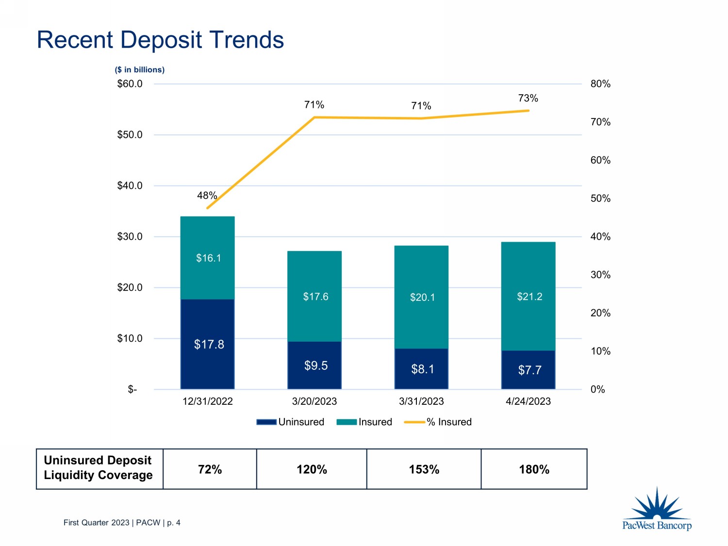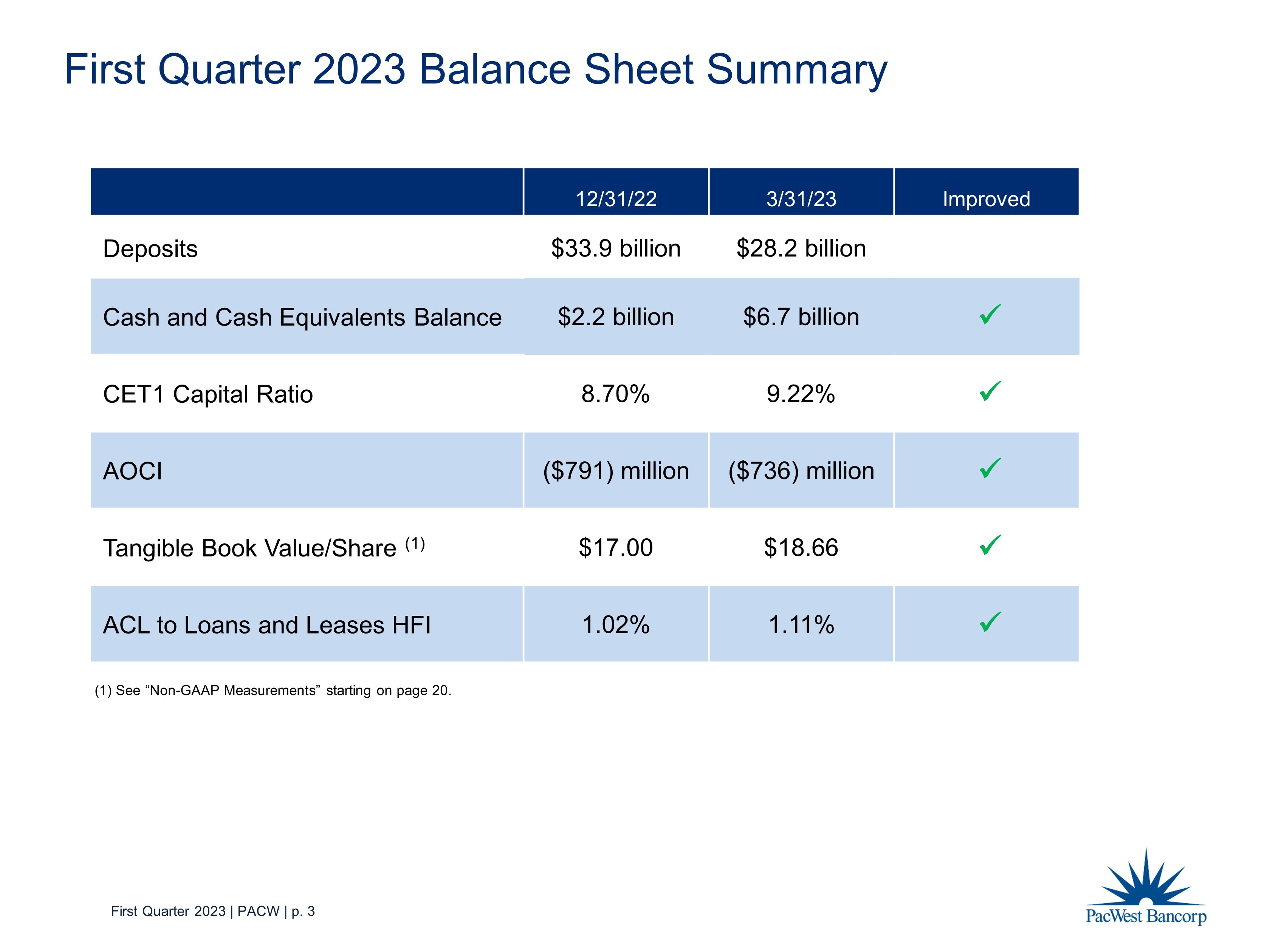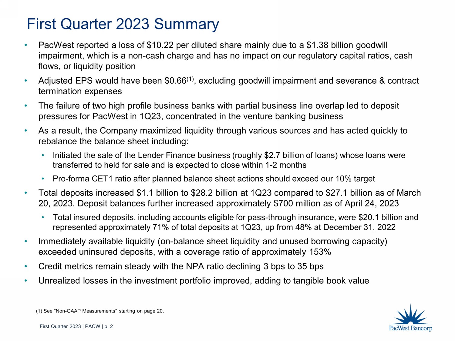 First Quarter 2023 | PACW | p. 2 • PacWest reported a loss of $10.22 per diluted share mainly due to a $1.38 billion goodwill impairment, which is a non - cash charge and has no impact on our regulatory capital ratios, cash flows, or liquidity position • Adjusted EPS would have been $ 0.66 (1) , excluding goodwill impairment and severance & contract termination expenses • The failure of two high profile business banks with partial business line overlap led to deposit pressures for PacWest in 1Q23, concentrated in the venture banking business • As a result, the Company maximized liquidity through various sources and has acted quickly to rebalance the balance sheet including: • Initiated the sale of the Lender Finance business (roughly $ 2.7 billion of loans) whose loans were transferred to held for sale and is expected to close within 1 - 2 months • Pro - forma CET1 ratio after planned balance sheet actions should exceed our 10% target • Total deposits increased $1.1 billion to $28.2 billion at 1Q23 compared to $27.1 billion as of March 20, 2023. Deposit balances further increased approximately $600 million as of April 21, 2023 • Total insured deposits, including accounts eligible for pass - through insurance, were $20.1 billion and represented approximately 71% of total deposits at 1Q23, up from 48% at December 31, 2022 • Immediately available liquidity (on - balance sheet liquidity and unused borrowing capacity) exceeded uninsured deposits, with a coverage ratio of approximately 153% • Credit metrics remain steady with the NPA ratio declining 3 bps to 35 bps • Unrealized losses in the investment portfolio improved, adding to tangible book value First Quarter 2023 Summary (1) See “Non - GAAP Measurements” starting on page 20.