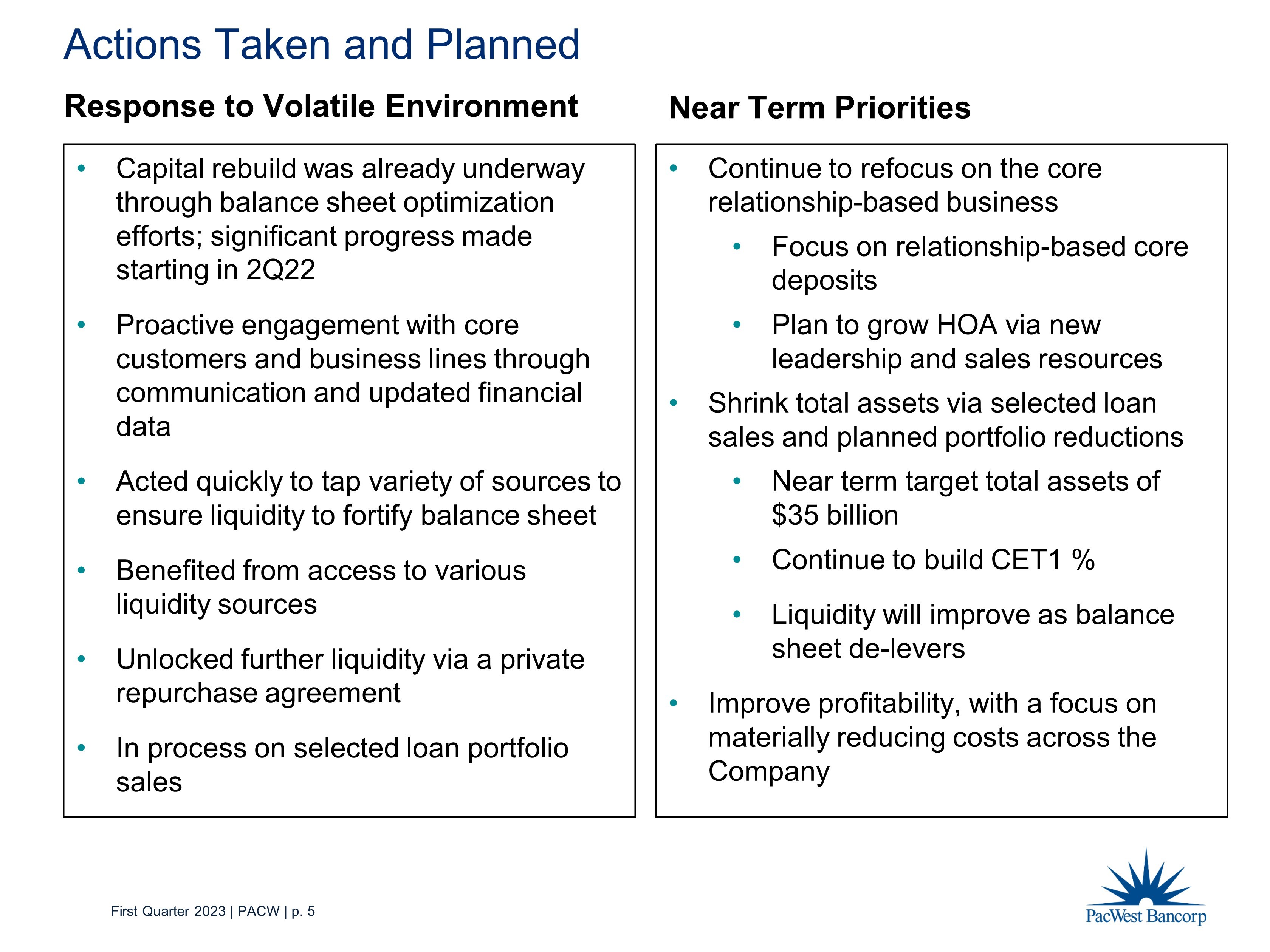 First Quarter 2023 | PACW | p. 4 Recent Deposit Trends $17.8 $9.5 $8.1 $7.7 $16.1 $17.6 $20.1 $21.1 48% 71% 71% 73% 0% 10% 20% 30% 40% 50% 60% 70% 80% $- $10.0 $20.0 $30.0 $40.0 $50.0 $60.0 12/31/2022 3/20/2023 3/31/2023 4/18/2023 Uninsured Insured % Insured Uninsured Deposit Liquidity Coverage 72% 120% 153% 182% ($ in billions)