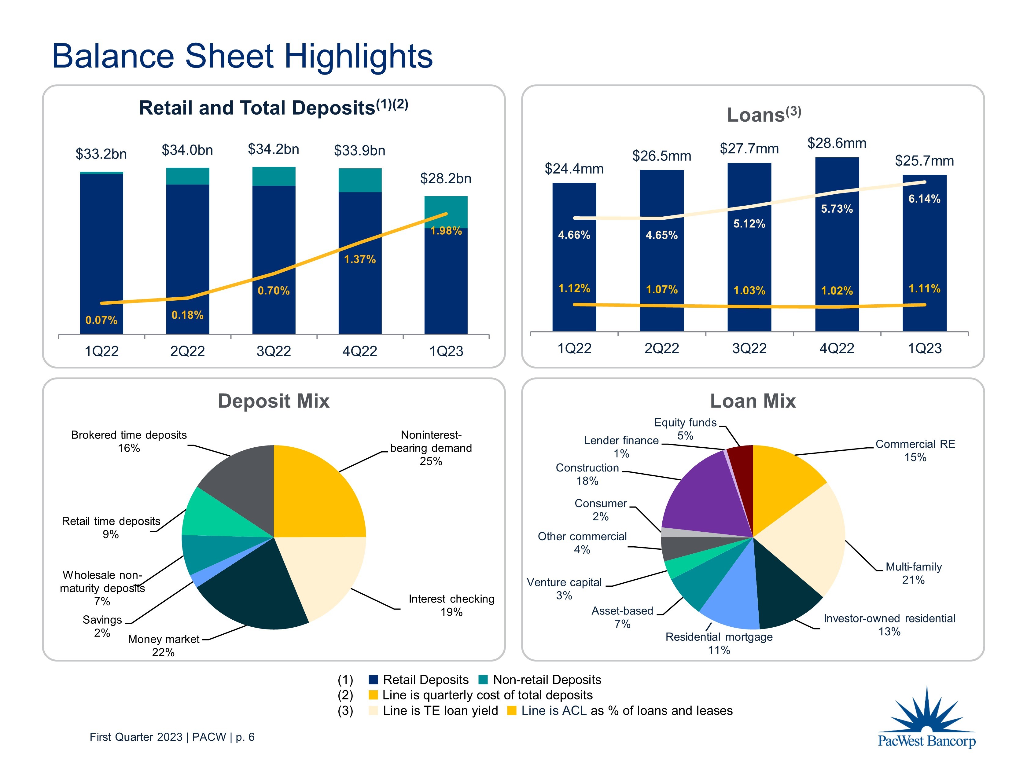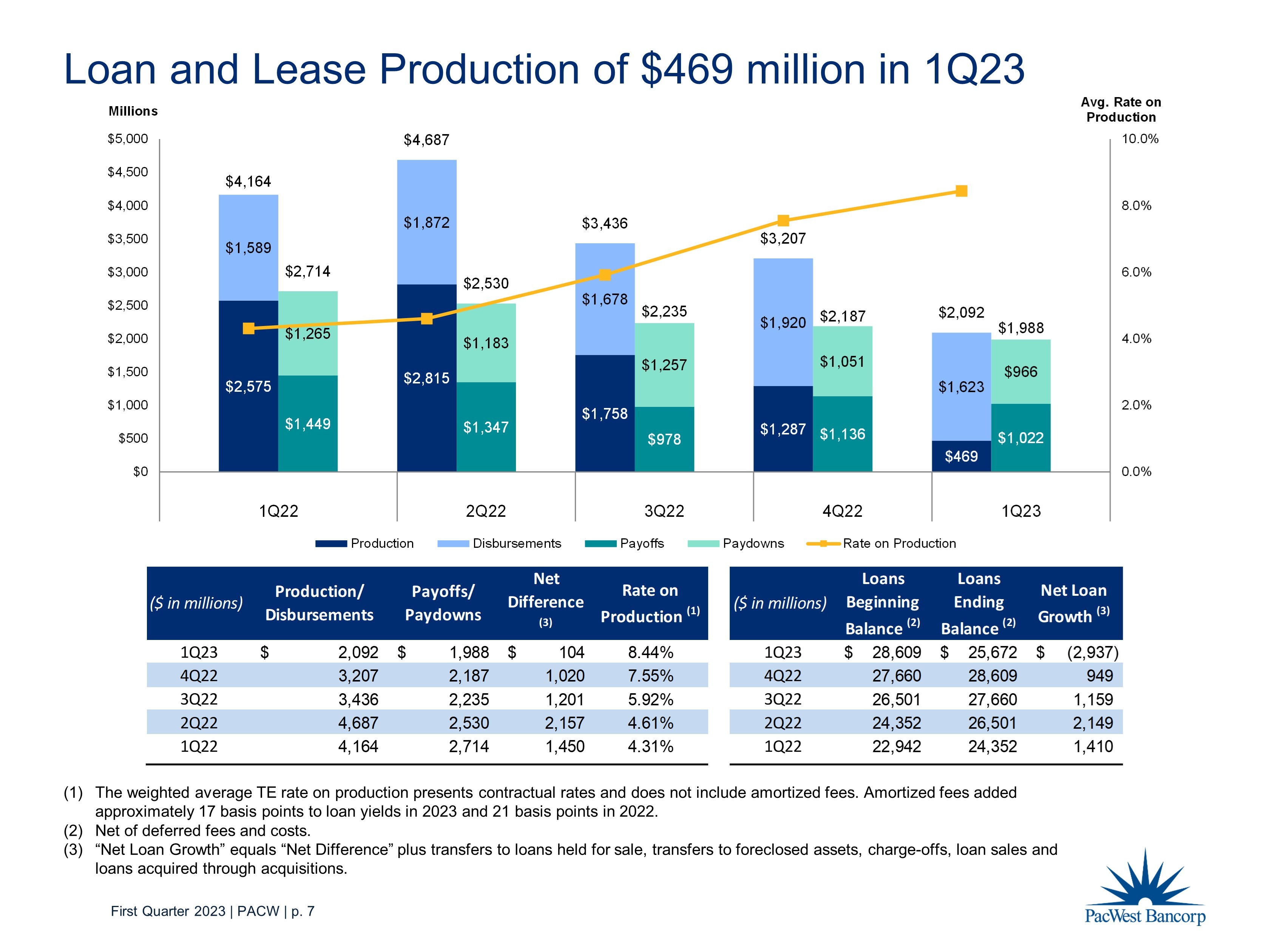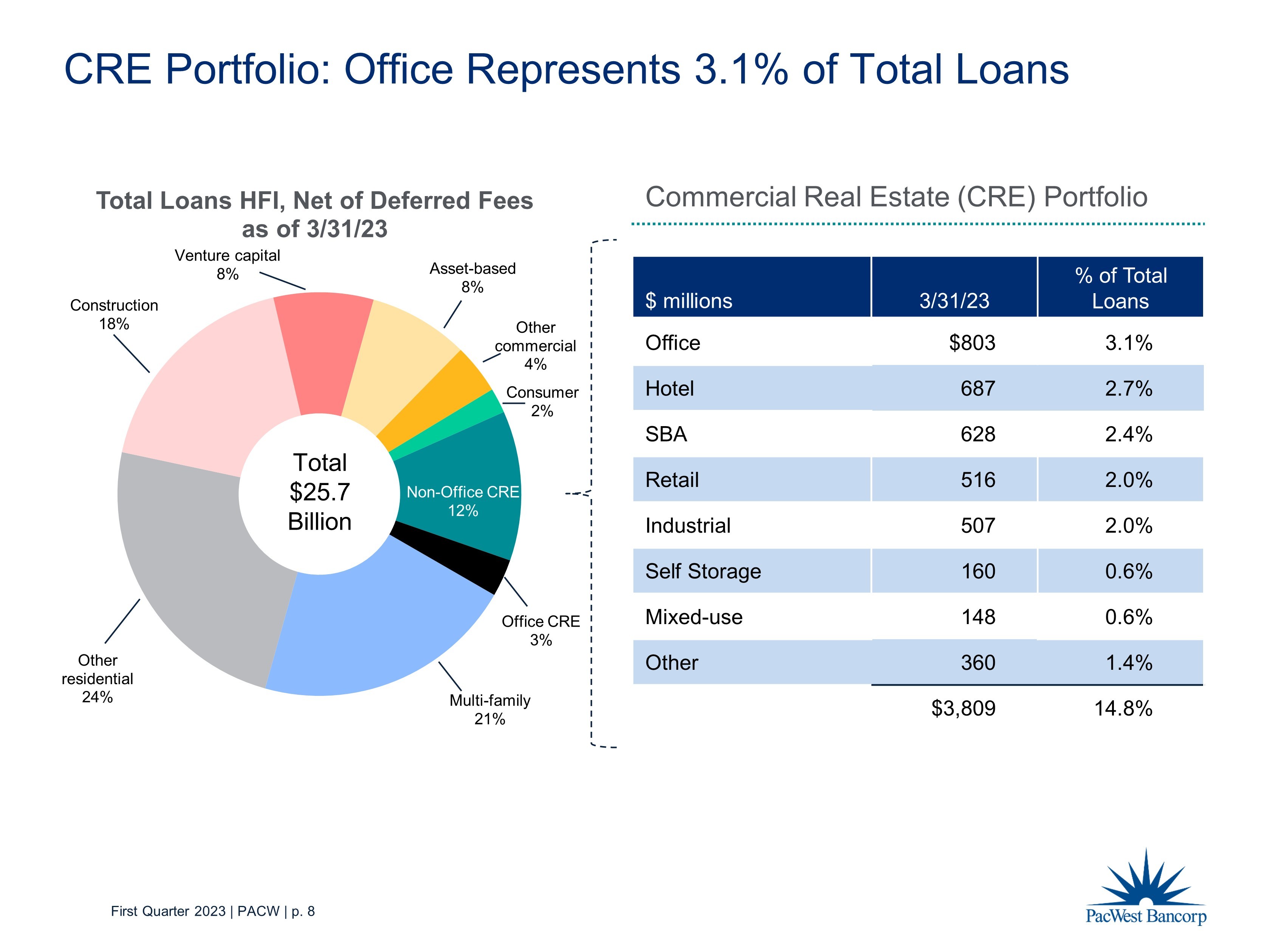 First Quarter 2023 | PACW | p. 7 ($ in millions) Production/ Disbursements Payoffs/ Paydowns Net Difference (3) Rate on Production (1) ($ in millions) Loans Beginning Balance (2) Loans Ending Balance (2) Net Loan Growth (3) 1Q23 2,092$ 1,988$ 104$ 8.44% 1Q23 28,609$ 25,672$ (2,937)$ 4Q22 3,207 2,187 1,020 7.55% 4Q22 27,660 28,609 949 3Q22 3,436 2,235 1,201 5.92% 3Q22 26,501 27,660 1,159 2Q22 4,687 2,530 2,157 4.61% 2Q22 24,352 26,501 2,149 1Q22 4,164 2,714 1,450 4.31% 1Q22 22,942 24,352 1,410 $2,575 $2,815 $1,758 $1,287 $469 $1,589 $1,872 $1,678 $1,920 $1,623 $1,449 $1,347 $978 $1,136 $1,022 $1,265 $1,183 $1,257 $1,051 $966 $4,164 $4,687 $3,436 $3,207 $2,092 $2,714 $2,530 $2,235 $2,187 $1,988 0.0% 2.0% 4.0% 6.0% 8.0% 10.0% $0 $500 $1,000 $1,500 $2,000 $2,500 $3,000 $3,500 $4,000 $4,500 $5,000 1Q22 2Q22 3Q22 4Q22 1Q23 Avg. Rate on Production Millions Production Disbursements Payoffs Paydowns Rate on Production Loan and Lease P roduction of $469 million in 1Q23 (1) The weighted average TE rate on production presents contractual rates and does not include amortized fees. Amortized fees add ed approximately 17 basis points to loan yields in 2023 and 21 basis points in 2022. (2) Net of deferred fees and costs. (3) “Net Loan Growth” equals “Net Difference” plus transfers to loans held for sale, transfers to foreclosed assets, charge - offs, loan sales and loans acquired through acquisitions.