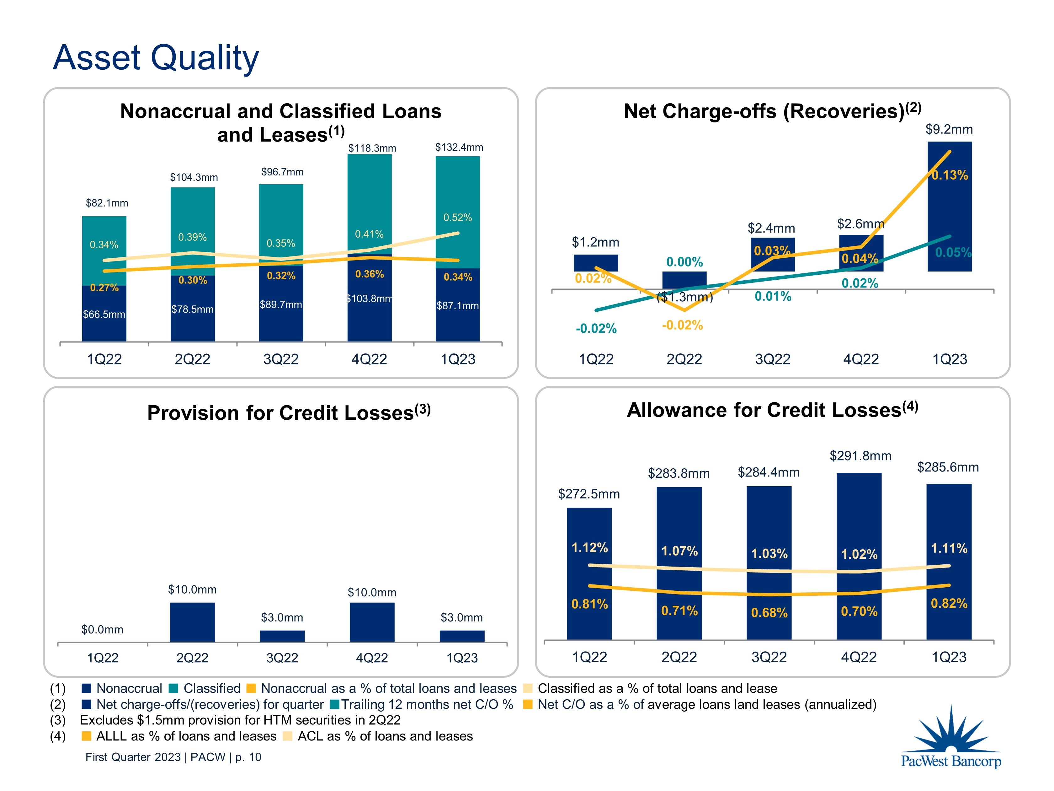 First Quarter 2023 | PACW | p. 9 $1,196 $1,033 $840 $803 $- $200 $400 $600 $800 $1,000 $1,200 $1,400 12/31/2020 12/31/2021 12/31/2022 1Q23 (Millions) Office - Not Owner-Occupied Office - Owner-Occupied Office CRE Portfolio Balances LTV for Top 15 Office CRE Loans (1) Geography • Managed balance down in recent years to $803 million • Majority of exposure in CA and CO markets • Weighted average LTV for top 15 loans – 50.6% (1) • Classified/Criticized as a % of recorded investment – 3.5% • Nonaccrual as a % of recorded investment – 2.5% • Average commitment – $5.5 million • 2023 remaining maturities – $ 187 million CA 79% NY 6% CO 9% Other 6% (1) LTV calculated using the most recent appraisals