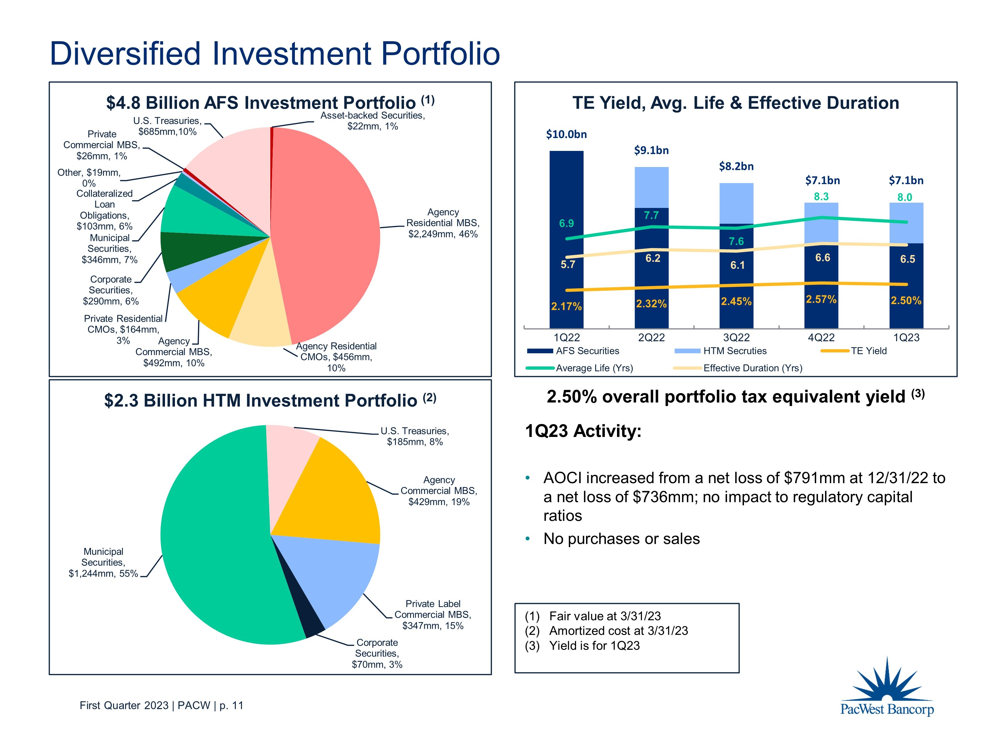 First Quarter 2023 | PACW | p. 11 $10.0bn $9.1bn $8.2bn $7.1bn $7.1bn 2.17% 2.32% 2.45% 2.57% 2.50% 6.9 7.7 7.6 8.3 8.0 5.7 6.2 6.1 6.6 6.5 1Q22 2Q22 3Q22 4Q22 1Q23 TE Yield, Avg. Life & Effective Duration AFS Securities HTM Secruties TE Yield Average Life (Yrs) Effective Duration (Yrs) Diversified Investment Portfolio (1) Fair value at 3/31/23 (2) Amortized cost at 3/31/23 (3) Yield is for 1Q23 Asset - backed Securities , $22mm , 1% Agency Residential MBS , $2,249mm , 46% Agency Residential CMOs , $456mm , 10% Agency Commercial MBS , $492mm , 10% Private Residential CMOs , $164mm , 3% Corporate Securities , $290mm , 6% Municipal Securities , $346mm , 7% Collateralized Loan Obligations , $103mm , 6% Other, $19mm , 0% Private Commercial MBS , $26mm , 1% U.S. Treasuries , $685mm ,10% $4.8 Billion AFS Investment Portfolio (1) 2.50% overall portfolio tax equivalent yield (3) 1Q23 Activity: • AOCI increased from a net loss of $791mm at 12/31/22 to a net loss of $736mm; no impact to regulatory capital ratios • No purchases or sales Agency Commercial MBS , $429mm , 19% Private Label Commercial MBS , $347mm , 15% Corporate Securities , $70mm , 3% Municipal Securities , $1,244mm , 55% U.S. Treasuries , $185mm , 8% $2.3 Billion HTM Investment Portfolio (2)