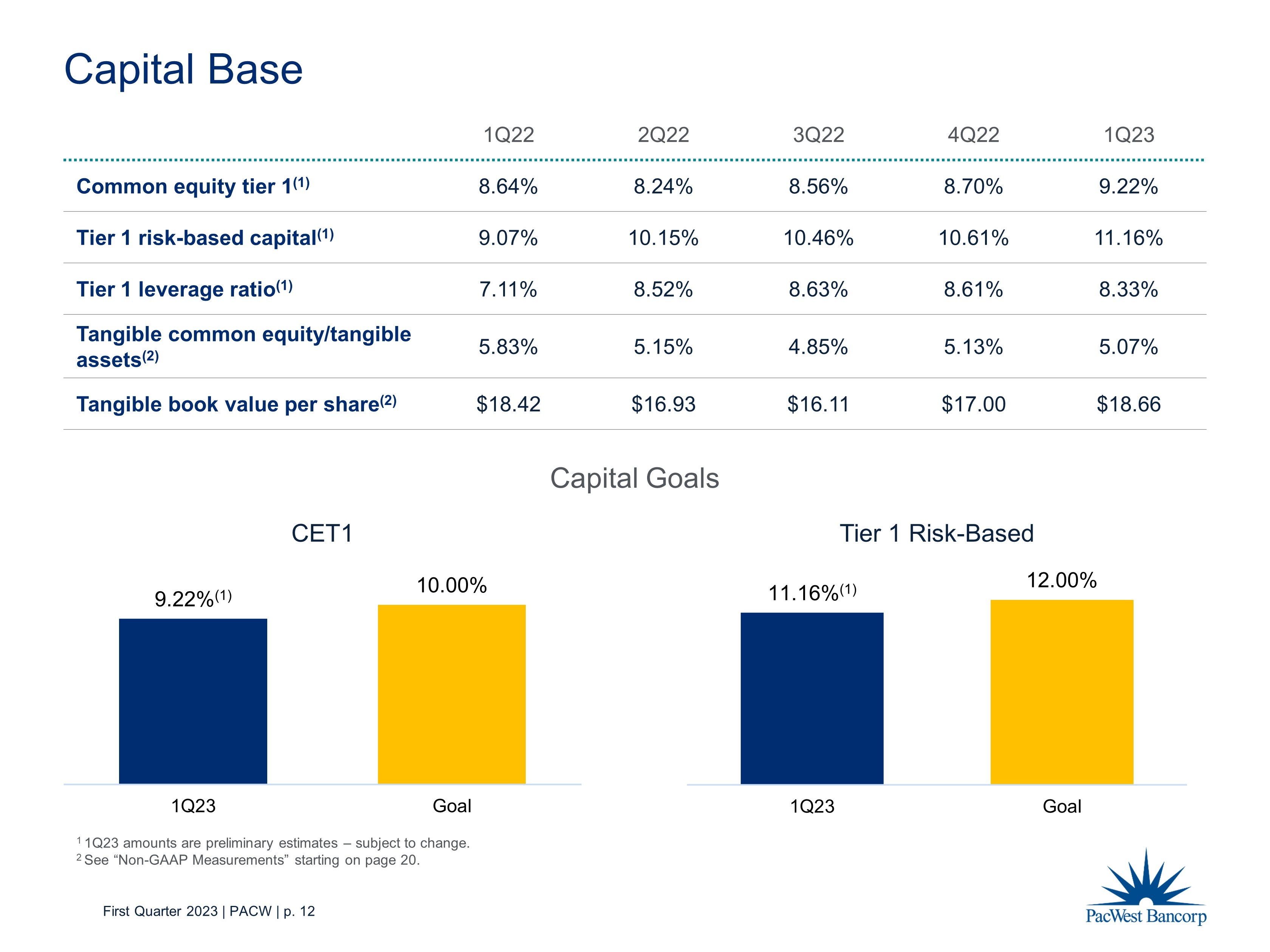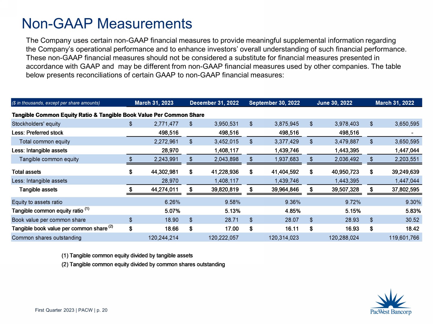 First Quarter 2023 | PACW | p. 20 Non - GAAP Measurements The Company uses certain non - GAAP financial measures to provide meaningful supplemental information regarding the Company’s operational performance and to enhance investors’ overall understanding of such financial performance. These non - GAAP financial measures should not be considered a substitute for financial measures presented in accordance with GAAP and may be different from non - GAAP financial measures used by other companies. The table below presents reconciliations of certain GAAP to non - GAAP financial measures: ($ in thousands, except per share amounts) March 31, 2023 December 31, 2022 September 30, 2022 June 30, 2022 March 31, 2022 Tangible Common Equity Ratio & Tangible Book Value Per Common Share Stockholders' equity 2,771,477$ 3,950,531$ 3,875,945$ 3,978,403$ 3,650,595$ Less: Preferred stock 498,516 498,516 498,516 498,516 - Total common equity 2,272,961 3,452,015$ 3,377,429$ 3,479,887$ 3,650,595$ Less: Intangible assets 28,970 1,408,117 1,439,746 1,443,395 1,447,044 Tangible common equity 2,243,991$ 2,043,898$ 1,937,683$ 2,036,492$ 2,203,551$ Total assets 44,302,981$ 41,228,936$ 41,404,592$ 40,950,723$ 39,249,639$ Less: Intangible assets 28,970 1,408,117 1,439,746 1,443,395 1,447,044 Tangible assets 44,274,011$ 39,820,819$ 39,964,846$ 39,507,328$ 37,802,595$ Equity to assets ratio 6.26% 9.58% 9.36% 9.72% 9.30% Tangible common equity ratio (1) 5.07% 5.13% 4.85% 5.15% 5.83% Book value per common share 18.90$ 28.71$ 28.07$ 28.93$ 30.52$ Tangible book value per common share (2) 18.66$ 17.00$ 16.11$ 16.93$ 18.42$ Common shares outstanding 120,244,214 120,222,057 120,314,023 120,288,024 119,601,766 (1) Tangible common equity divided by tangible assets (2) Tangible common equity divided by common shares outstanding