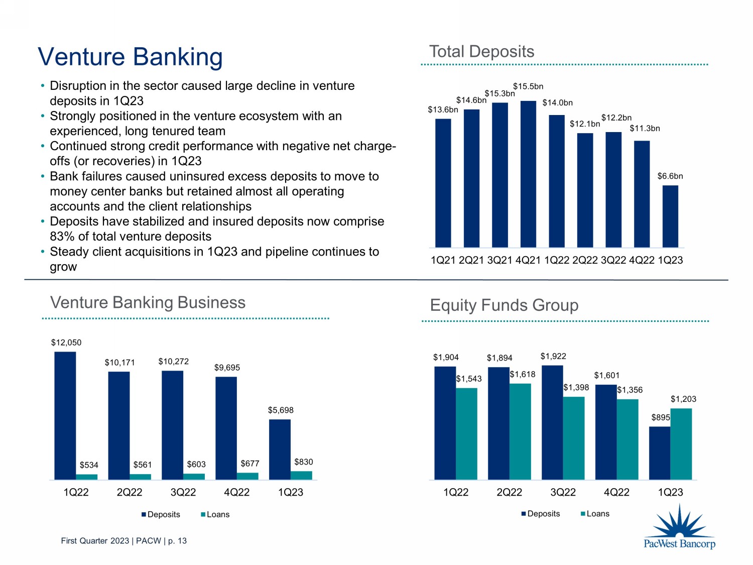 First Quarter 2023 | PACW | p. 13 $12,050 $10,171 $10,272 $9,695 $5,698 $534 $561 $603 $677 $830 1Q22 2Q22 3Q22 4Q22 1Q23 Deposits Loans Venture Banking Business Venture Banking $1,904 $1,894 $1,922 $1,601 $895 $1,543 $1,618 $1,398 $1,356 $1,203 1Q22 2Q22 3Q22 4Q22 1Q23 Deposits Loans Equity Funds Group Total Deposits $13.6bn $14.6bn $15.3bn $15.5bn $14.0bn $12.1bn $12.2bn $11.3bn $6.6bn 1Q21 2Q21 3Q21 4Q21 1Q22 2Q22 3Q22 4Q22 1Q23 • Disruption in the sector caused large decline in venture deposits in 1Q23 • Strongly positioned in the venture ecosystem with an experienced, long tenured team • Continued strong credit performance with negative net charge - offs (or recoveries) in 1Q23 • Bank failures caused uninsured excess deposits to move to money center banks but retained almost all operating accounts and the client relationships • Deposits have stabilized and insured deposits now comprise 83% of total venture deposits • Steady client acquisitions in 1Q23 and pipeline continues to grow