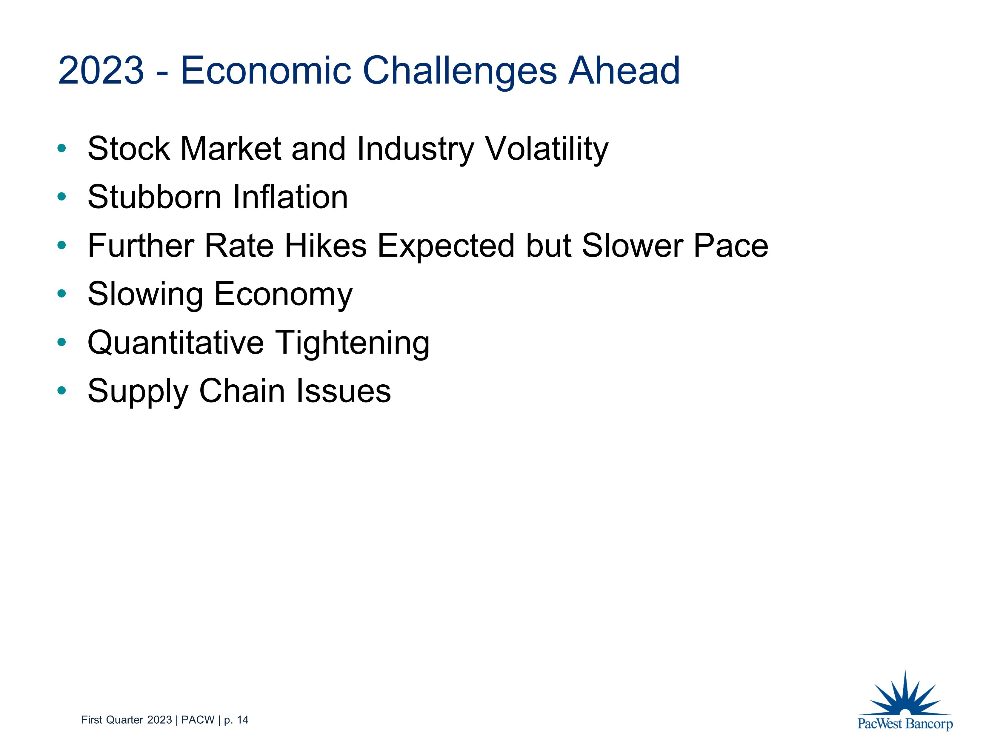 First Quarter 2023 | PACW | p. 14 2023 - Economic Challenges Ahead • Stock Market and Industry Volatility • Stubborn Inflation • Further Rate Hikes Expected but Slower Pace • Slowing Economy • Quantitative Tightening • Supply Chain Issues