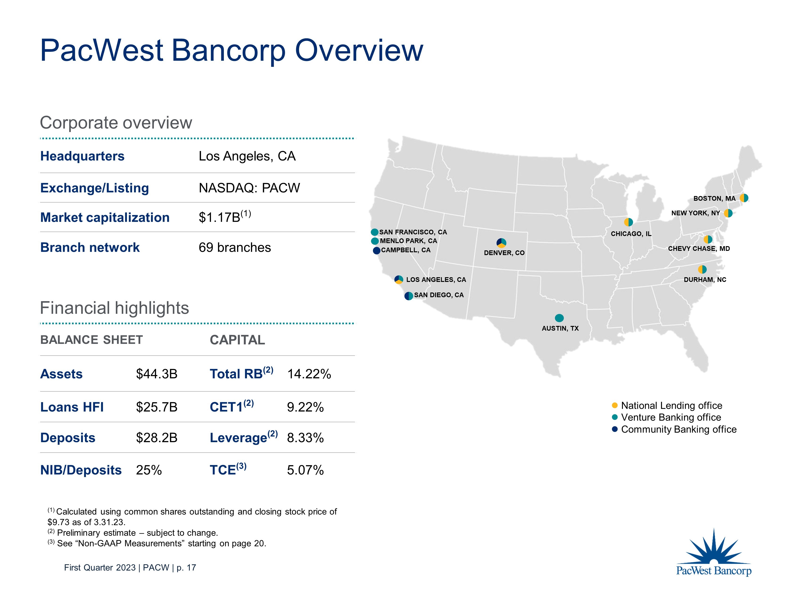 First Quarter 2023 | PACW | p. 17 PacWest Bancorp Overview Corporate overview Headquarters Los Angeles, CA Exchange/Listing NASDAQ: PACW Market capitalization $1.17B (1) Branch network 69 branches Financial highlights BALANCE SHEET CAPITAL Assets $ 44.3B Total RB (2) 14.22% Loans HFI $ 25.7B CET1 (2) 9.22% Deposits $28.2B Leverage (2) 8.33% NIB/Deposits 25% TCE (3) 5.07% National Lending office Venture Banking office Community Banking office (1) Calculated using common shares outstanding and closing stock price of $9.73 as of 3.31.23. (2) Preliminary estimate – subject to change. (3) See “Non - GAAP Measurements” starting on page 20. LOS ANGELES, CA DURHAM, NC CHEVY CHASE, MD CHICAGO, IL DENVER, CO NEW YORK, NY BOSTON, MA AUSTIN, TX CAMPBELL, CA MENLO PARK, CA SAN FRANCISCO, CA SAN DIEGO, CA