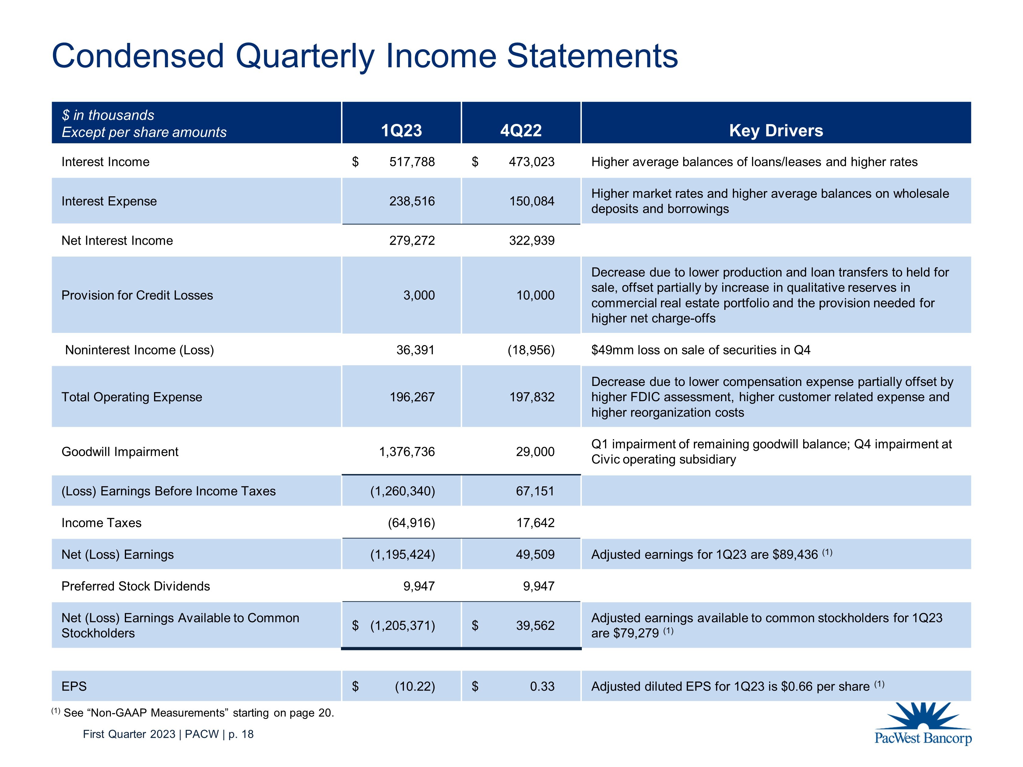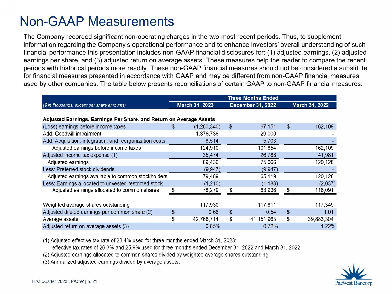 First Quarter 2023 | PACW | p. 21 ($ in thousands, except per share amounts) March 31, 2023 December 31, 2022 September 30, 2022 Adjusted Earnings, Earnings Per Share, and Return on Average Assets (Loss) earnings before income taxes (1,260,340)$ 67,151$ 162,109$ Add: Goodwill impairment 1,376,736 29,000 - Add: Acquisition, integration, and reorganization costs 8,514 5,703 - Adjusted earnings before income taxes 124,910 101,854 162,109 Adjusted income tax expense (1) 35,474 26,788 41,981 Adjusted earnings 89,436 75,066 120,128 Less: Preferred stock dividends (9,947) (9,947) - Adjusted earnings available to common stockholders 79,489 65,119 120,128 Less: Earnings allocated to unvested restricted stock (1,210) (1,183) (2,037) Adjusted earnings allocated to common shares 78,279$ 63,936$ 118,091$ Weighted average shares outstanding 117,930 117,811 117,349 Adjusted diluted earnings per common share (2) 0.66$ 0.54$ 1.01$ Average assets 42,768,714$ 41,151,963$ 39,883,304$ Adjusted return on average assets (3) 0.85% 0.72% 1.22% (1) Adjusted effective tax rate of 28.4% used for three months ended March 31, 2023; effective tax rates of 26.3% and 25.9% used for three months ended December 31, 2022 and March 31, 2022. (2) Adjusted earnings allocated to common shares divided by weighted average shares outstanding. (3) Annualized adjusted earnings divided by average assets. Three Months Ended Non - GAAP Measurements The Company recorded significant non - operating charges in the two most recent periods. Thus, to supplement information regarding the Company’s operational performance and to enhance investors’ overall understanding of such financial performance this presentation includes non - GAAP financial disclosures for: (1) adjusted earnings, (2) adjusted earnings per share, and (3) adjusted return on average assets. These measures help the reader to compare the recent periods with historical periods more readily. These non - GAAP financial measures should not be considered a substitute for financial measures presented in accordance with GAAP and may be different from non - GAAP financial measures used by other companies. The table below presents reconciliations of certain GAAP to non - GAAP financial measures: