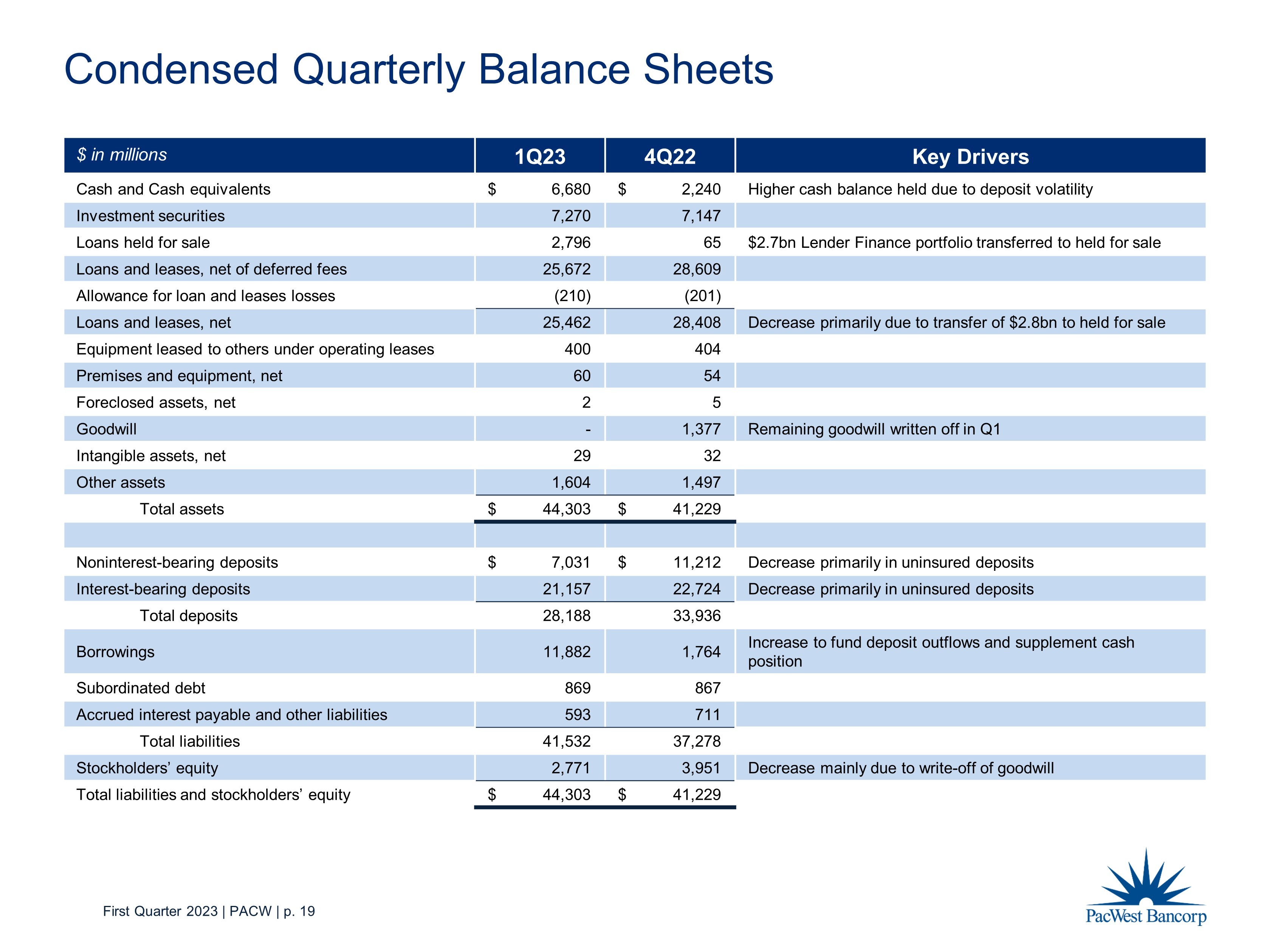 First Quarter 2023 | PACW | p. 19 Condensed Quarterly Balance Sheets $ in millions 1Q23 4Q22 Key Drivers Cash and Cash equivalents $ 6,680 $ 2,240 Higher cash balance held due to deposit volatility Investment securities 7,270 7,147 Loans held for sale 2,796 65 $2.7bn Lender Finance portfolio transferred to held for sale Loans and leases, net of deferred fees 25,672 28,609 Allowance for loan and lease s losses (210) (201) Loans and leases, net 25,462 28,408 Decrease primarily due to transfer of $2.8bn to held for sale Equipment leased to others under operating leases 400 404 Premises and equipment, net 60 54 Foreclosed assets, net 2 5 Goodwill - 1,377 Remaining goodwill written off in Q1 Intangible assets, net 29 32 Other assets 1,604 1,497 Total assets $ 44,303 $ 41,229 Noninterest - bearing deposits $ 7,031 $ 11,212 Decrease primarily in uninsured deposits Interest - bearing deposits 21,157 22,724 Decrease primarily in uninsured deposits Total deposits 28,188 33,936 Borrowings 11,882 1,764 Increase to fund deposit outflows and supplement cash position Subordinated debt 869 867 Accrued interest payable and other liabilities 593 711 Total liabilities 41,532 37,278 Stockholders’ equity 2,771 3,951 Decrease mainly due to write - off of goodwill Total liabilities and stockholders’ equity $ 44,303 $ 41,229