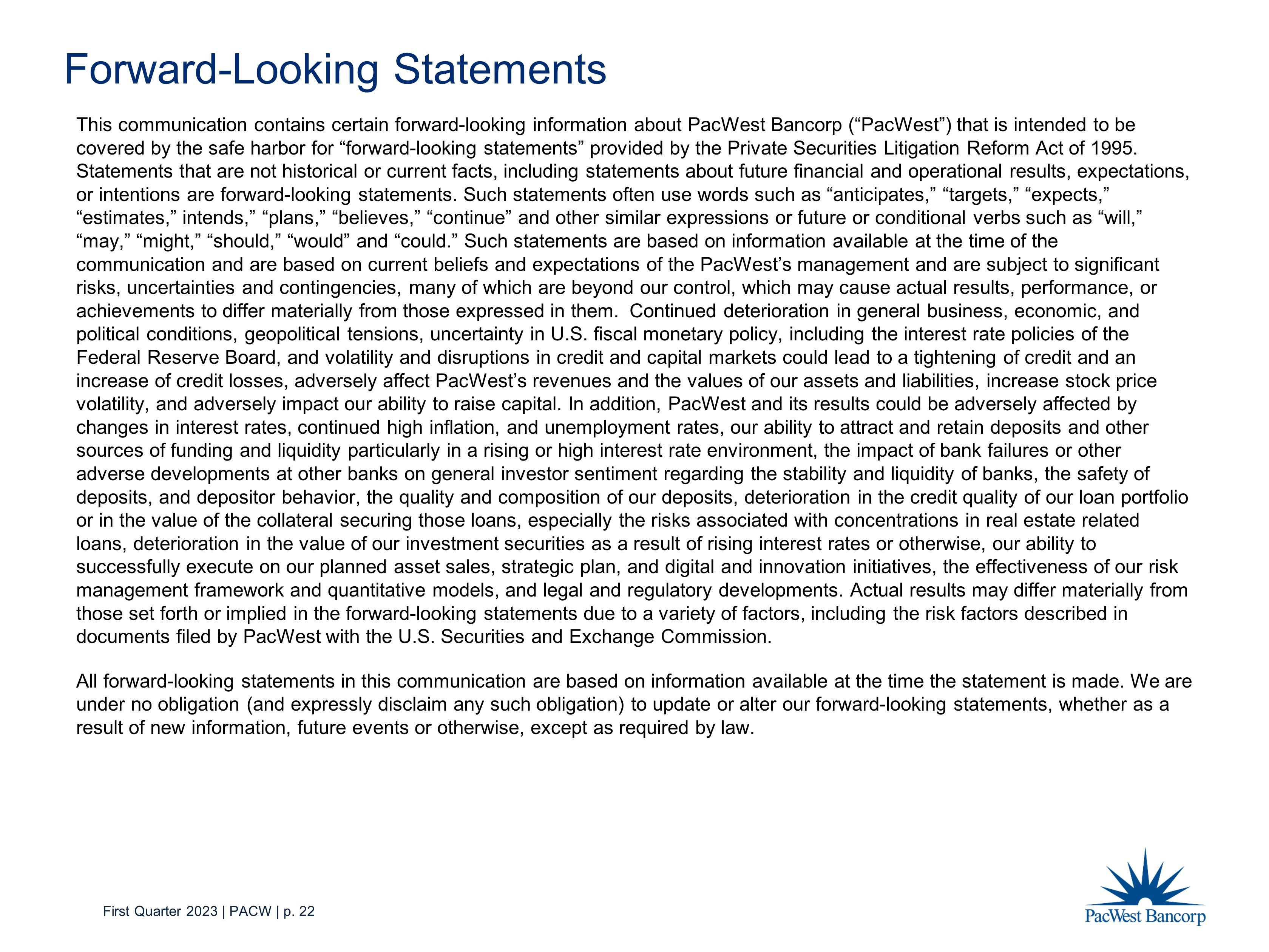 First Quarter 2023 | PACW | p. 22 Forward - Looking Statements This communication contains certain forward - looking information about PacWest Bancorp (“PacWest”) that is intended to be covered by the safe harbor for “forward - looking statements” provided by the Private Securities Litigation Reform Act of 1995. Statements that are not historical or current facts, including statements about future financial and operational results, exp ect ations, or intentions are forward - looking statements. Such statements often use words such as “anticipates,” “targets,” “expects,” “estimates,” intends,” “plans,” “believes,” “continue” and other similar expressions or future or conditional verbs such as “ wil l,” “may,” “might,” “should,” “would” and “could.” Such statements are based on information available at the time of the communication and are based on current beliefs and expectations of the PacWest’s management and are subject to significant risks, uncertainties and contingencies, many of which are beyond our control, which may cause actual results, performance, or achievements to differ materially from those expressed in them. Continued deterioration in general business, economic, and political conditions, geopolitical tensions, uncertainty in U.S. fiscal monetary policy, including the interest rate policies of the Federal Reserve Board, and volatility and disruptions in credit and capital markets could lead to a tightening of credit and an increase of credit losses, adversely affect PacWest’s revenues and the values of our assets and liabilities, increase stock p ric e volatility, and adversely impact our ability to raise capital. In addition, PacWest and its results could be adversely affect ed by changes in interest rates, continued high inflation, and unemployment rates, our ability to attract and retain deposits and o the r sources of funding and liquidity particularly in a rising or high interest rate environment, the impact of bank failures or o the r adverse developments at other banks on general investor sentiment regarding the stability and liquidity of banks, the safety of deposits, and depositor behavior, the quality and composition of our deposits, deterioration in the credit quality of our loa n p ortfolio or in the value of the collateral securing those loans, especially the risks associated with concentrations in real estate re lat ed loans, deterioration in the value of our investment securities as a result of rising interest rates or otherwise, our ability to successfully execute on our planned asset sales, strategic plan, and digital and innovation initiatives, the effectiveness of ou r risk management framework and quantitative models, and legal and regulatory developments. Actual results may differ materially from those set forth or implied in the forward - looking statements due to a variety of factors, including the risk factors described i n documents filed by PacWest with the U.S. Securities and Exchange Commission. All forward - looking statements in this communication are based on information available at the time the statement is made. We are under no obligation (and expressly disclaim any such obligation) to update or alter our forward - looking statements, whether as a result of new information, future events or otherwise, except as required by law .