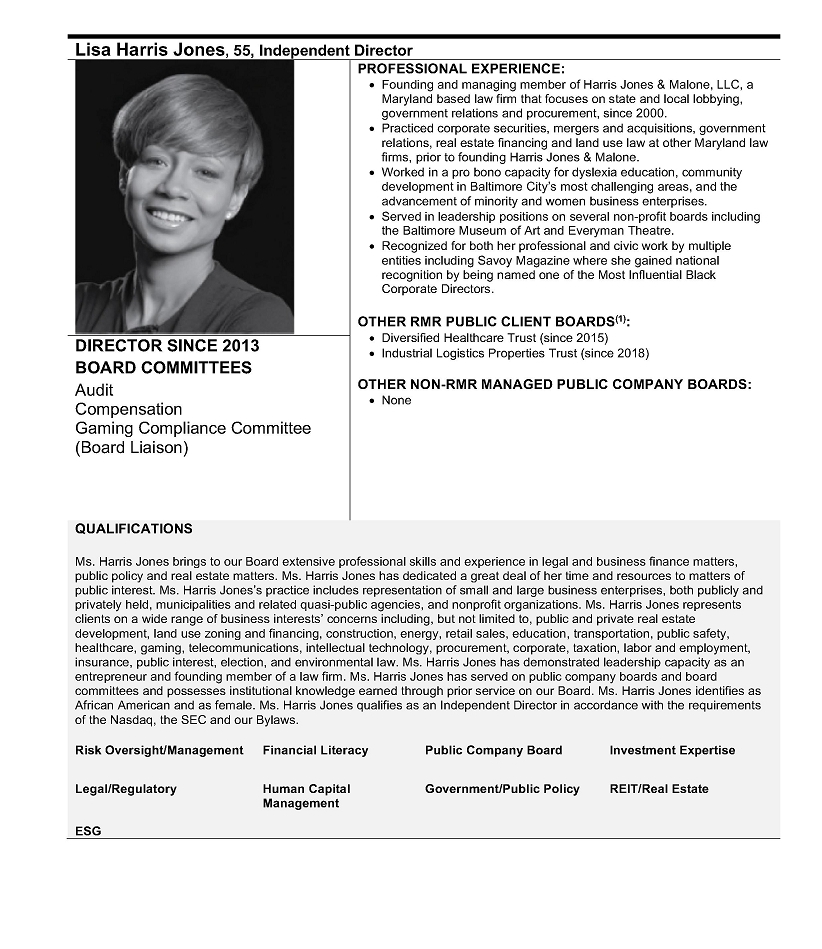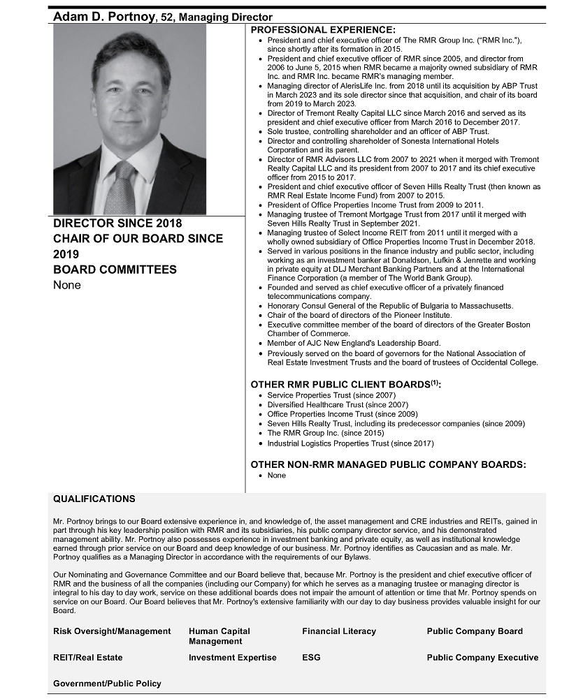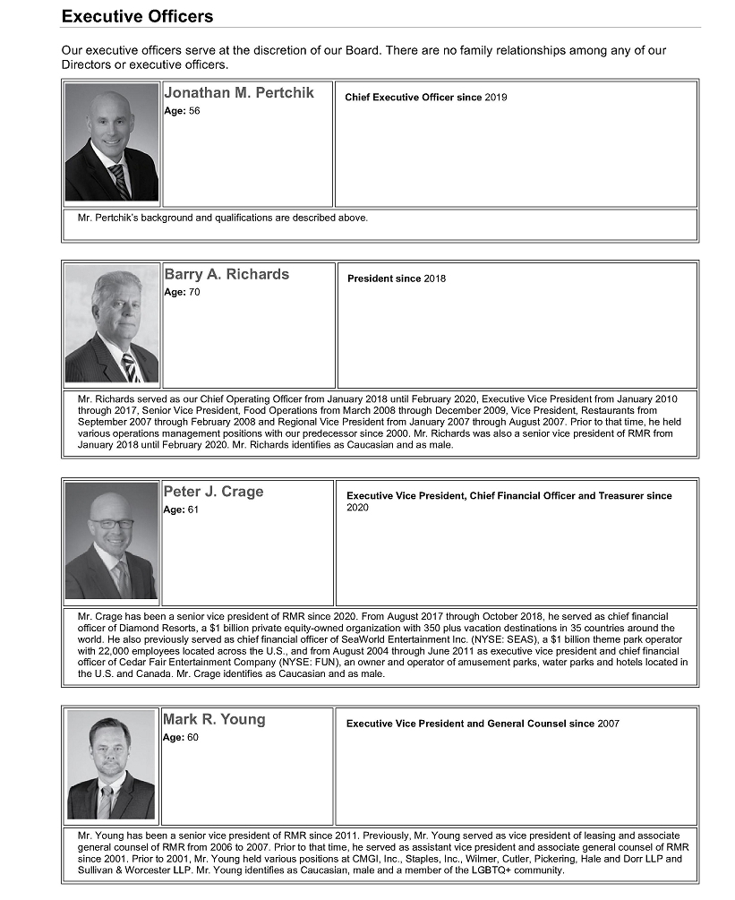 Relationships with RMR and Others Related to It. We have relationships and historical and continuing transactions with SVC, RMR, RMR Inc., and others related to them, including Other RMR Clients and some of which have directors, trustees or officers who are also our Directors or officers. The Chair of our Board and one of our Managing Directors, Adam D. Portnoy, is the sole trustee, an officer and the controlling shareholder of ABP Trust, which is the controlling shareholder of RMR Inc., the chair of the board, a managing director and the president and chief executive officer of RMR Inc. and an officer and employee of RMR. Jonathan M. Pertchik, our other Managing Director and Chief Executive Officer, also serves as an officer and employee of RMR. Our Executive Vice President, Chief Financial Officer and Treasurer, Executive Vice President and General Counsel, and Secretary are officers and employees of RMR. Some of our Independent Directors also serve as independent trustees or independent directors of Other RMR Clients. RMR Inc. is the managing member of RMR. Mr. Portnoy also serves as the chair of the boards and as a managing trustee of each of the Other RMR Clients, including serving as the chair of the board of trustees and as a managing trustee of SVC. Mr. Portnoy is the largest owner and a director of Sonesta International Hotels Corporation (“Sonesta”) and Sonesta is SVC’s largest hotel operator. One of Sonesta’s other directors serves as RMR’s and RMR Inc.’s executive vice president, general counsel and secretary and as our Secretary. Sonesta’s other director, president and chief executive officer is a managing trustee and the former president and chief executive officer of SVC and an officer of RMR. Certain other officers and employees of Sonesta are former officers and employees of RMR. RMR provides management services to both the Company and SVC and provides certain services to Sonesta.
