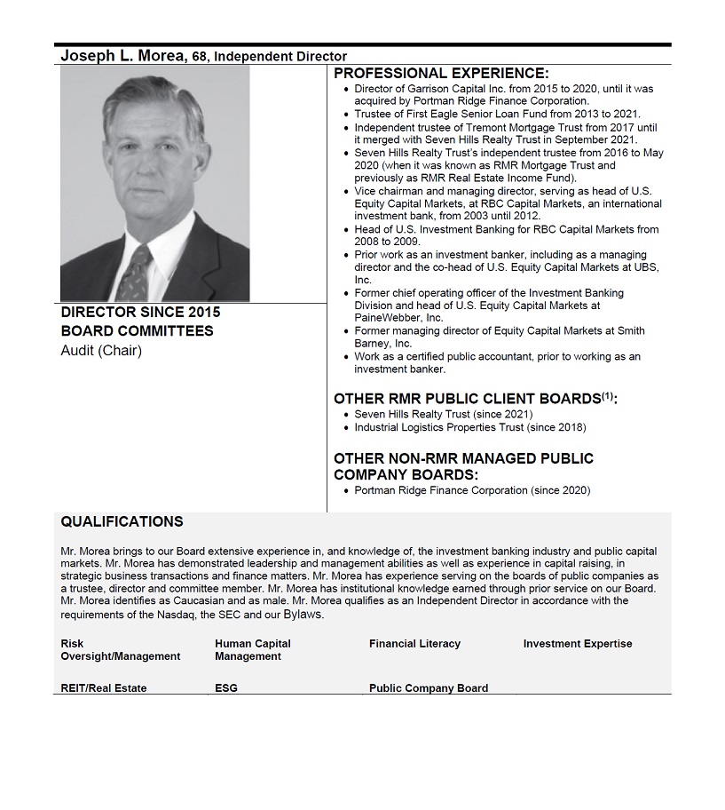 Our Board affirmatively determines whether Directors have a direct or indirect material relationship with us, including our subsidiaries, other than serving as our Directors or trustees or directors of our subsidiaries. In making independence determinations, our Board observes the Nasdaq and SEC criteria, as well as the criteria set forth in our governing documents. When assessing a Director’s relationship with us, our Board considers all relevant facts and circumstances, not merely from the Director’s standpoint, but also from that of the persons or organizations with which the Director has an affiliation. Based on our Board’s review, our Board has determined that Barbara D. Gilmore, Lisa Harris Jones, Joseph L. Morea, Rajan C. Penkar and Elena B. Poptodorova currently qualify as independent directors under applicable Nasdaq and SEC criteria and as Independent Directors under our Bylaws. In making these independence determinations, our Board reviewed and discussed additional information provided by us and our Directors with regard to each of the Directors’ relationships with us, RMR or RMR Inc., the managing member of RMR, and the Other RMR Clients, including, for example, relevant information related to Mr. Penkar’s service as a director of USA Truck. Our Board determined that our business with USA Truck is not material to us and that Mr. Penkar’s service on the board of directors of USA Truck did not create a conflict of interest or impair Mr. Penkar’s judgment with respect to his responsibilities as an Independent Director. Our Board has concluded that none of these five Directors possessed or currently possesses any relationship that could impair her or his judgment in connection with her or his duties and responsibilities as a Director or that could otherwise be a direct or indirect material relationship under applicable Nasdaq and SEC standards.