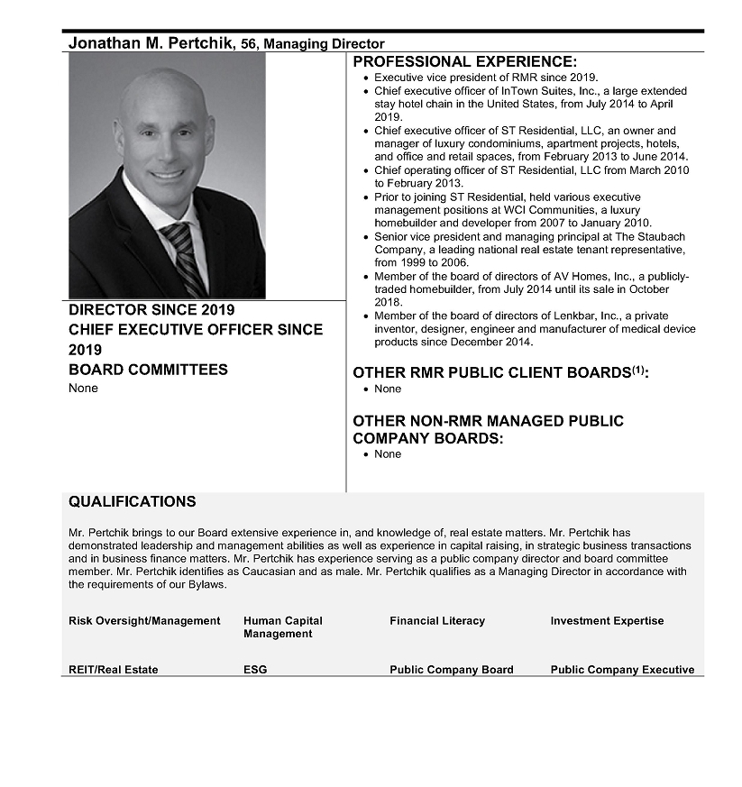 Messrs. Pertchik, Crage and Young also received equity awards from RMR Inc. and from the other public clients of RMR (the “Other RMR Clients”) and cash compensation from RMR, which cash amount reflected the 20% of their total cash compensation paid to them by us and RMR. The equity awards from RMR Inc. and the Other RMR Clients are determined by the compensation committees of RMR Inc. and the Other RMR Clients, respectively, which are comprised solely of independent board members.
