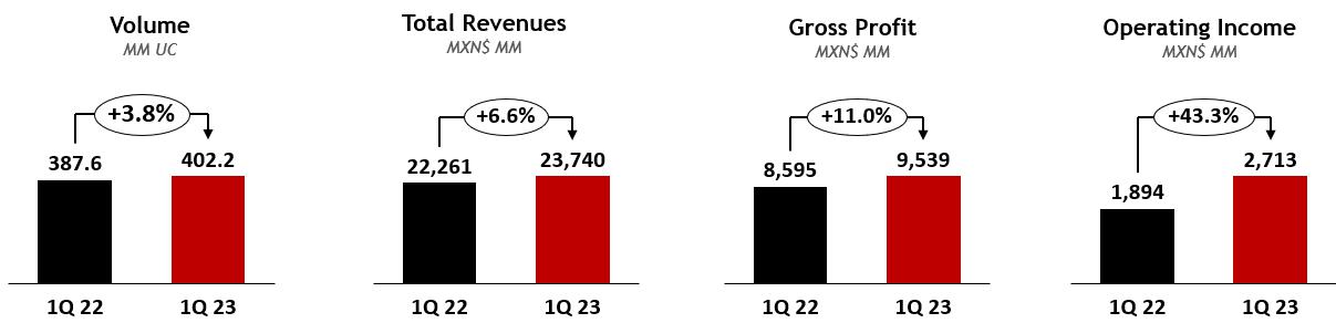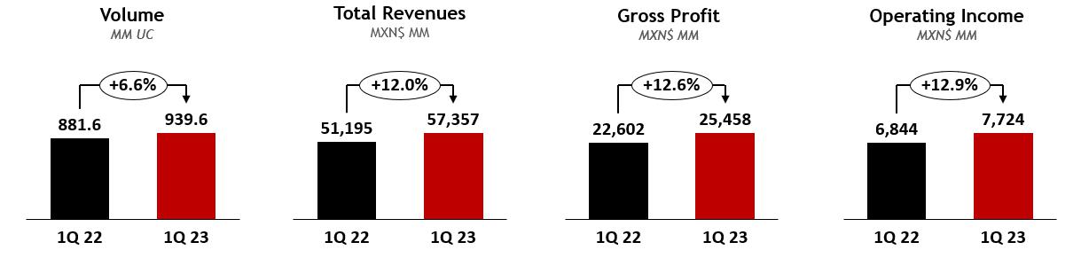 | · | At the end of last year, Coca-Cola FEMSA acquired Cristal bulk water business from Embotelladoras Bepensa in the southeast region of Mexico. The results from this acquisition for the first quarter of 2023 include 15.1 million unit cases. As a result, excluding these volumes, consolidated volumes would have increased 4.9%. |
