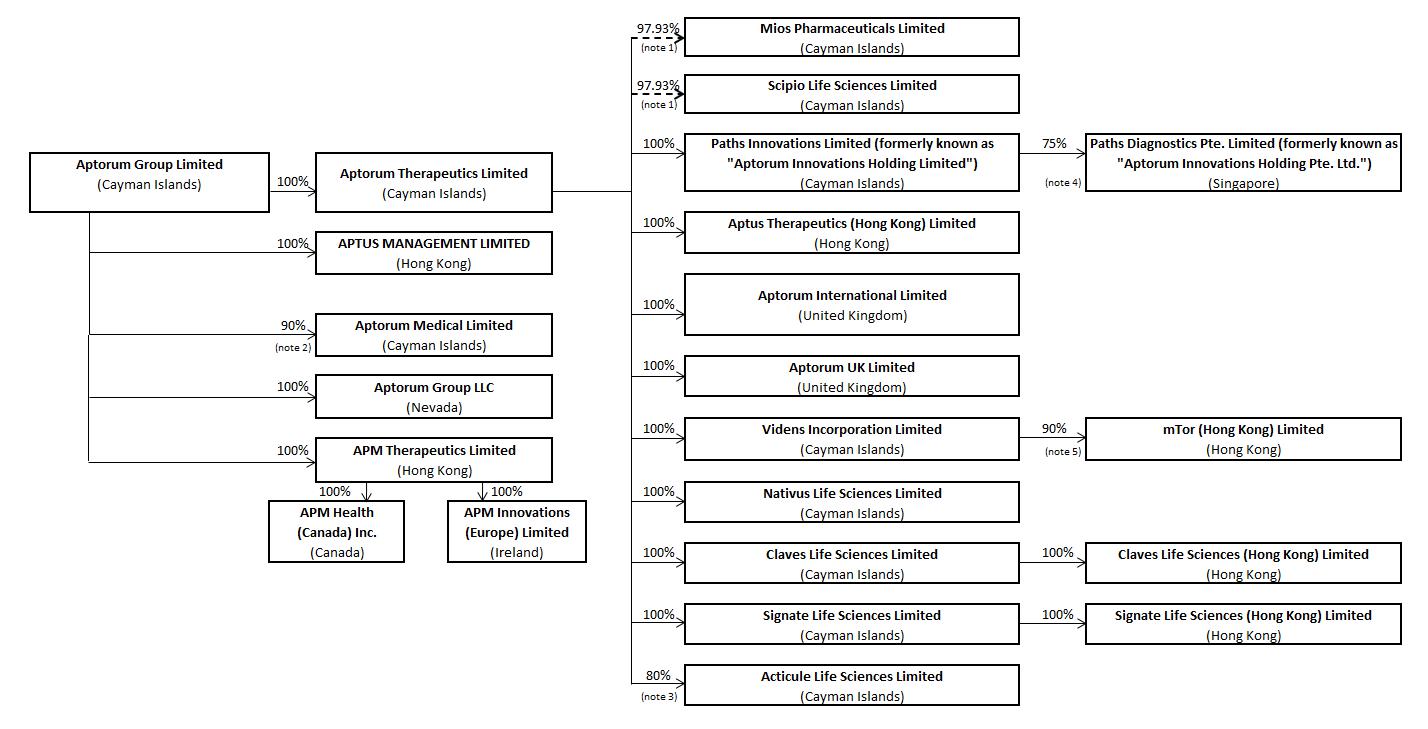 | ● | “Aptorum Therapeutics Group” refers to the Company’s therapeutics segment that is operated through its wholly-owned subsidiary, Aptorum Therapeutics Limited, a Cayman Islands exempted company with limited liability, whose principal place of business is in Hong Kong and its indirect subsidiary companies, whose principal places of business are in the United Kingdom, Singapore and Hong Kong. | |