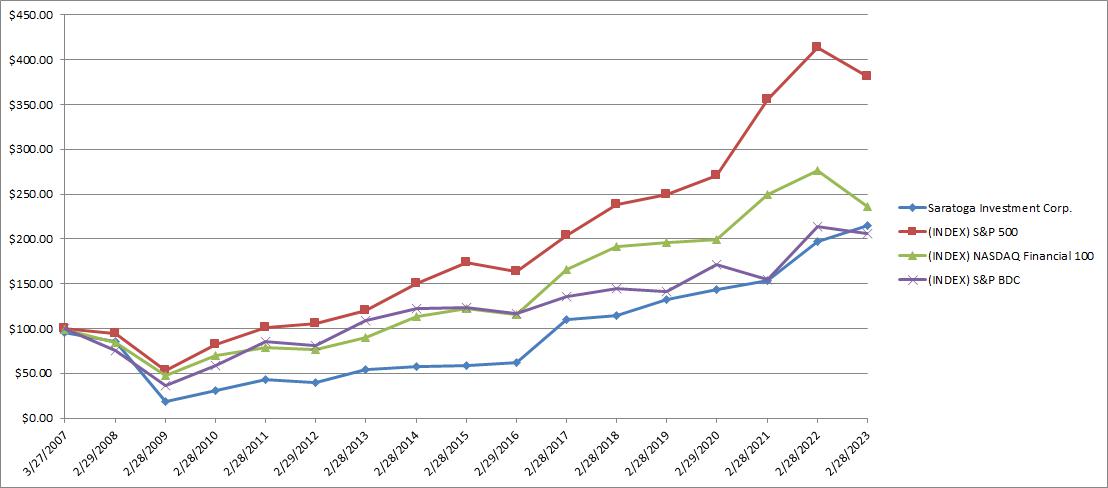 As of February 28, 2023, we had total assets of $1,078.2 million and investments in 49 portfolio companies, excluding an investment in the subordinated notes of one collateralized loan obligation fund, Saratoga Investment Corp. CLO 2013-1, Ltd. (“Saratoga CLO”), which had a fair value of $21.2 million as of February 28, 2023, investments in the Class F-2-R-3 Note of the Saratoga CLO which as of February 28, 2023 had a fair value of $8.8 million, and investments in the Saratoga Senior Loan Fund I JV LLC (“SLF JV”) and its subsidiaries, a joint venture which as of February 28, 2023 had a fair value of $42.1 million. The overall portfolio composition as of February 28, 2023 consisted of 82.1% of first lien term loans, 1.5% of second lien term loans, 2.1% of unsecured loans, 4.3% of structured finance securities and 10.0% of equity interests. As of February 28, 2023, the weighted average yield on all of our investments, including our investment in the subordinated notes of Saratoga CLO and Class F-2-R-3 Note was approximately 12.1%. The weighted average yield of our investments is not the same as a return on investment for our stockholders and, among other things, is calculated before the payment of our fees and expenses. As of February 28, 2023, our total return based on market value was 10.35% and our total return based on net asset value (“NAV”) per share was 9.46%. As of February 28, 2022, our total return based on market value was 28.19% and our total return based on NAV was 15.88%. Total return based on market value is the change in the ending market value of the Company’s common stock plus dividends distributed during the period assuming participation in the Company’s dividend reinvestment plan divided by the beginning market value of the Company’s common stock. Total return based on NAV is the change in ending NAV per share plus dividends distributed per share paid during the period assuming participation in the Company’s dividend reinvestment plan divided by the beginning NAV per share. While total return based on NAV and total return based on market value reflect fund expenses, they do not reflect any sales load that may be paid by investors. As of February 28, 2023, approximately 96.94% of our first lien debt investments were fully collateralized in the sense that the portfolio companies in which we held such investments had an enterprise value or our investment had an asset coverage equal to or greater than the principal amount of the related debt investment. The Company uses enterprise value to assess the level of collateralization of its portfolio companies. The enterprise value of a portfolio company is determined by analyzing various factors, including EBITDA, cash flows from operations less capital expenditures and other pertinent factors, such as recent offers to purchase a portfolio company’s securities or other liquidation events. As a result, while we consider a portfolio company to be collateralized if its enterprise value exceeds the amount of our loan, we do not hold tangible assets as collateral in our portfolio companies that we would obtain in the event of a default. Our investment in the subordinated notes of Saratoga CLO represents a first loss position in a portfolio that, at February 28, 2023, was composed of $658.0 million in aggregate principal amount of predominantly senior secured first lien term loans. A first loss position means that we will suffer the first economic losses if losses are incurred on loans held by the Saratoga CLO. As a result, this investment is subject to unique risks. See Part I. Item 1A. “Risk Factors—Our investment in Saratoga CLO constitutes a leveraged investment in a portfolio of predominantly senior secured first lien term loans and is subject to additional risks and volatility.”