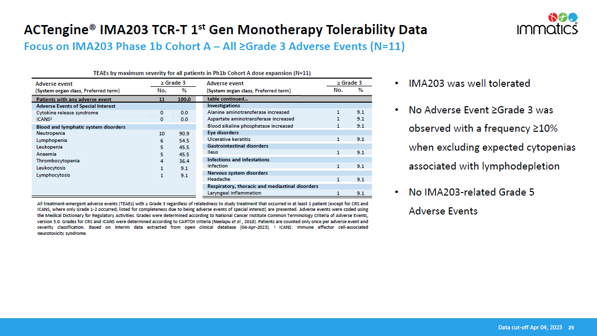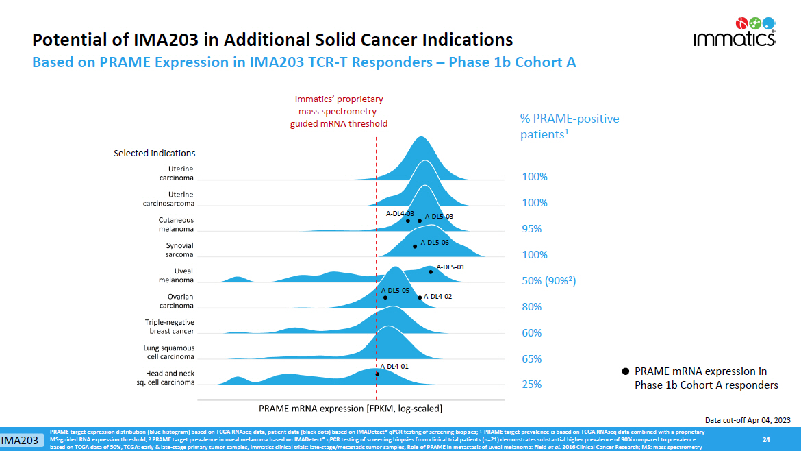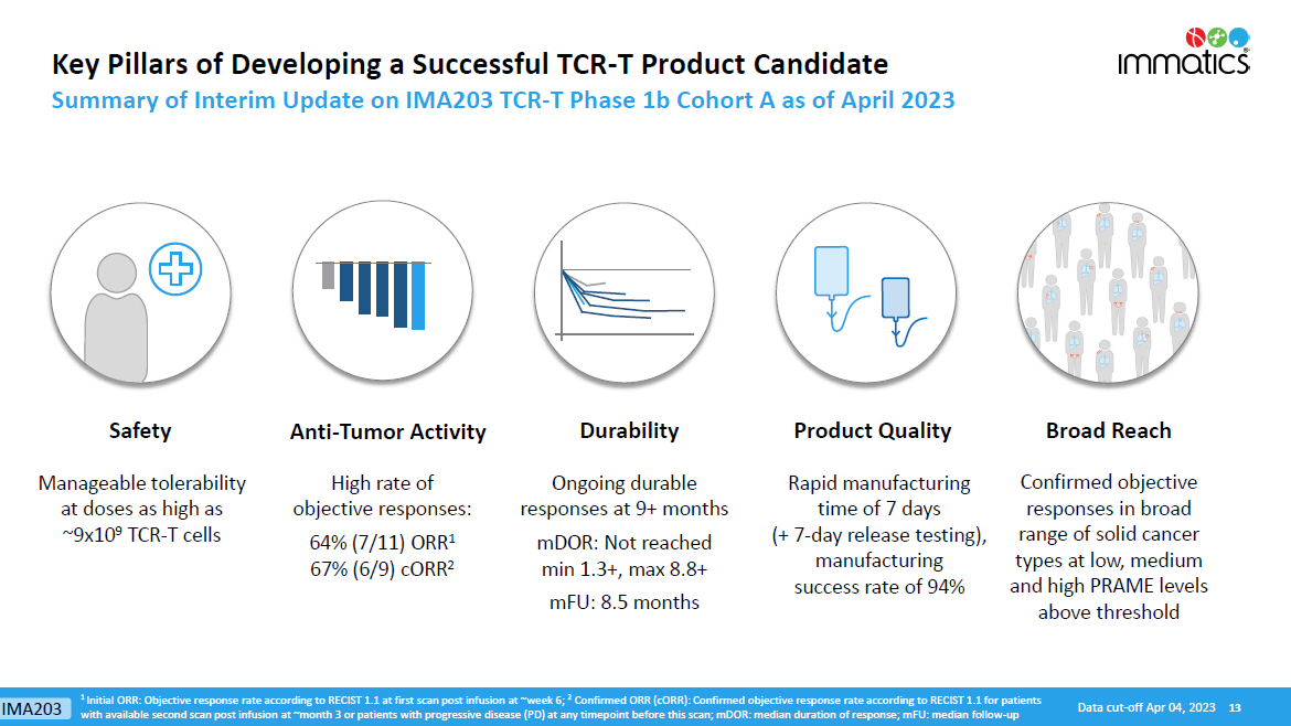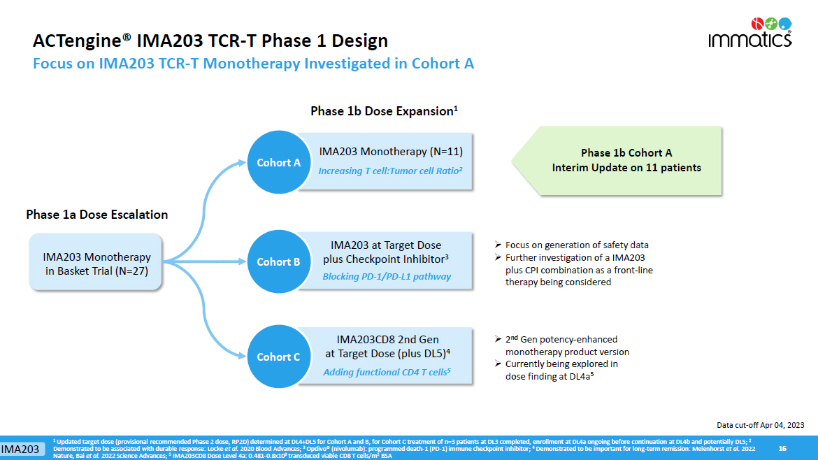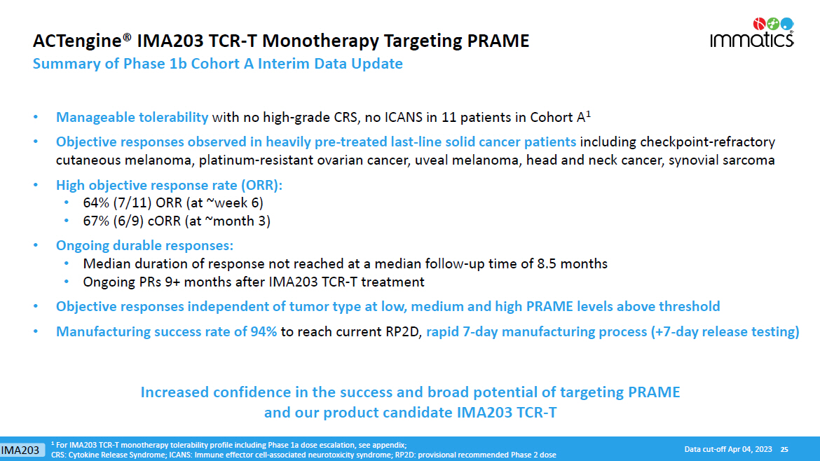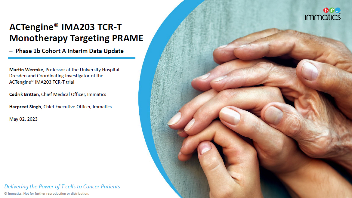 An update on all three IMA203 Phase 1b Cohorts and clinical development path for PRAME TCR-T monotherapy towards registration-directed trials and potential commercialization is planned for 4Q 2023.