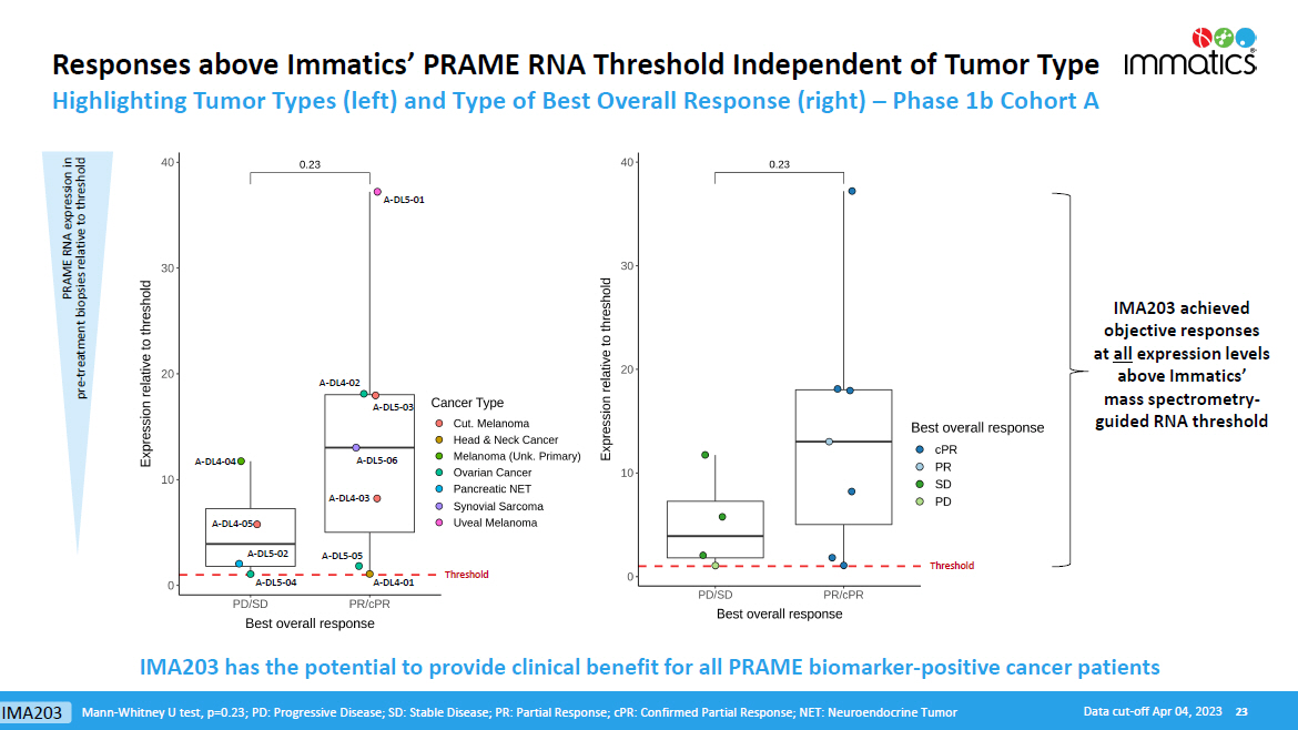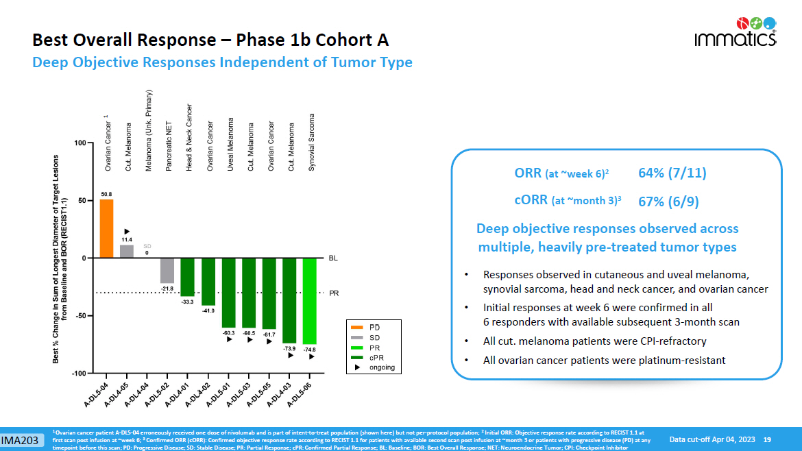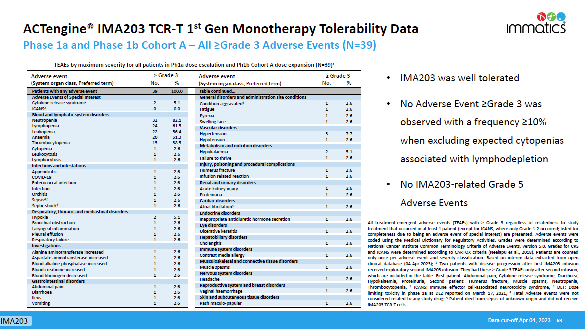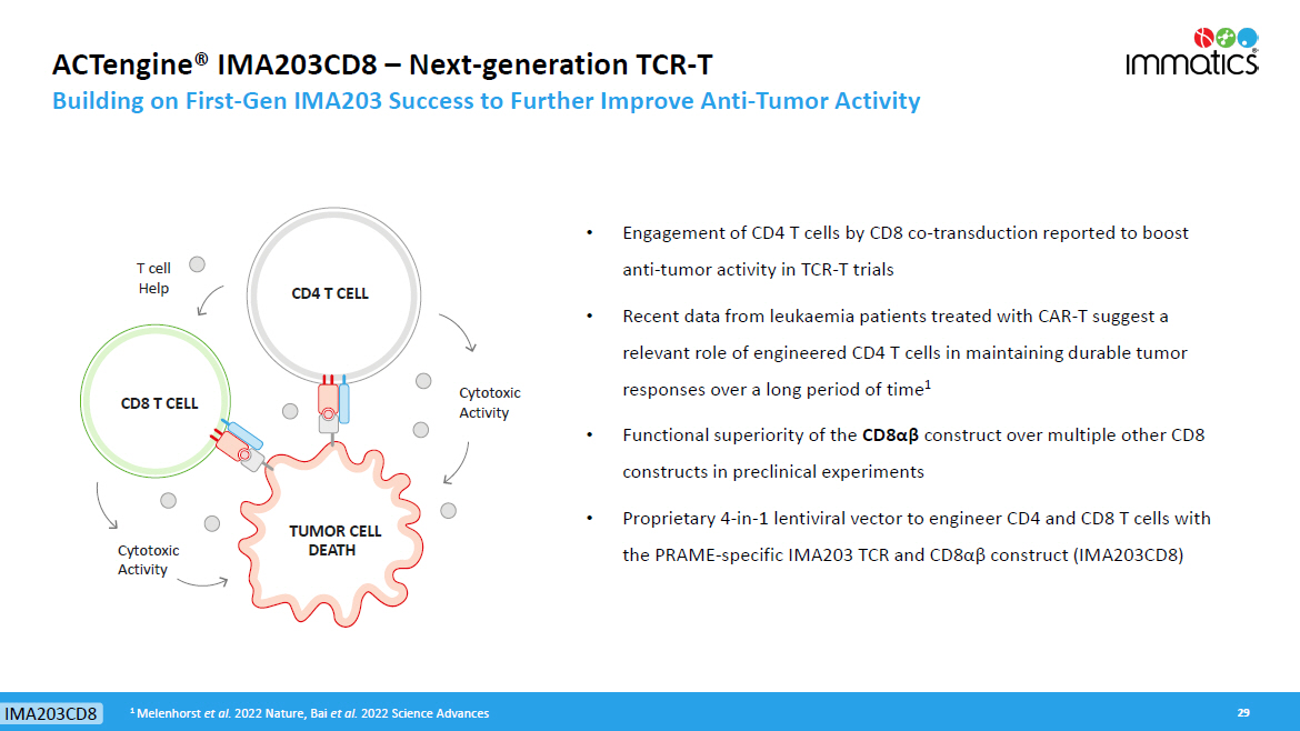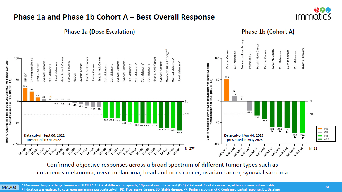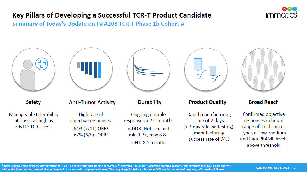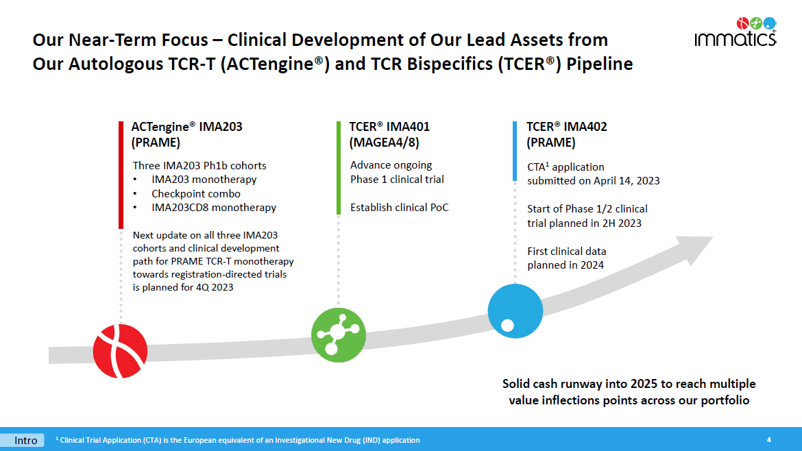 An update on all three IMA203 Phase 1b Cohorts and clinical development path for PRAME TCR-T monotherapy towards registration-directed trials and potential commercialization is planned for 4Q 2023.